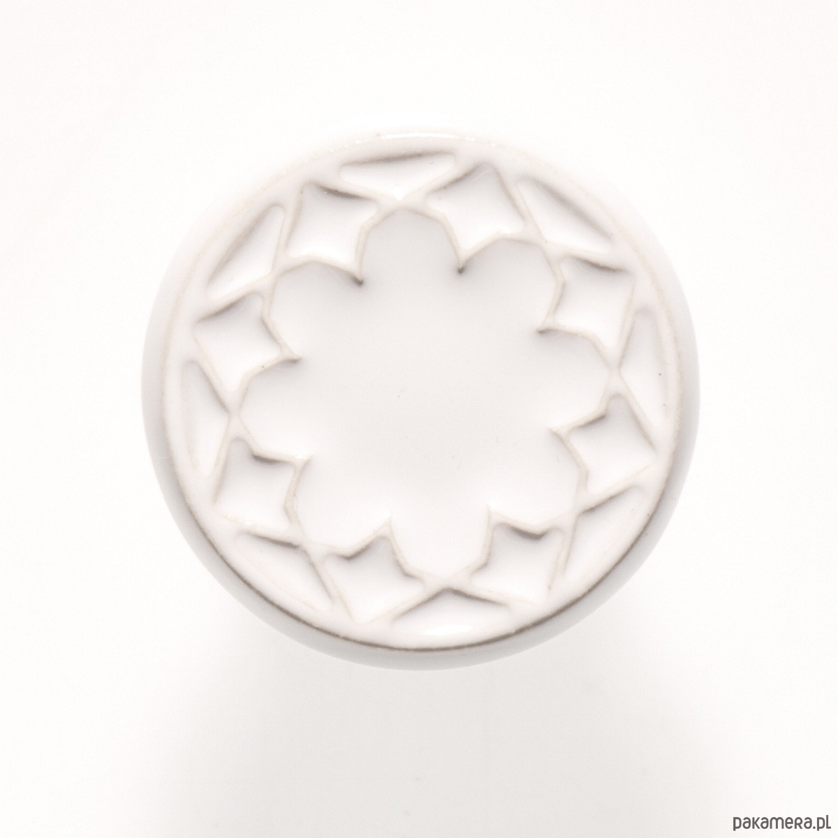 Ceramiczna gałka do mebli - ręcznie wykonana, ornamentowa, wg własnego projektu. Wykonana z jasnej gliny, pokryta błyszczącym szkliwem, wypalona dwukrotnie w wysokiej temperaturze.