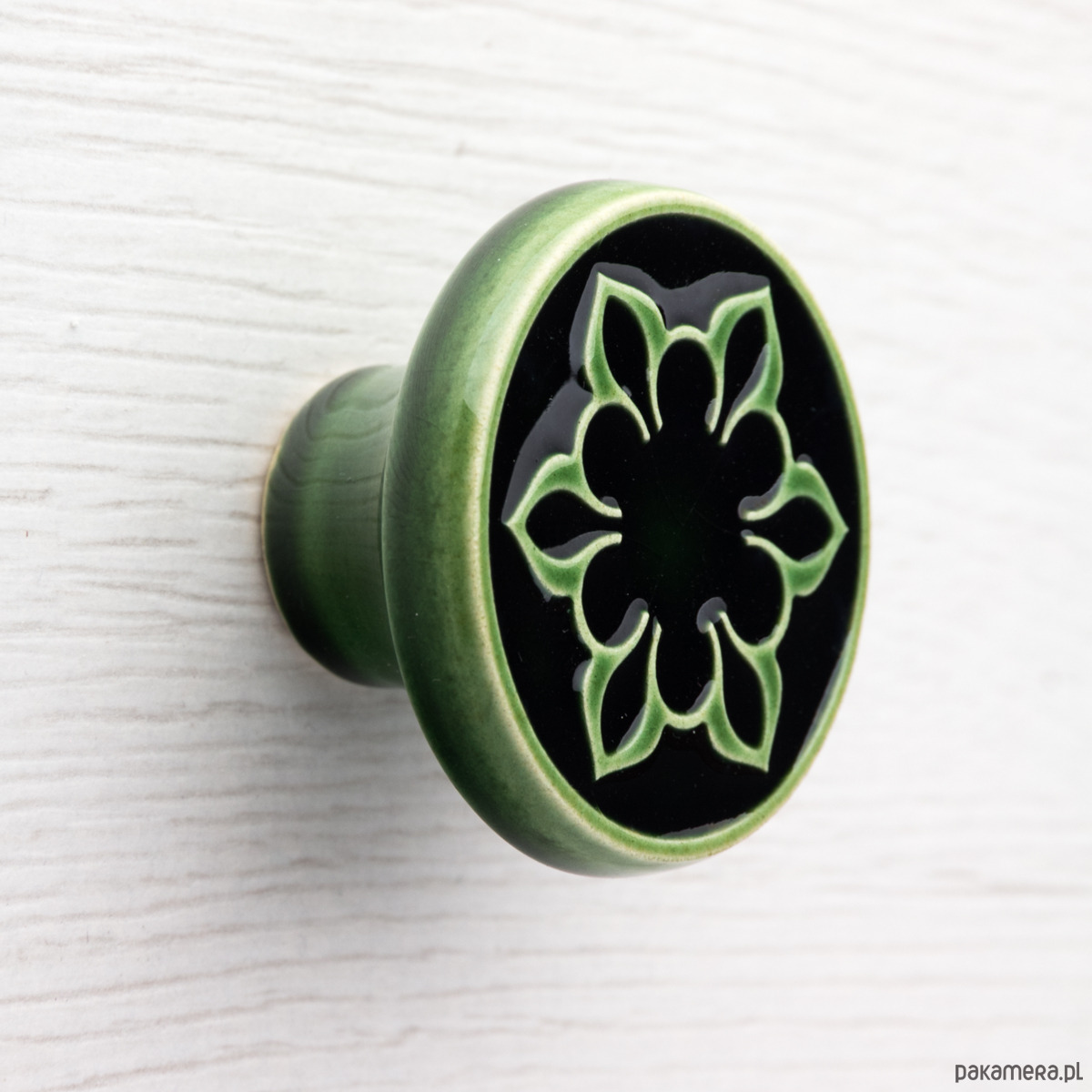 Ceramiczne gałki do mebli - ręcznie wykonane, ornamentowe, wg własnego projektu. Wykonane z jasnej gliny, pokryte błyszczącym, ciemnozielonym szkliwem, wypalone dwukrotnie w wysokiej temperaturze.