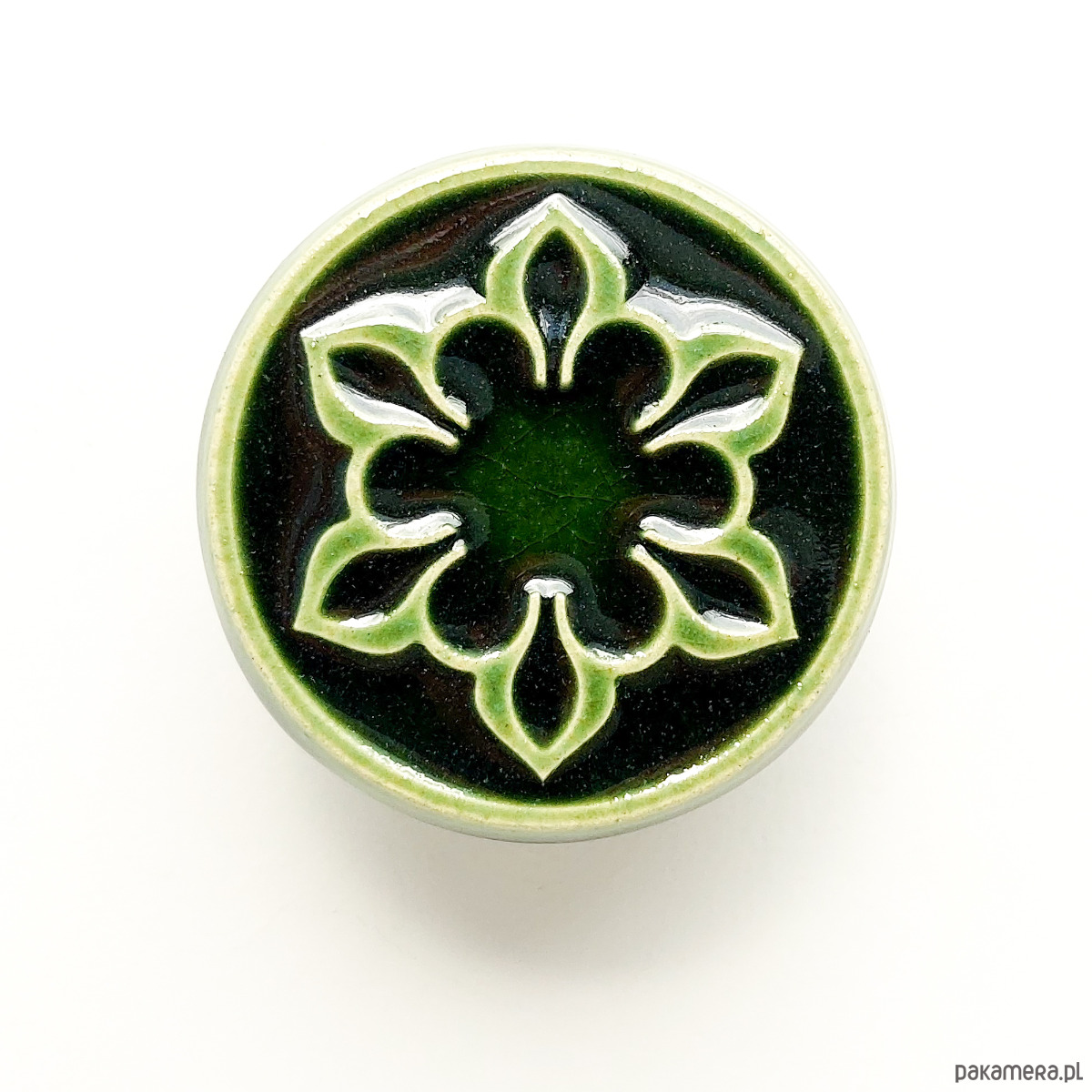 Ceramiczne gałki do mebli - ręcznie wykonane, ornamentowe, wg własnego projektu. Wykonane z jasnej gliny, pokryte błyszczącym, ciemnozielonym szkliwem, wypalone dwukrotnie w wysokiej temperaturze. Twoje meble zyskają nowy, niepowtarzalny, jedyny w swoim rodzaju wygląd.