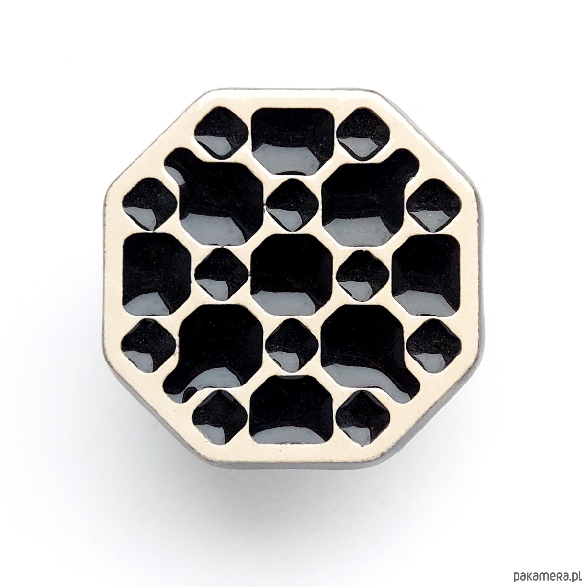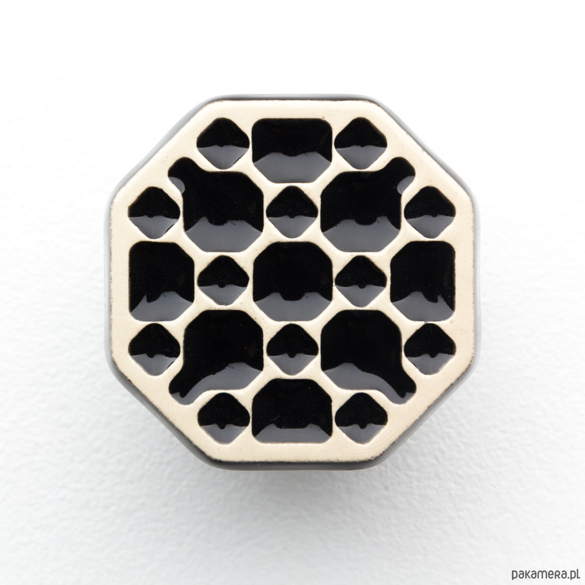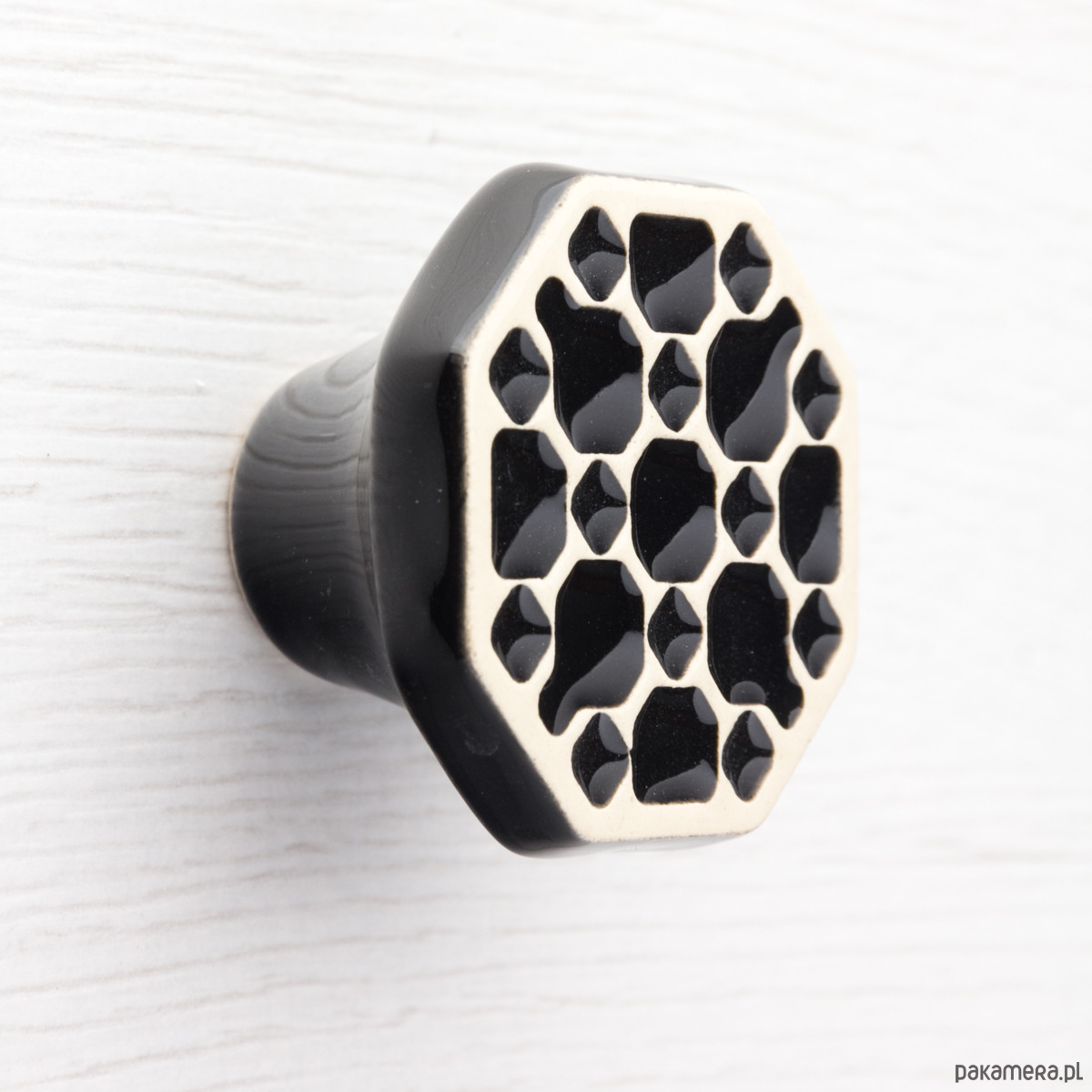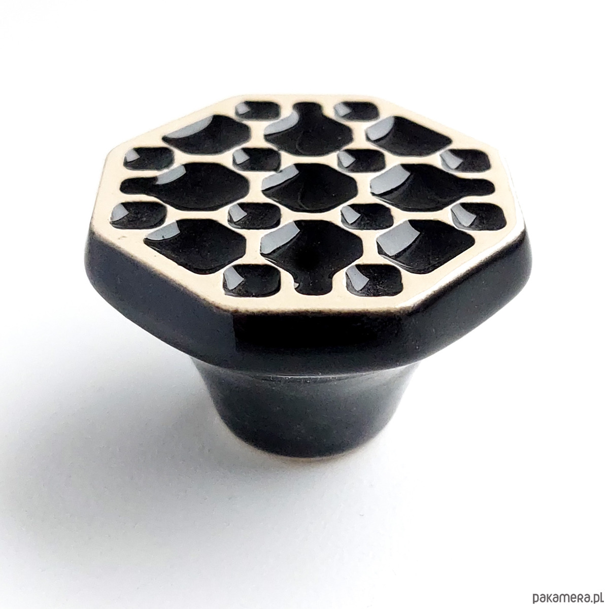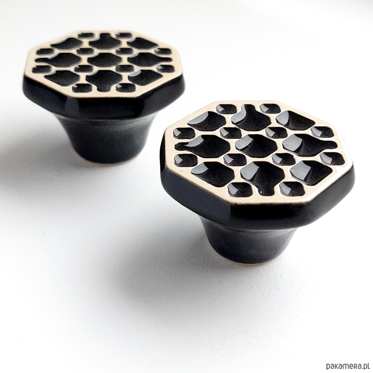 Ceramiczne gałki do mebli z lekko wypukłym ornamentem. Ręcznie wykonane z jasnej gliny, pokryte błyszczącym szkliwem, wypalone dwukrotnie w wysokiej temperaturze.