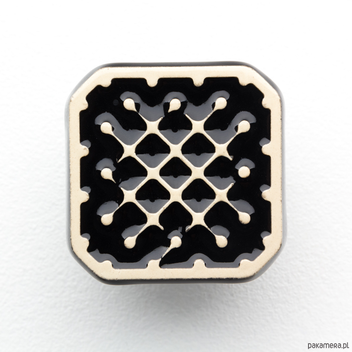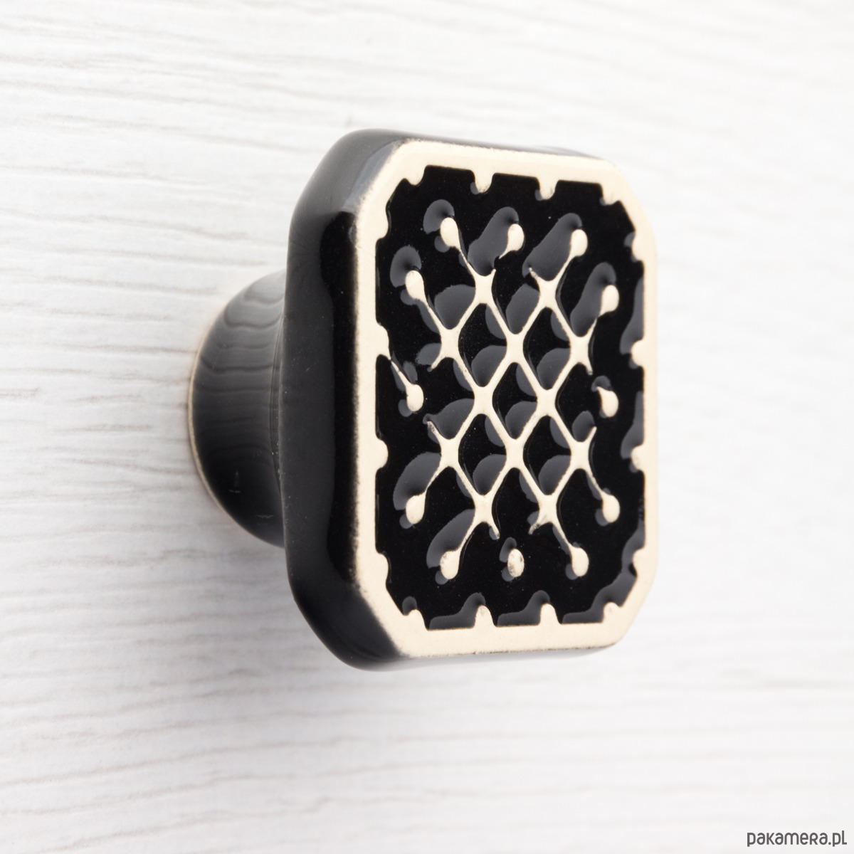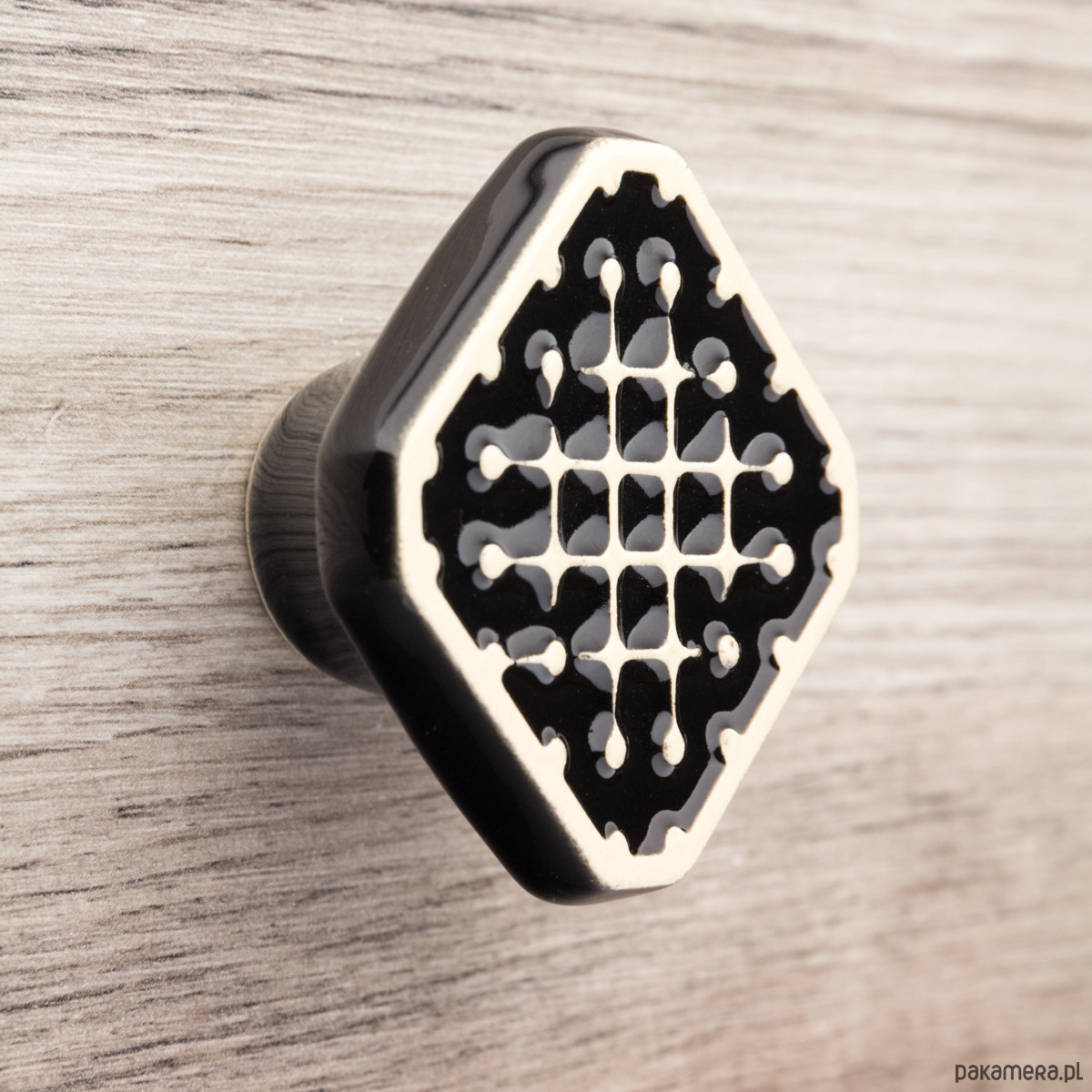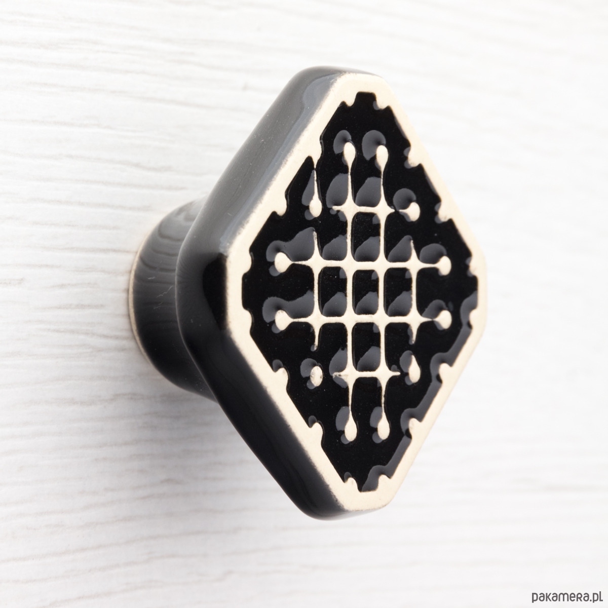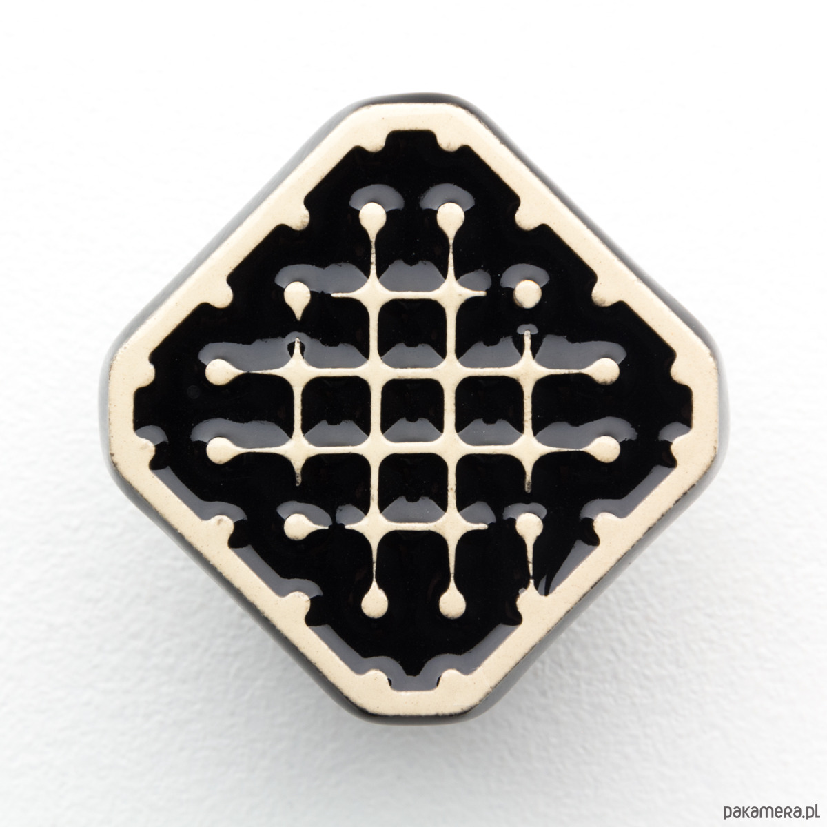 Ceramiczne gałki do mebli z lekko wypukłym ornamentem. Ręcznie wykonane z jasnej gliny, pokryte błyszczącym szkliwem, wypalone dwukrotnie w wysokiej temperaturze.