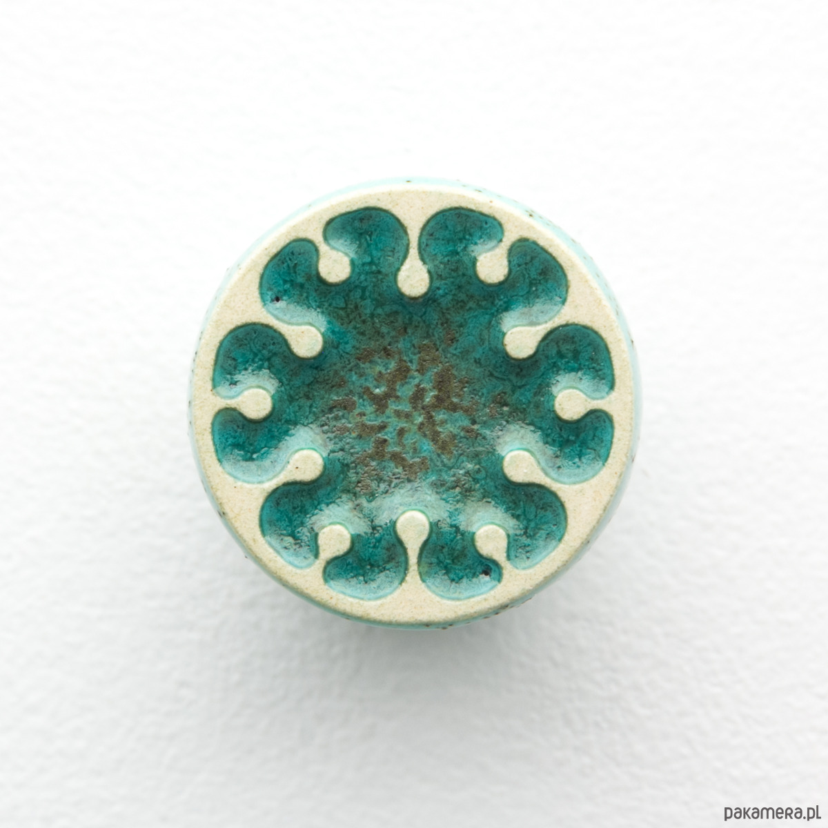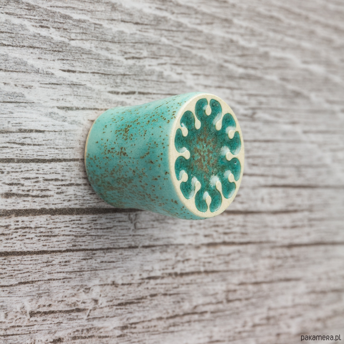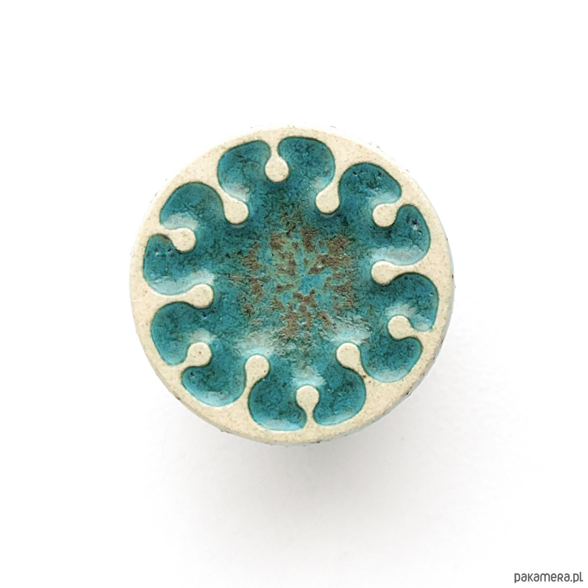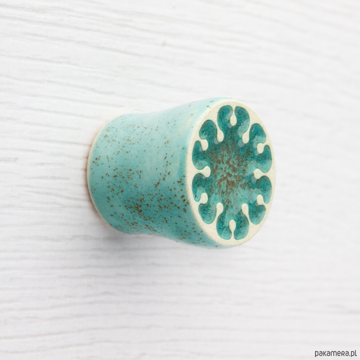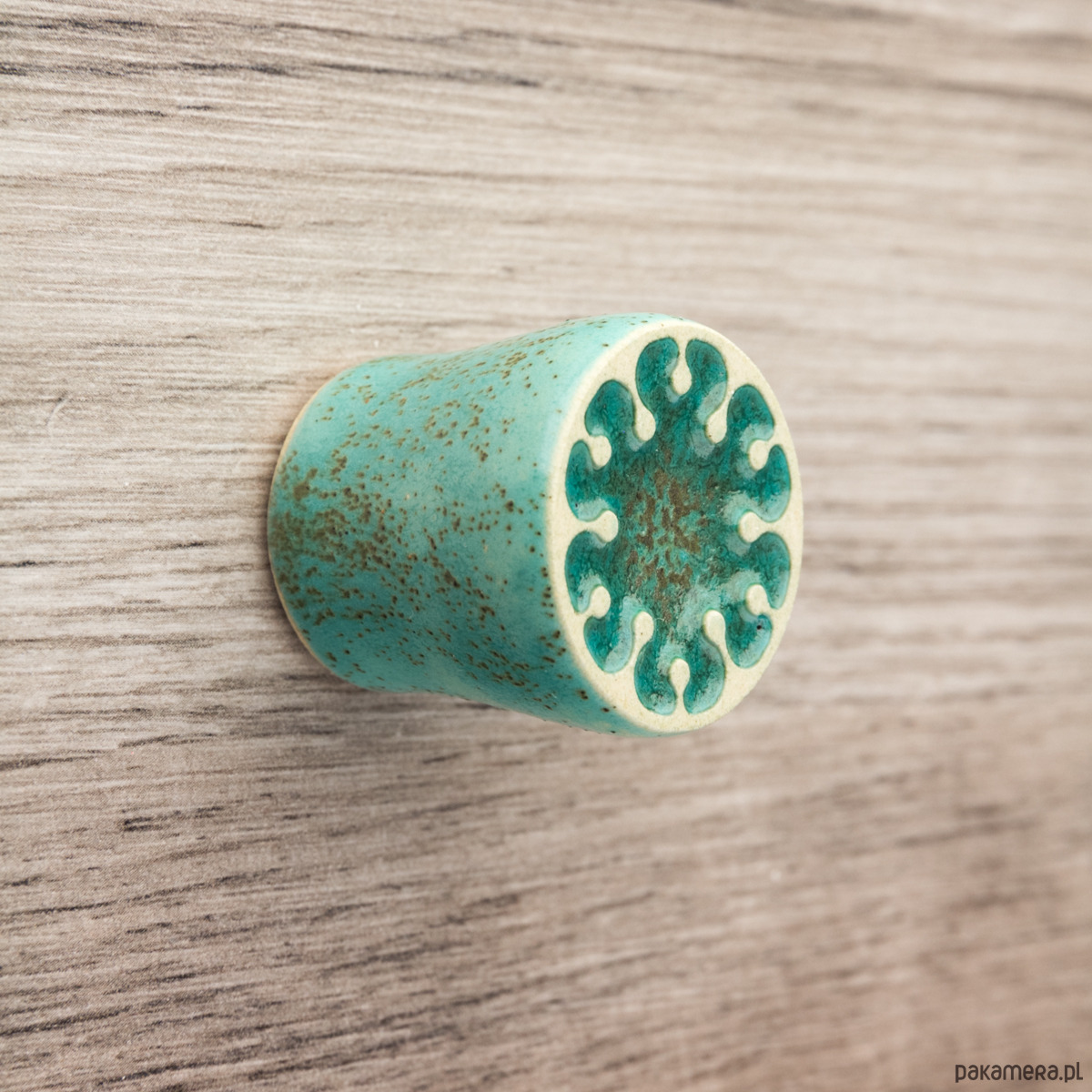 Ceramiczna gałka do mebli z lekko wypukłym ornamentem. Ręcznie wykonana z jasnej gliny, pokryta szkliwem o satynowym połysku, wypalona dwukrotnie w wysokiej temperaturze.