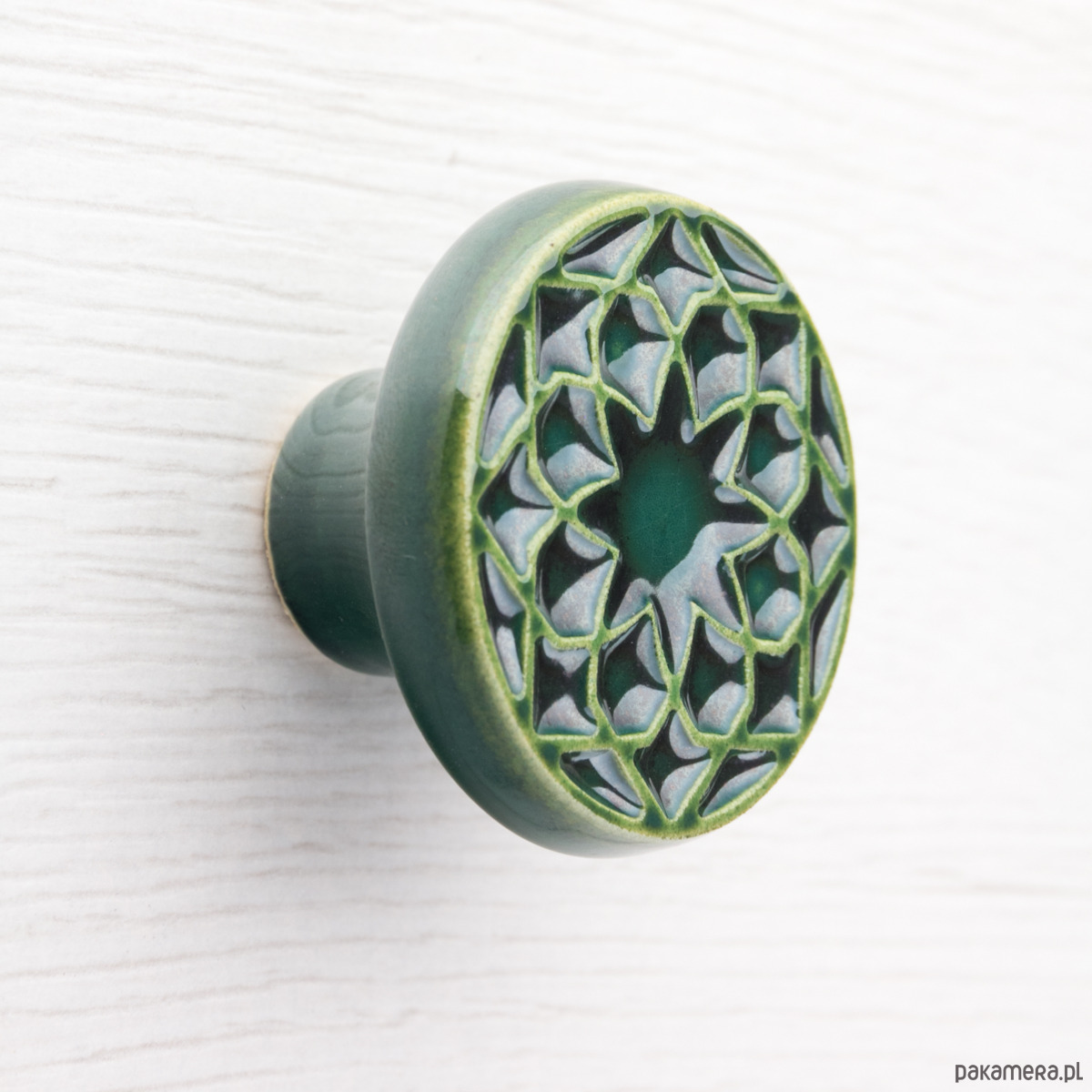 Ceramiczna gałka do mebli z lekko wypukłym ornamentem. Ręcznie wykonana z jasnej gliny, pokryta błyszczącym szkliwem, wypalona dwukrotnie w wysokiej temperaturze. Twoje meble zyskają nowy, niepowtarzalny, jedyny w swoim rodzaju wygląd.