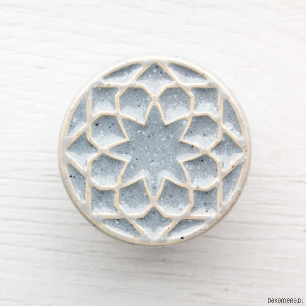 Ceramiczne gałki do mebli - ręcznie wykonane, ornamentowe, wg własnego projektu. Wykonane z jasnej gliny, pokryte błyszczącym szkliwem, wypalone dwukrotnie w wysokiej temperaturze.