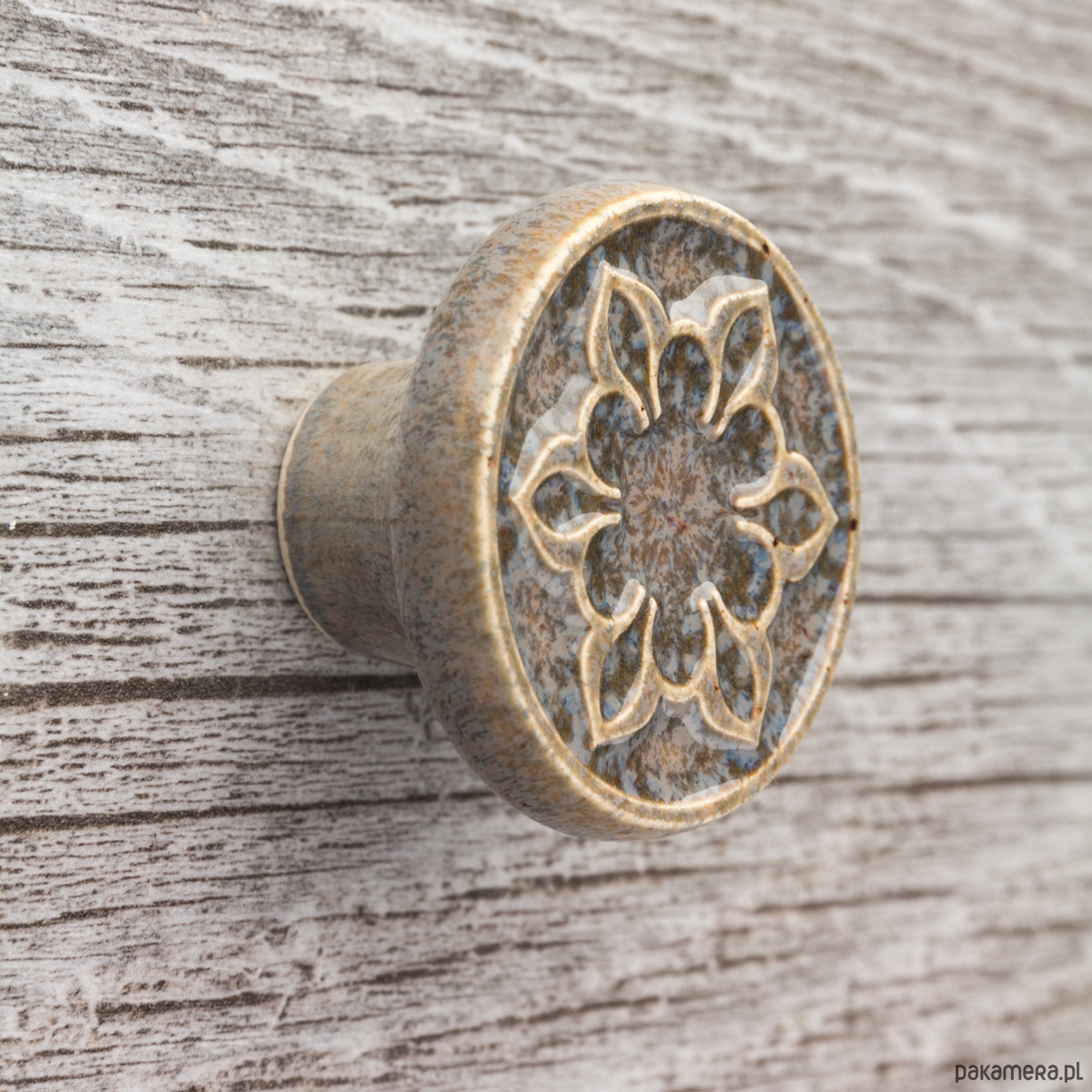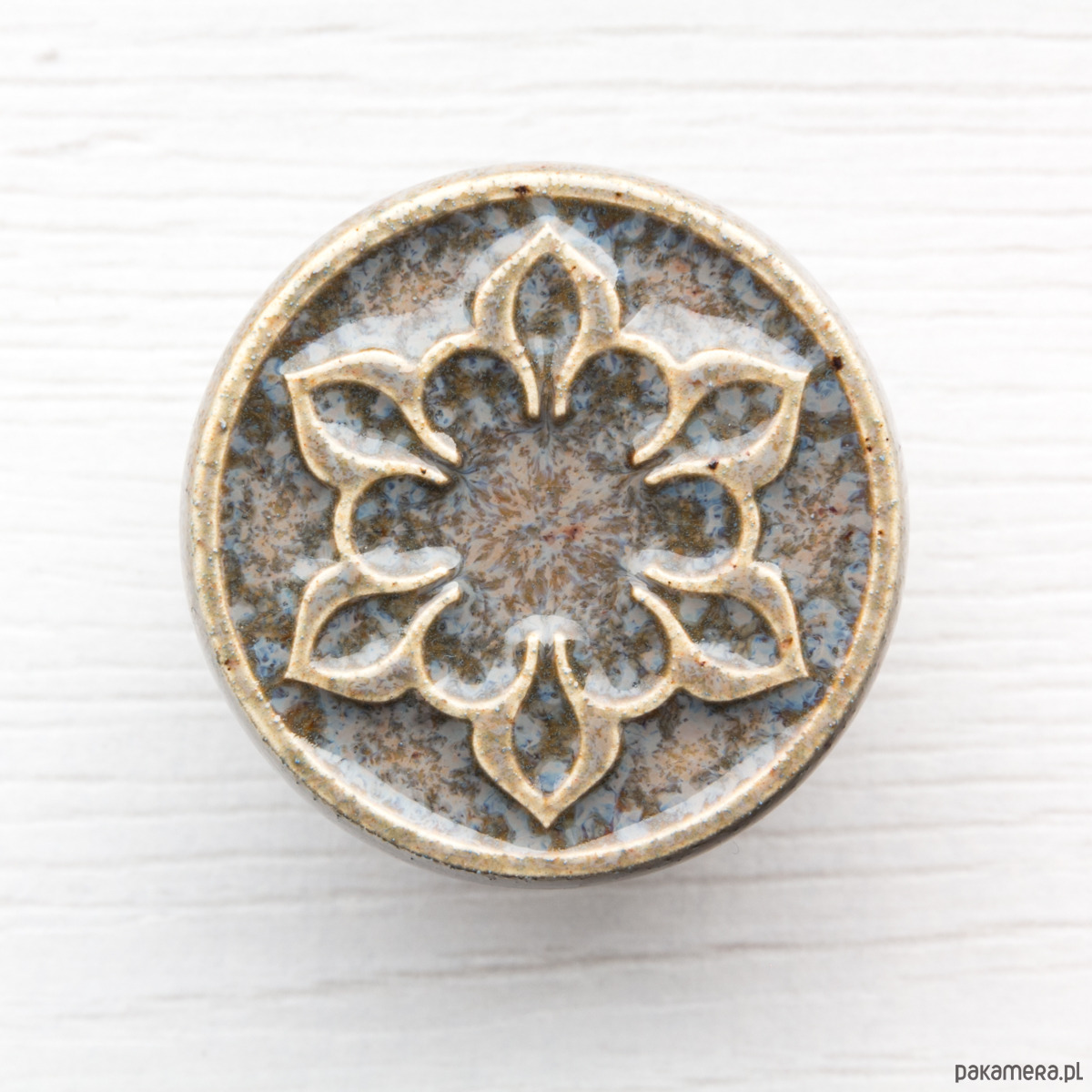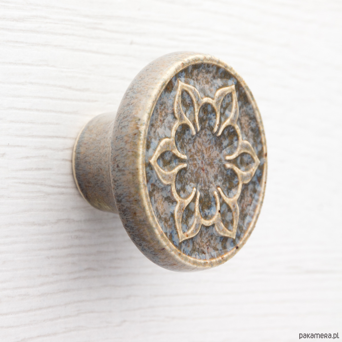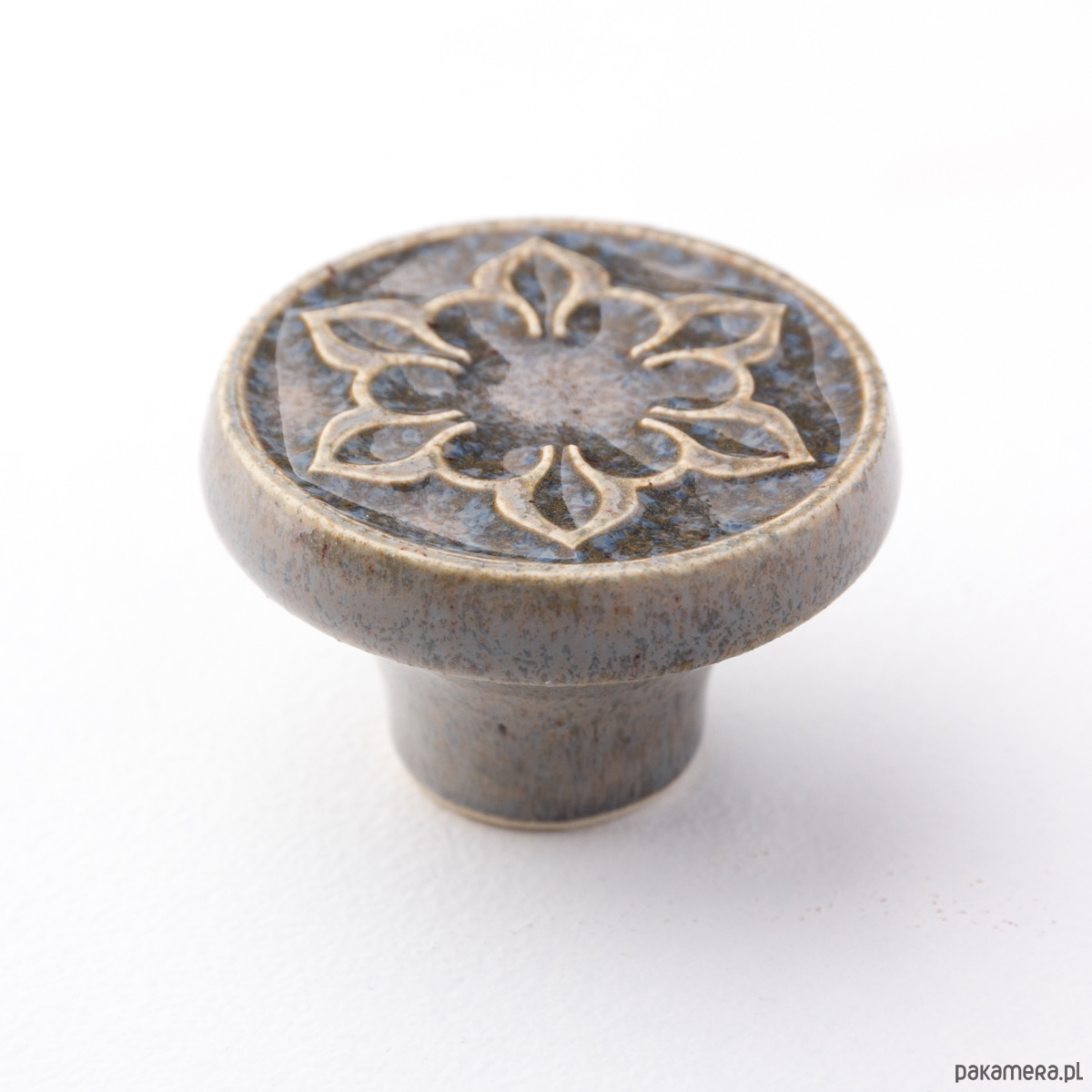 Ceramiczne gałki do mebli - ręcznie wykonane, ornamentowe, wg własnego projektu. Wykonane z jasnej gliny, pokryte błyszczącym szkliwem, wypalone dwukrotnie w wysokiej temperaturze.