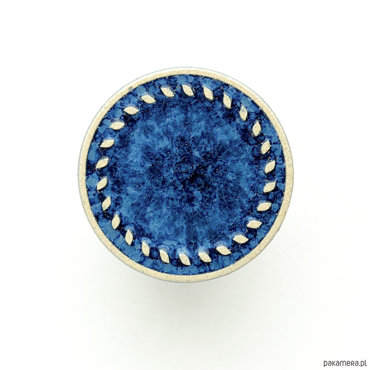 Ceramiczna gałka do mebli z lekko wypukłym ornamentem. Ręcznie wykonana z jasnej gliny, pokryta błyszczącym, szkliwem, wypalona dwukrotnie w wysokiej temperaturze.