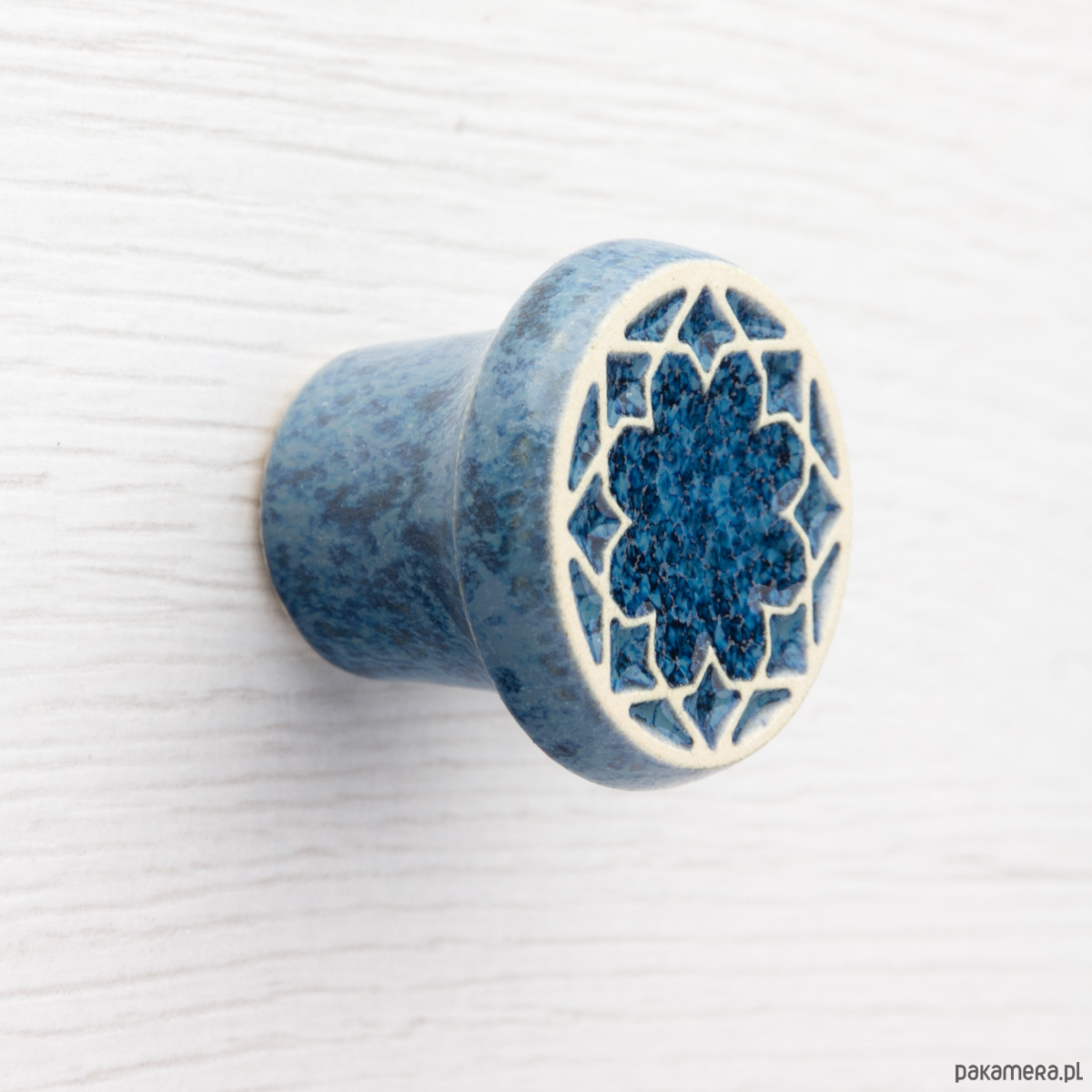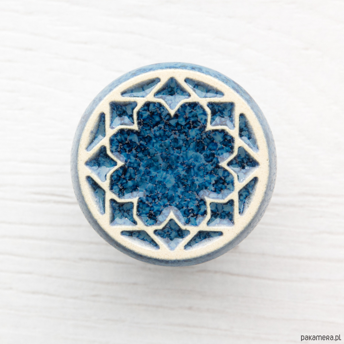 Ceramiczna gałka do mebli - ręcznie wykonana, ornamentowa, wg własnego projektu. Wykonana z jasnej gliny, pokryta błyszczącym szkliwem, wypalona dwukrotnie w wysokiej temperaturze.