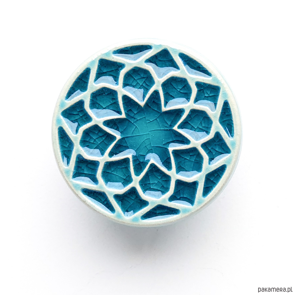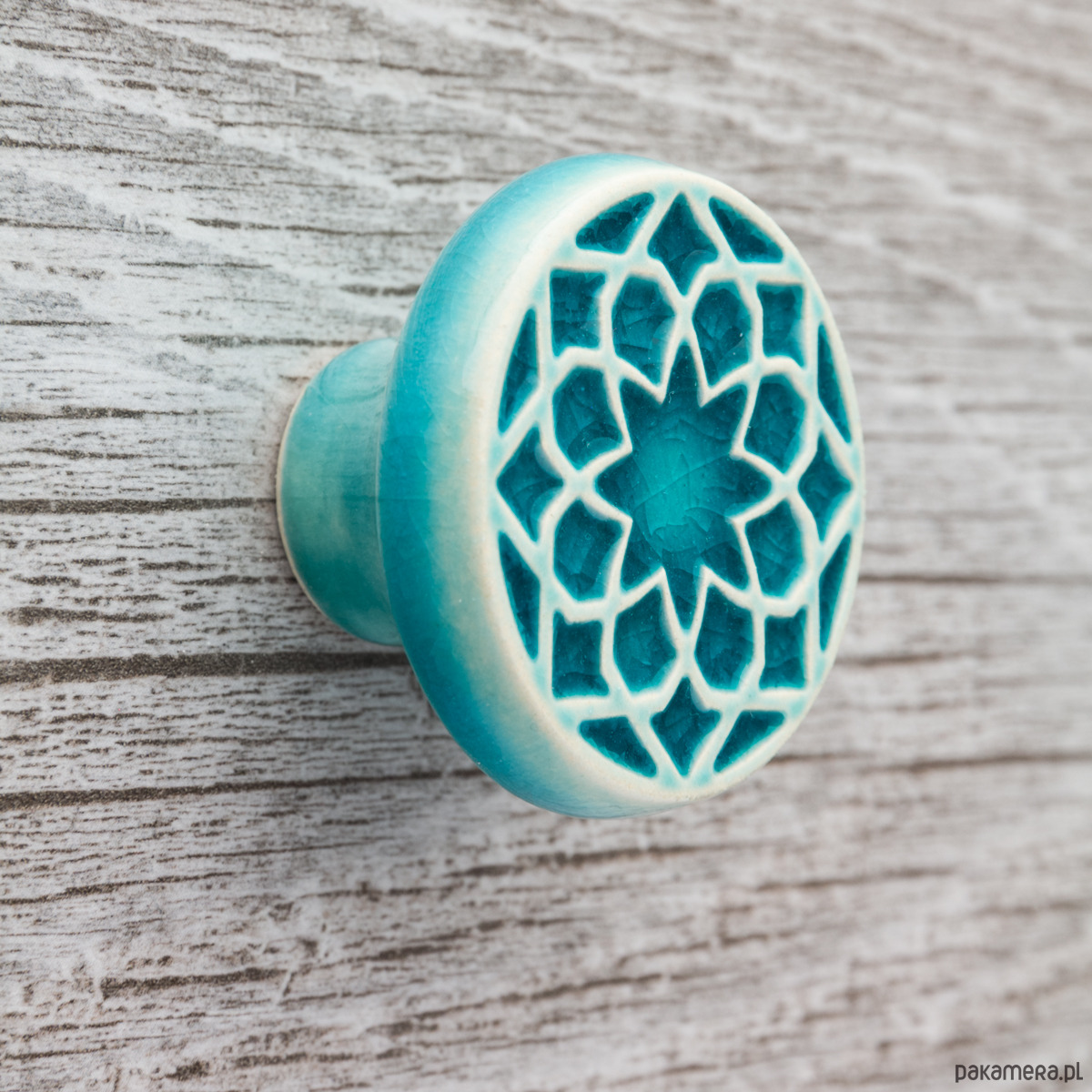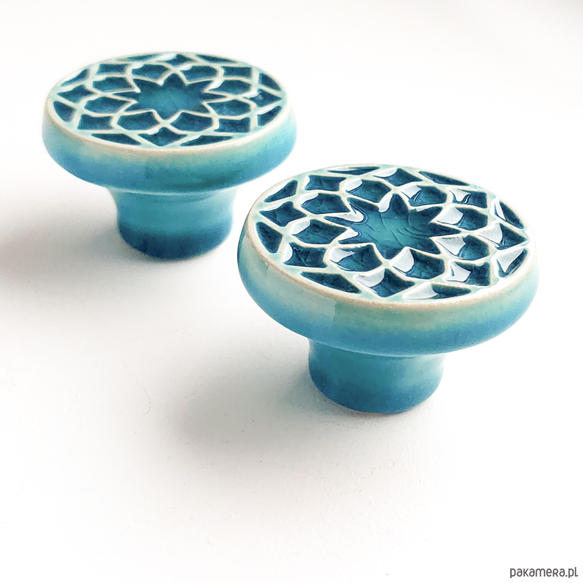 Ceramiczne gałki do mebli - ręcznie wykonane, ornamentowe, wg własnego projektu. Wykonane z jasnej gliny, pokryte błyszczącym, turkusowym szkliwem, wypalone dwukrotnie w wysokiej temperaturze.