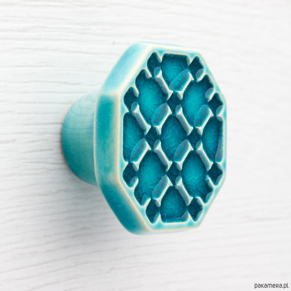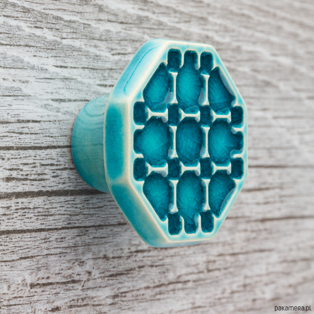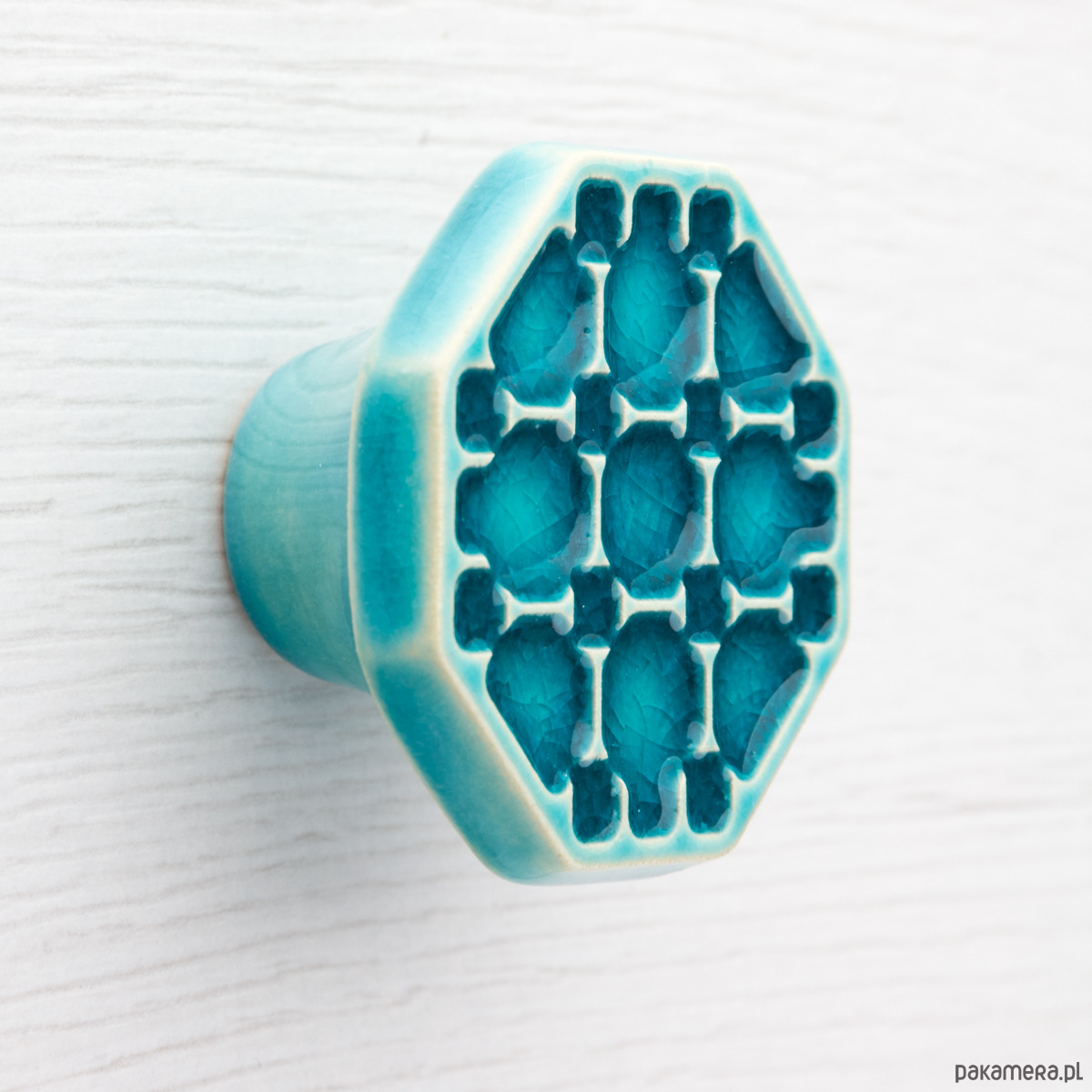 Ceramiczne gałki do mebli - ręcznie wykonane, ornamentowe, wg własnego projektu. Wykonane z jasnej gliny, pokryte błyszczącym szkliwem, wypalone dwukrotnie w wysokiej temperaturze.