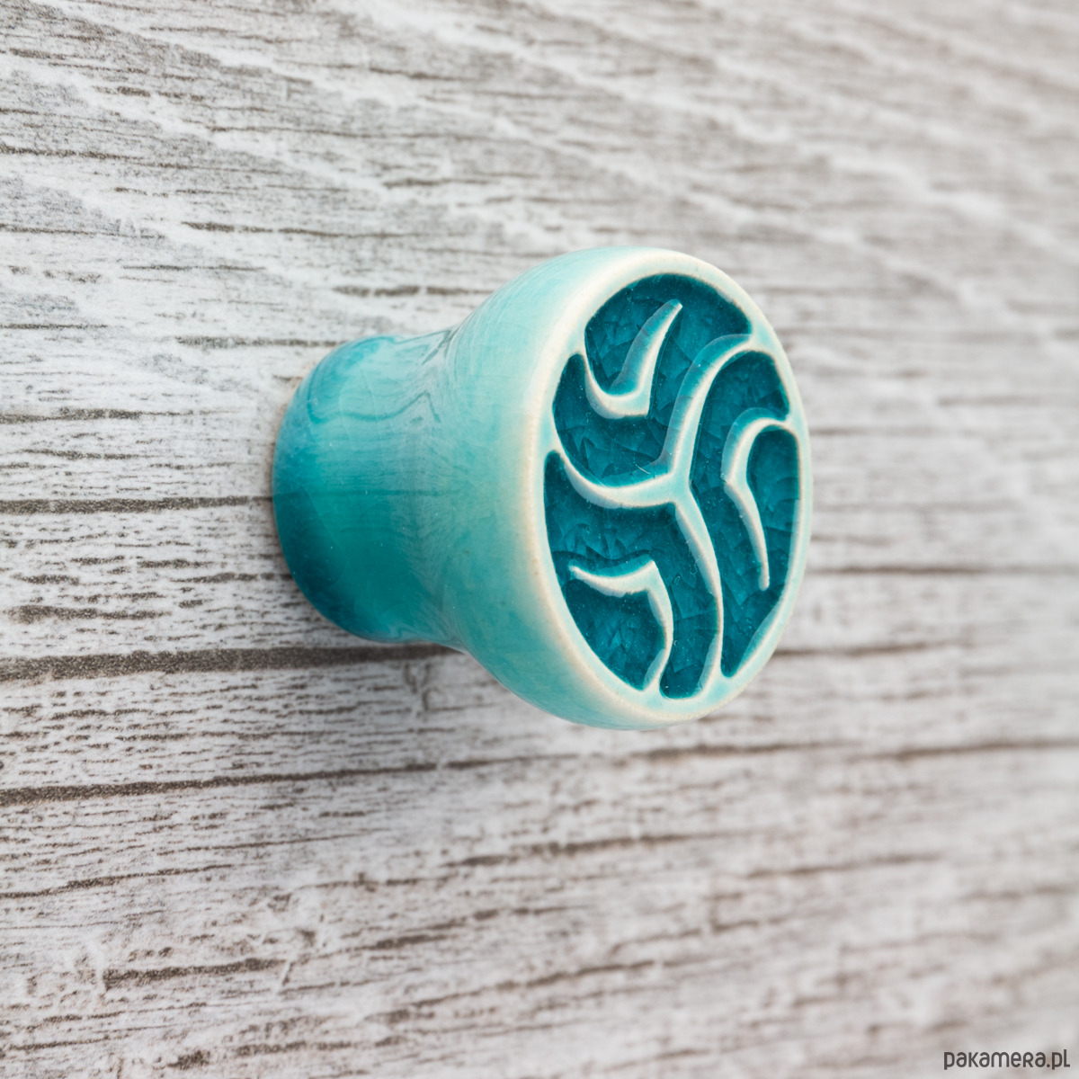 Ceramiczne gałki do mebli - ręcznie wykonane, ornamentowe, wg własnego projektu. Wykonane z jasnej gliny, pokryte błyszczącym, szkliwem, wypalone dwukrotnie w wysokiej temperaturze.