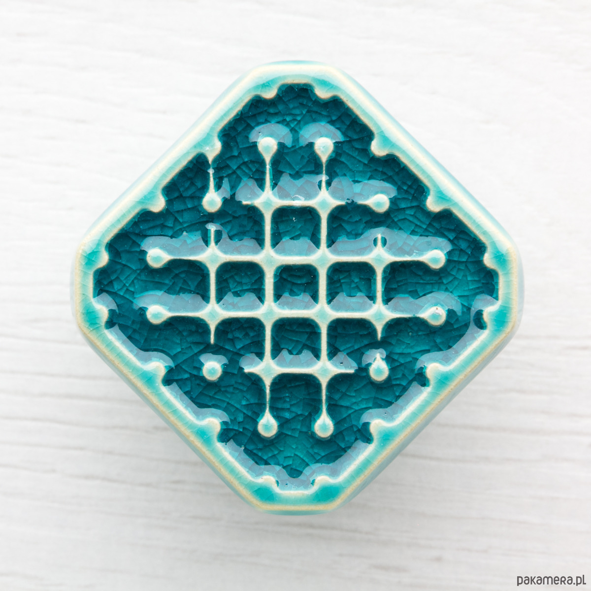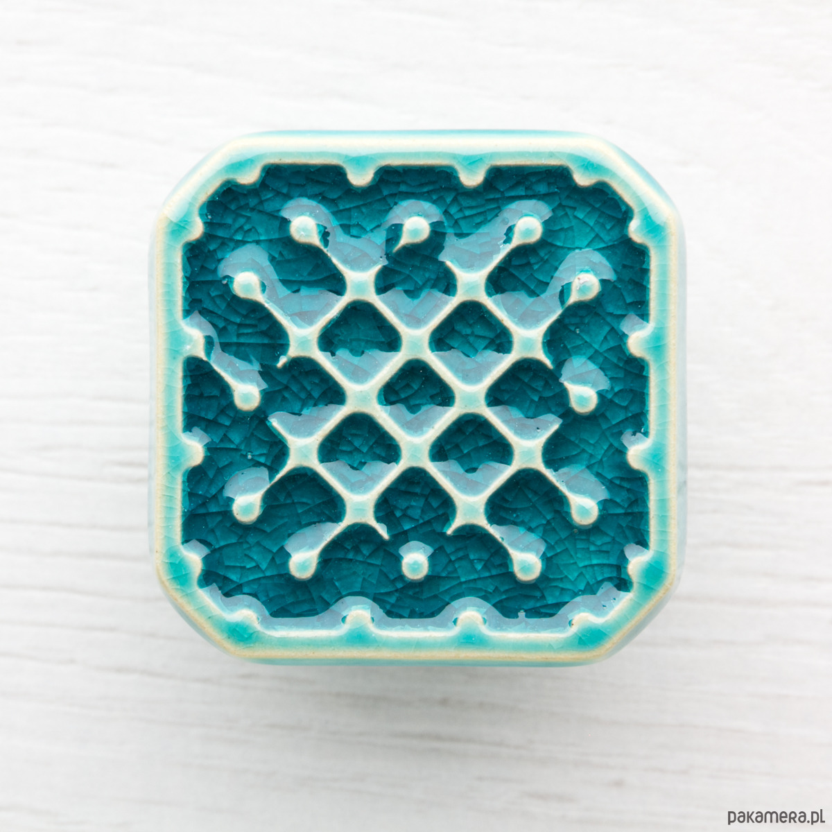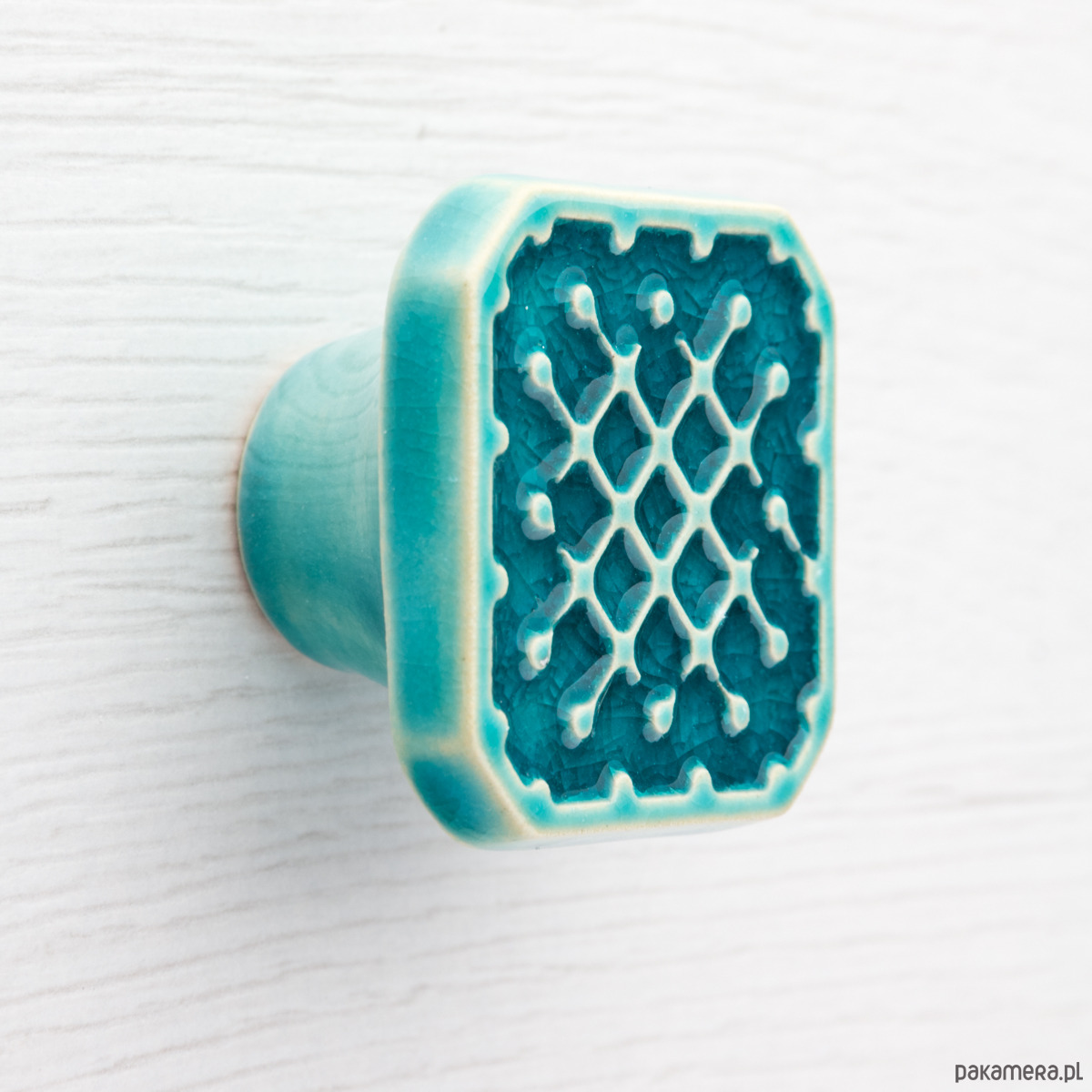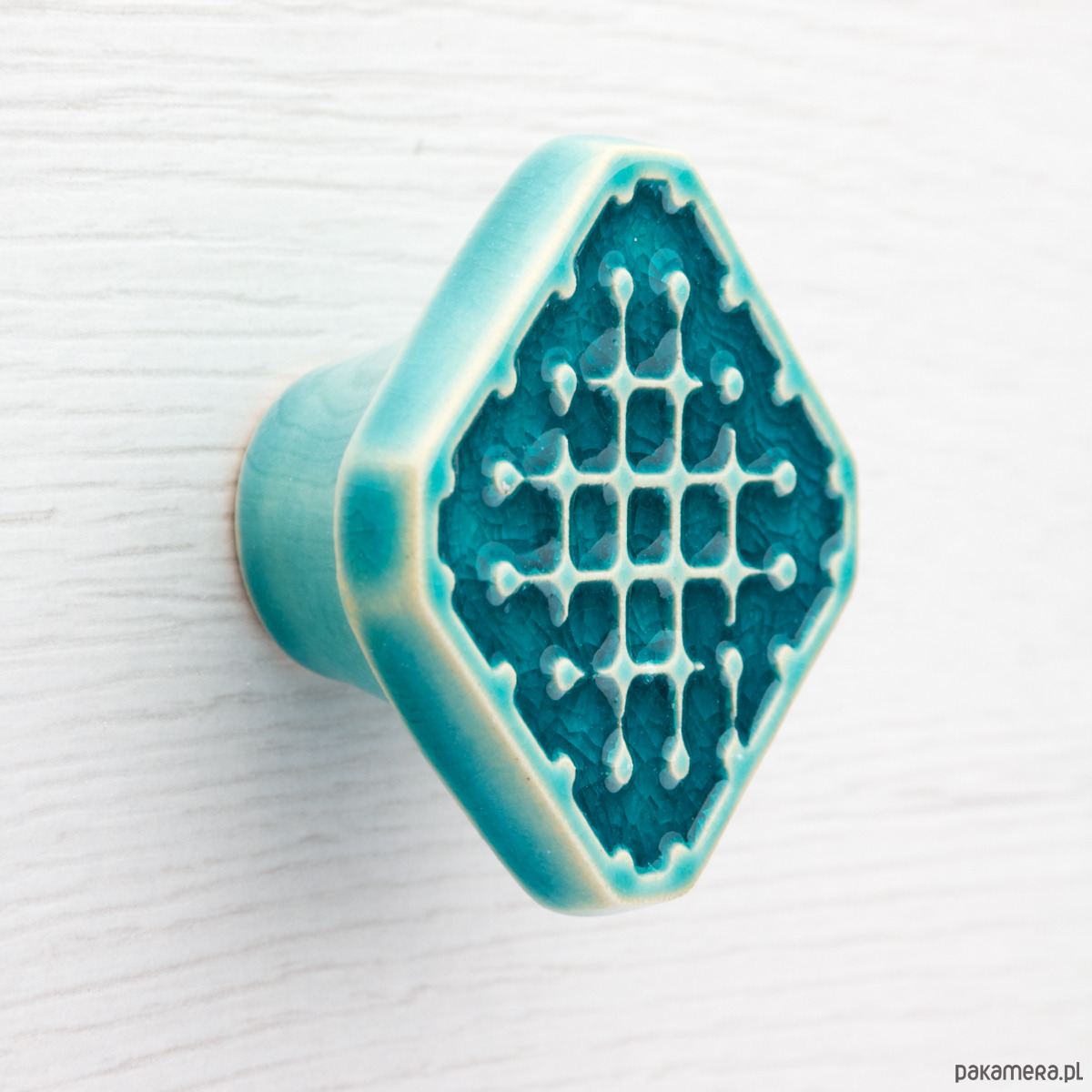 Ceramiczne gałki do mebli - ręcznie wykonane, ornamentowe, wg własnego projektu. Wykonane z jasnej gliny, pokryte błyszczącym, turkusowym szkliwem, wypalone dwukrotnie w wysokiej temperaturze.