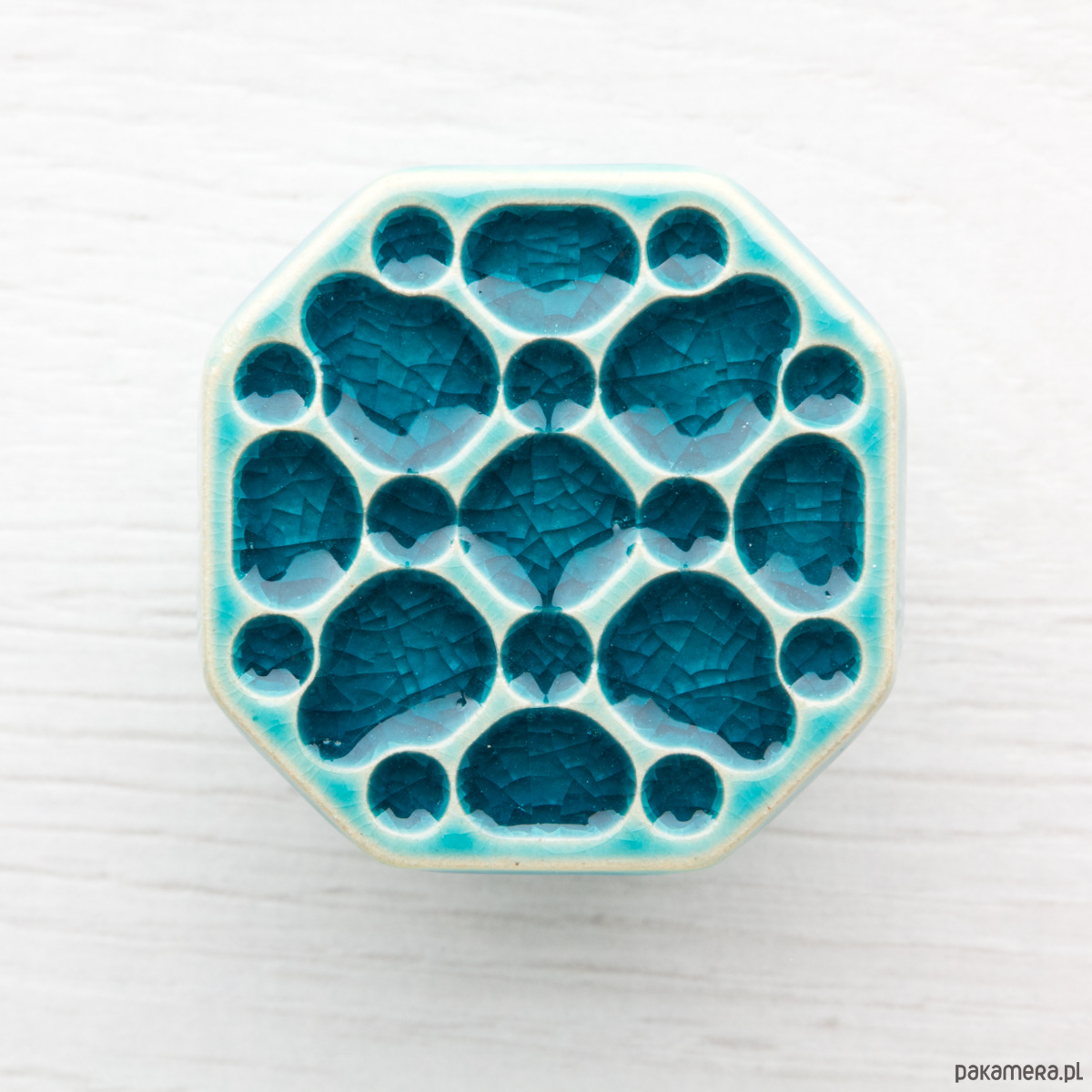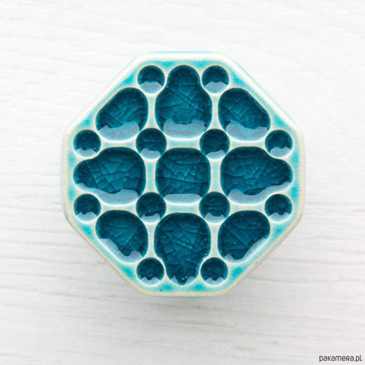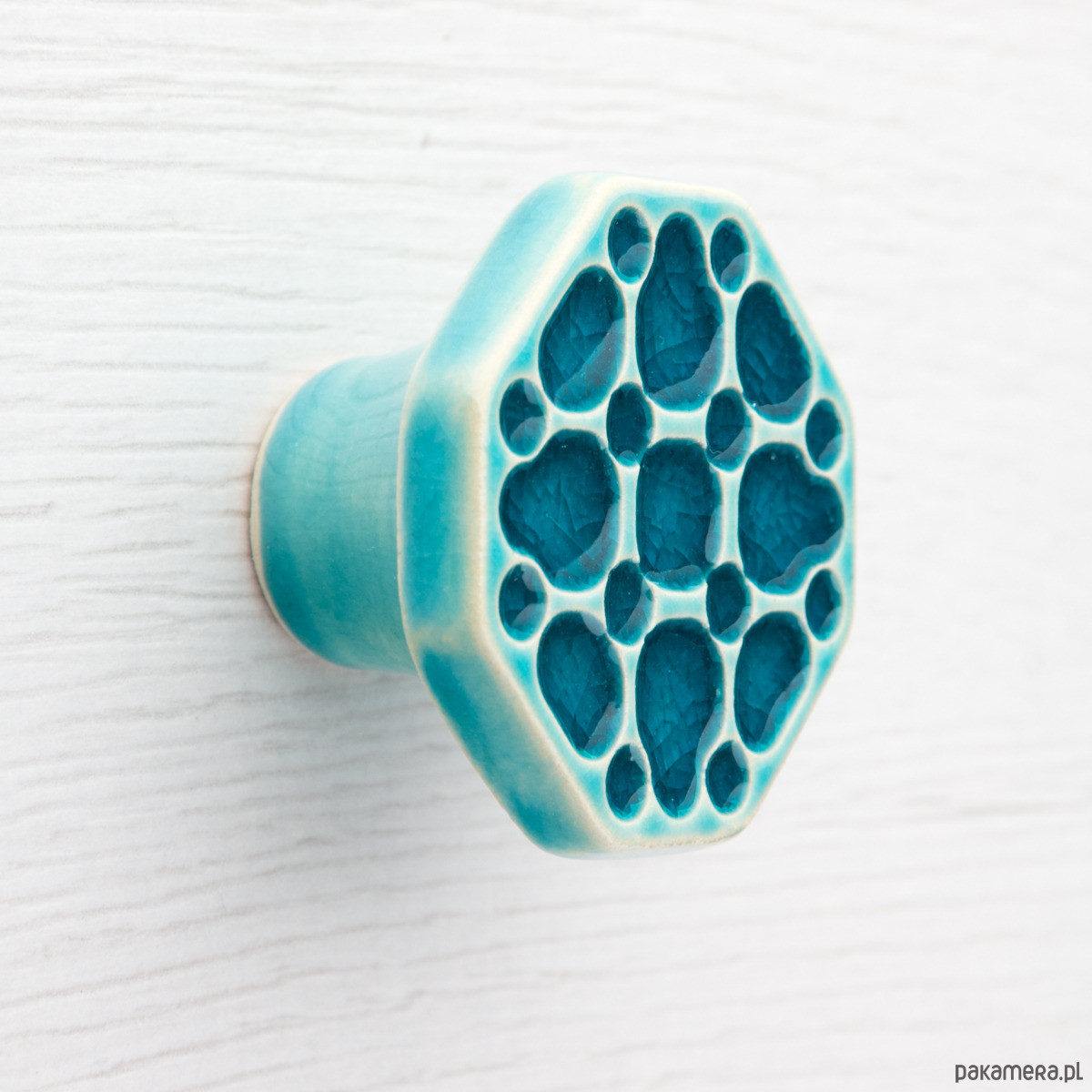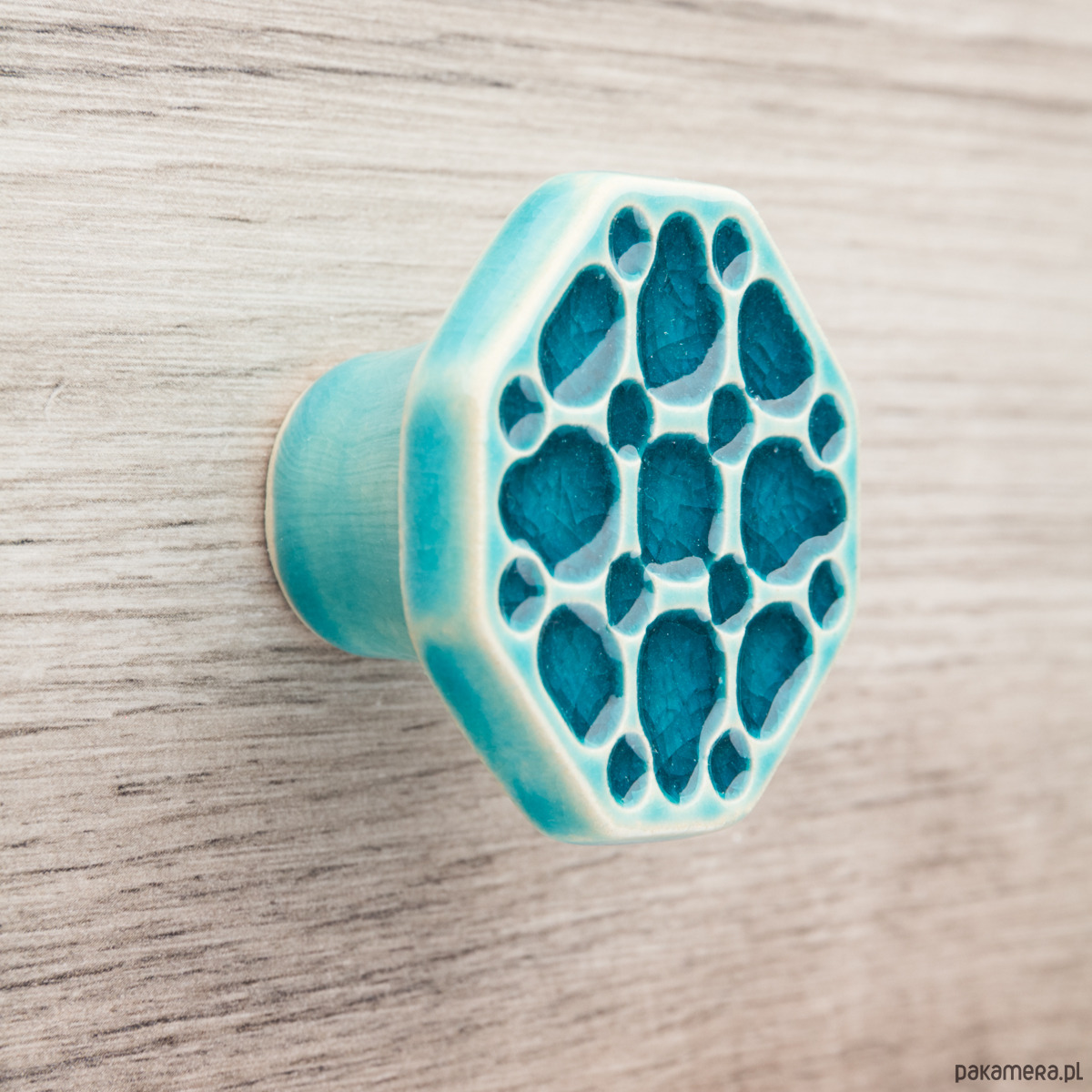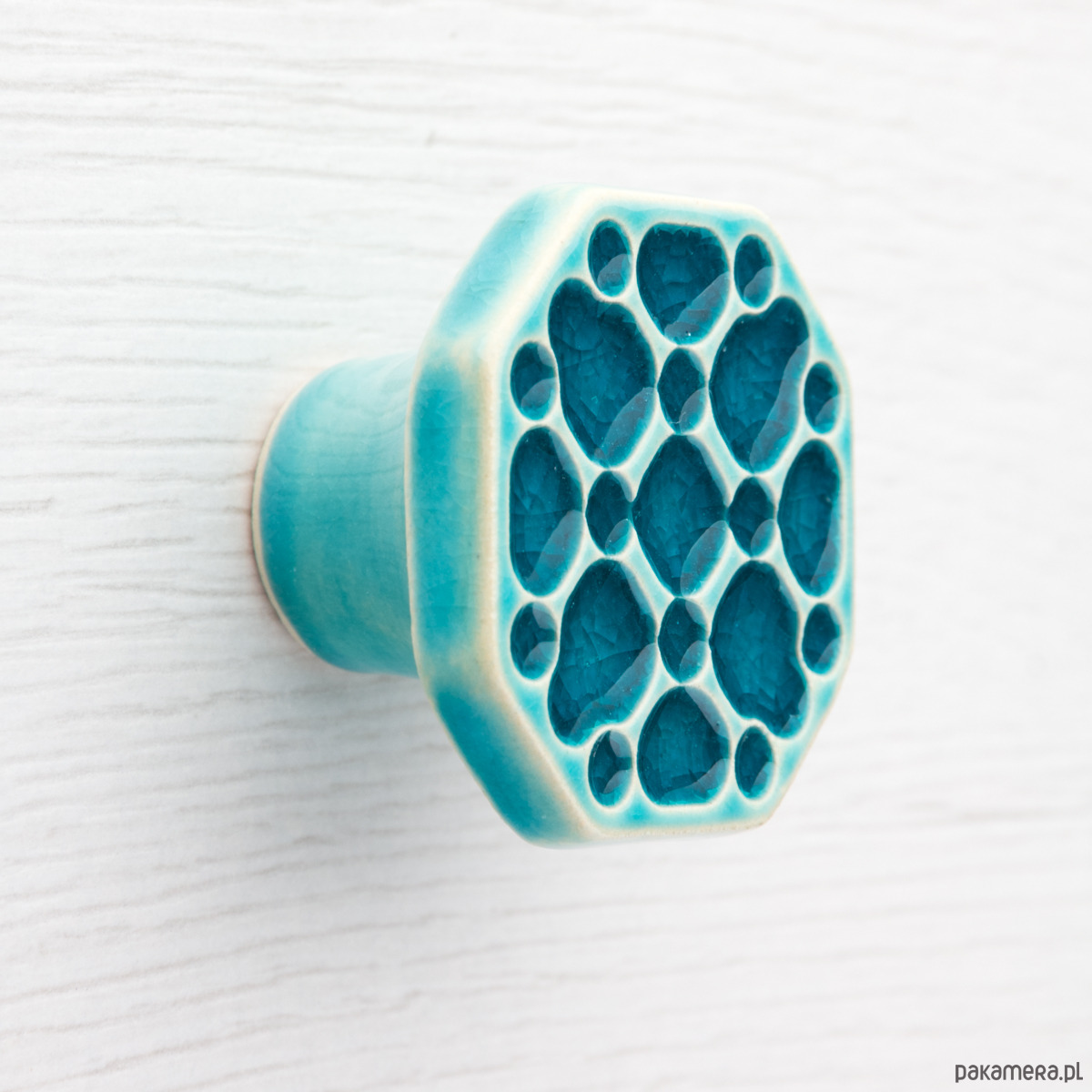 Ceramiczna gałka do mebli – ręcznie wykonana, ornamentowa, wg własnego projektu. Wykonana z jasnej gliny, pokryta błyszczącym, turkusowym szkliwem. Twoje meble zyskają nowy, niepowtarzalny, jedyny w swoim rodzaju wygląd.