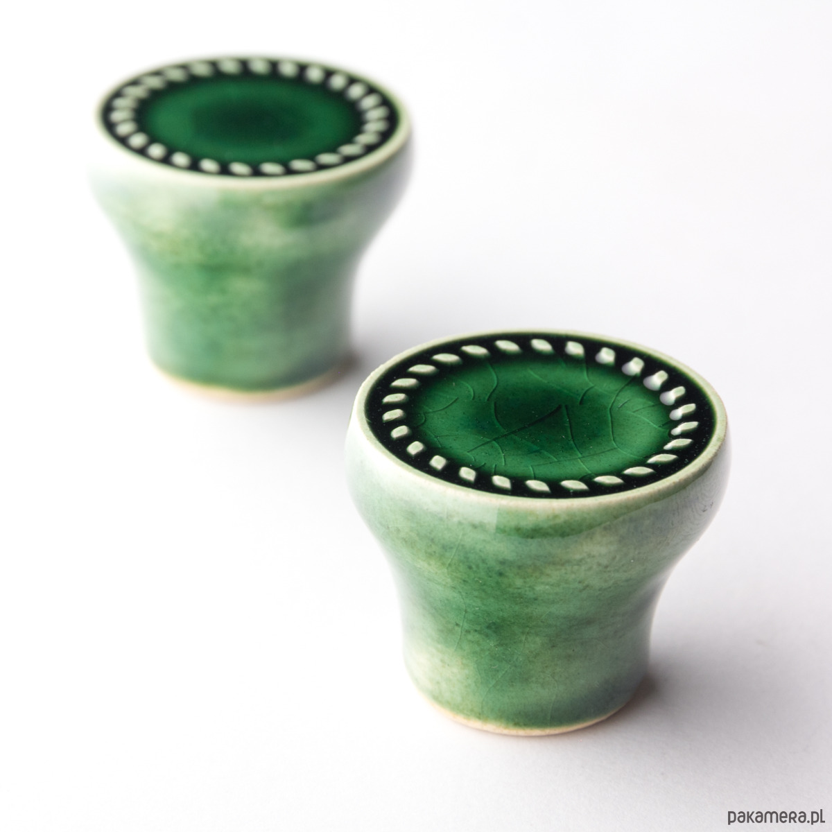 Ceramiczne gałki do mebli - ręcznie wykonane, ornamentowe, wg własnego projektu. Wykonane z jasnej gliny, pokryte błyszczącym, szkliwem, wypalone dwukrotnie w wysokiej temperaturze.