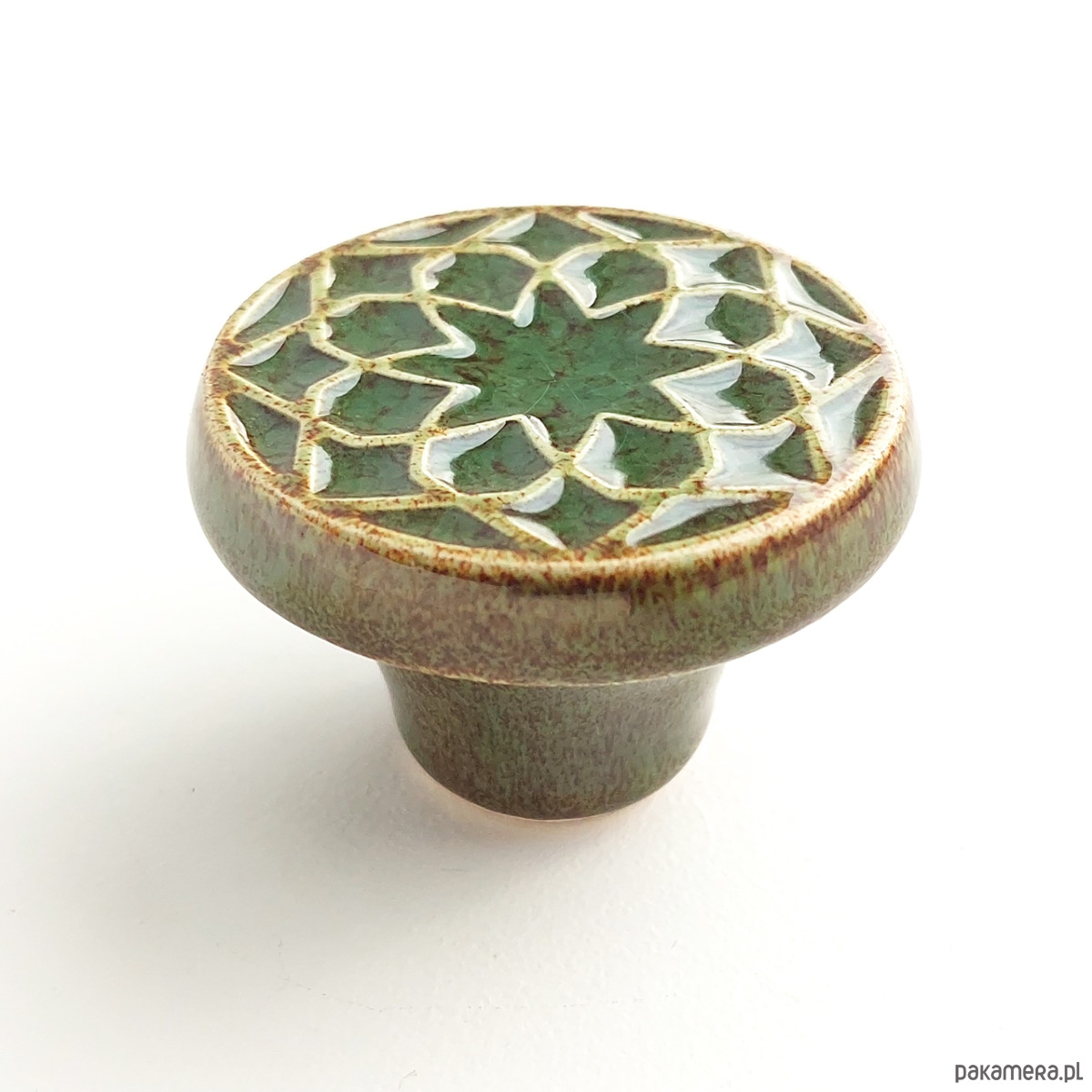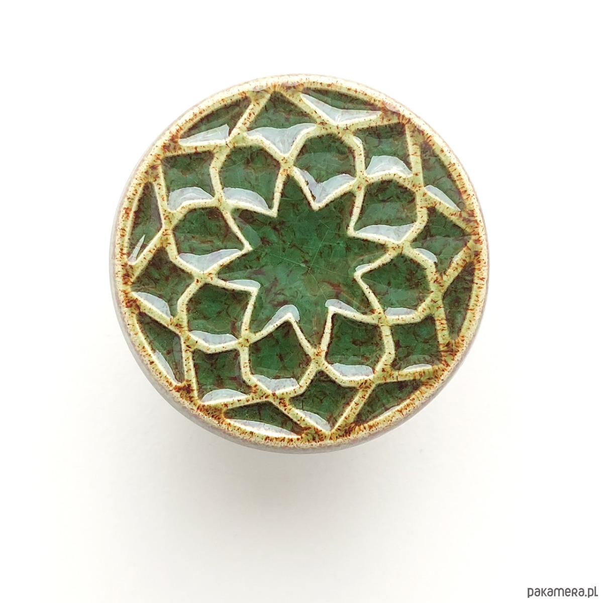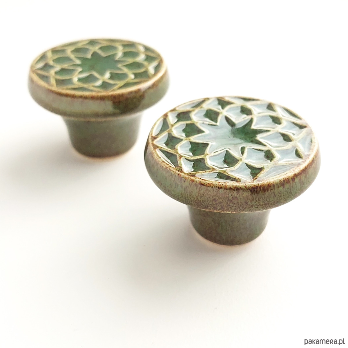 Ceramiczne gałki do mebli - ręcznie wykonane, ornamentowe, wg własnego projektu. Wykonane z jasnej gliny, pokryte błyszczącym szkliwem, wypalone dwukrotnie w wysokiej temperaturze.
