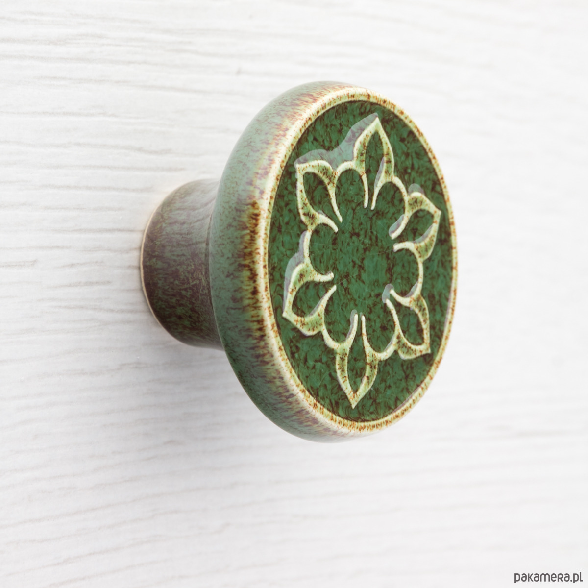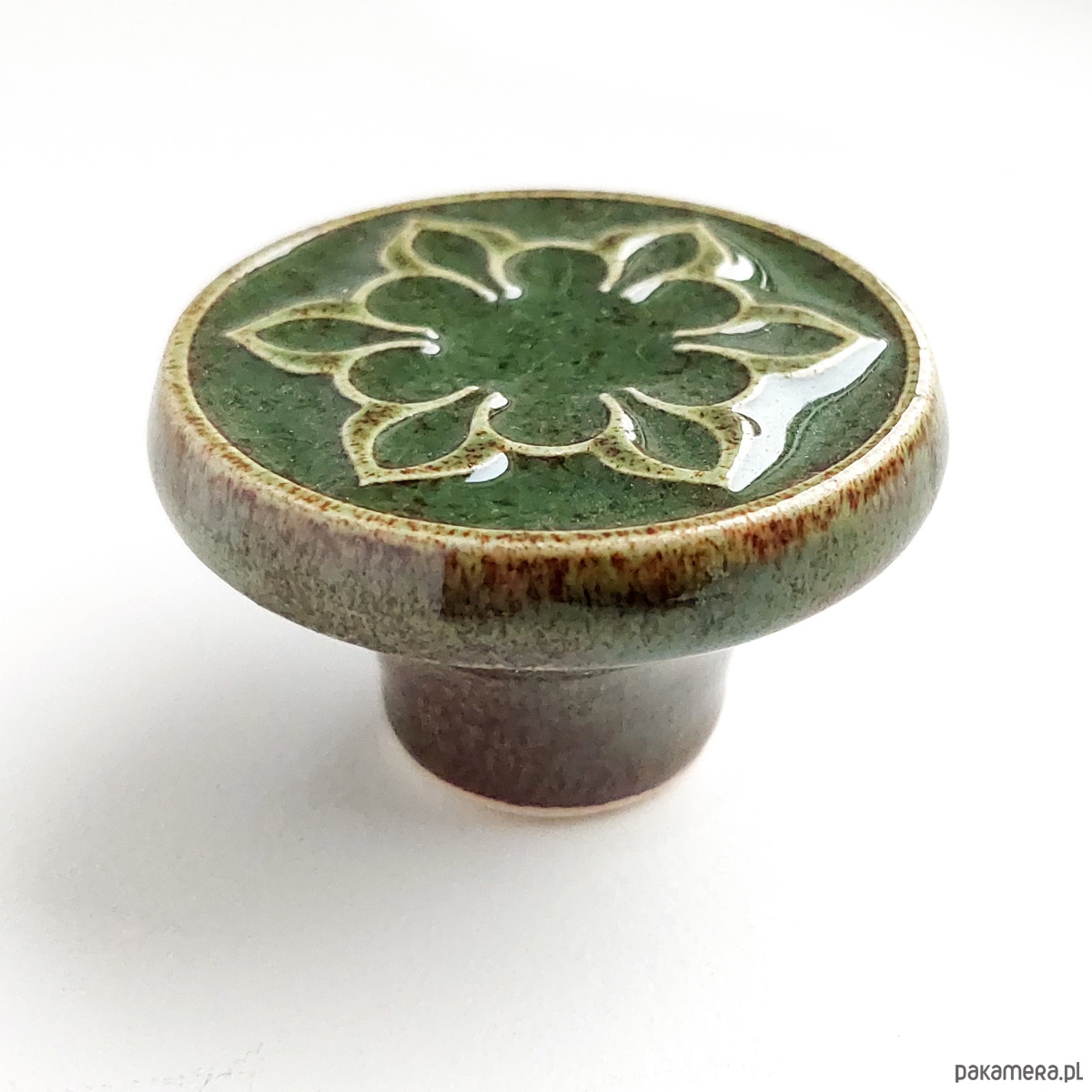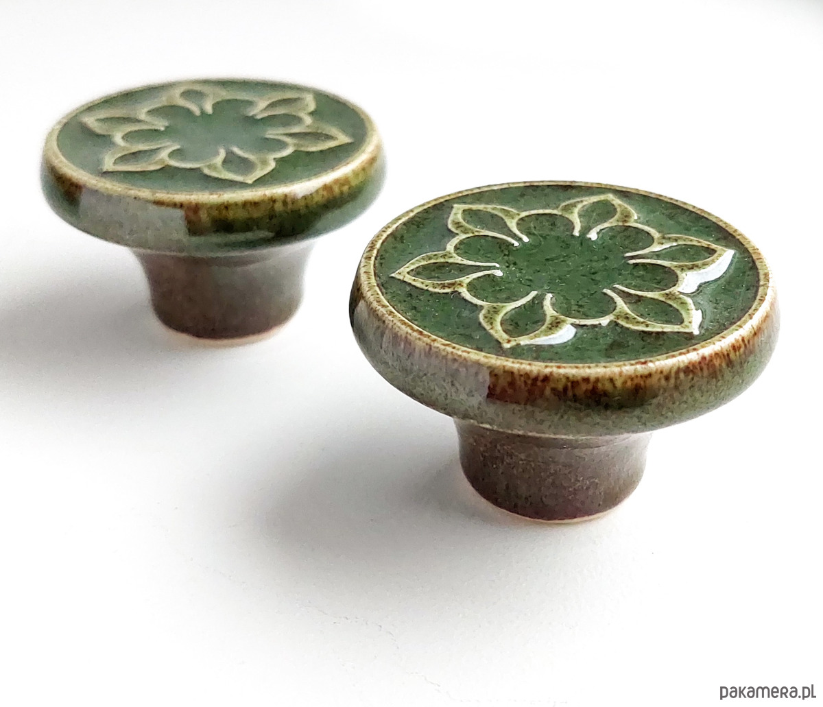 Ceramiczne gałki do mebli z lekko wypukłym ornamentem. Ręcznie wykonane z jasnej gliny, pokryte błyszczącym szkliwem, wypalone dwukrotnie w wysokiej temperaturze.