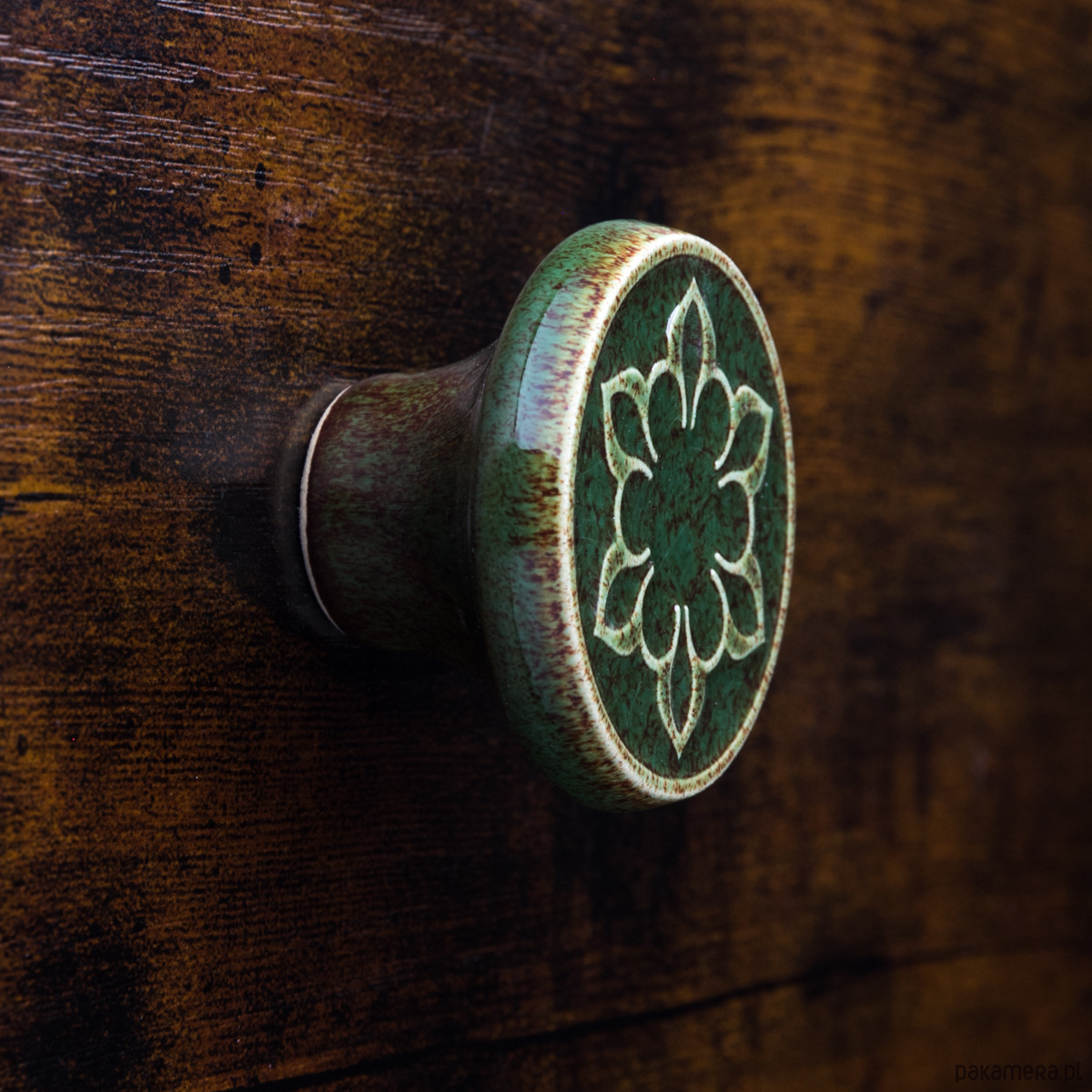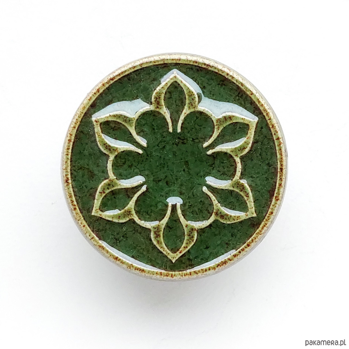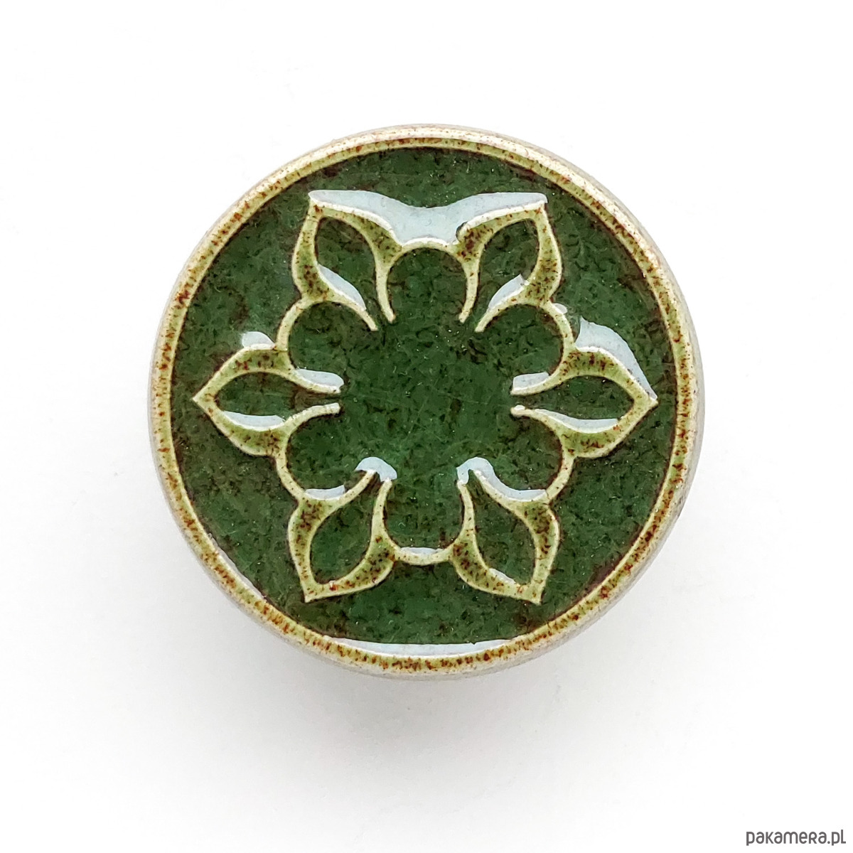 Ceramiczne gałki do mebli z lekko wypukłym ornamentem. Ręcznie wykonane z jasnej gliny, pokryte błyszczącym szkliwem, wypalone dwukrotnie w wysokiej temperaturze.