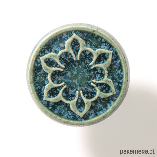 Ceramiczna gałka do mebli - ręcznie wykonana, ornamentowa, wg własnego projektu. Wykonana z jasnej gliny, pokryta błyszczącym szkliwem, wypalona dwukrotnie w wysokiej temperaturze.
