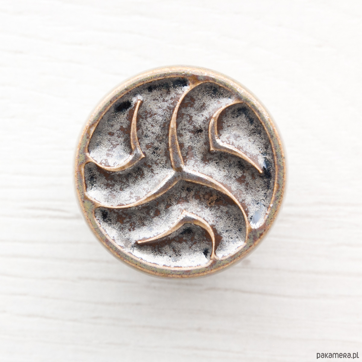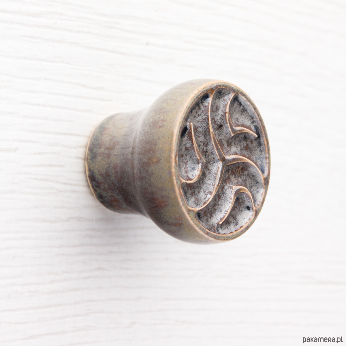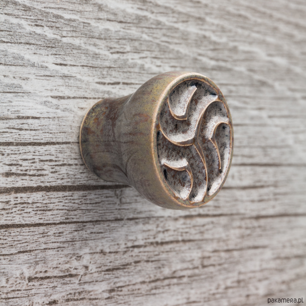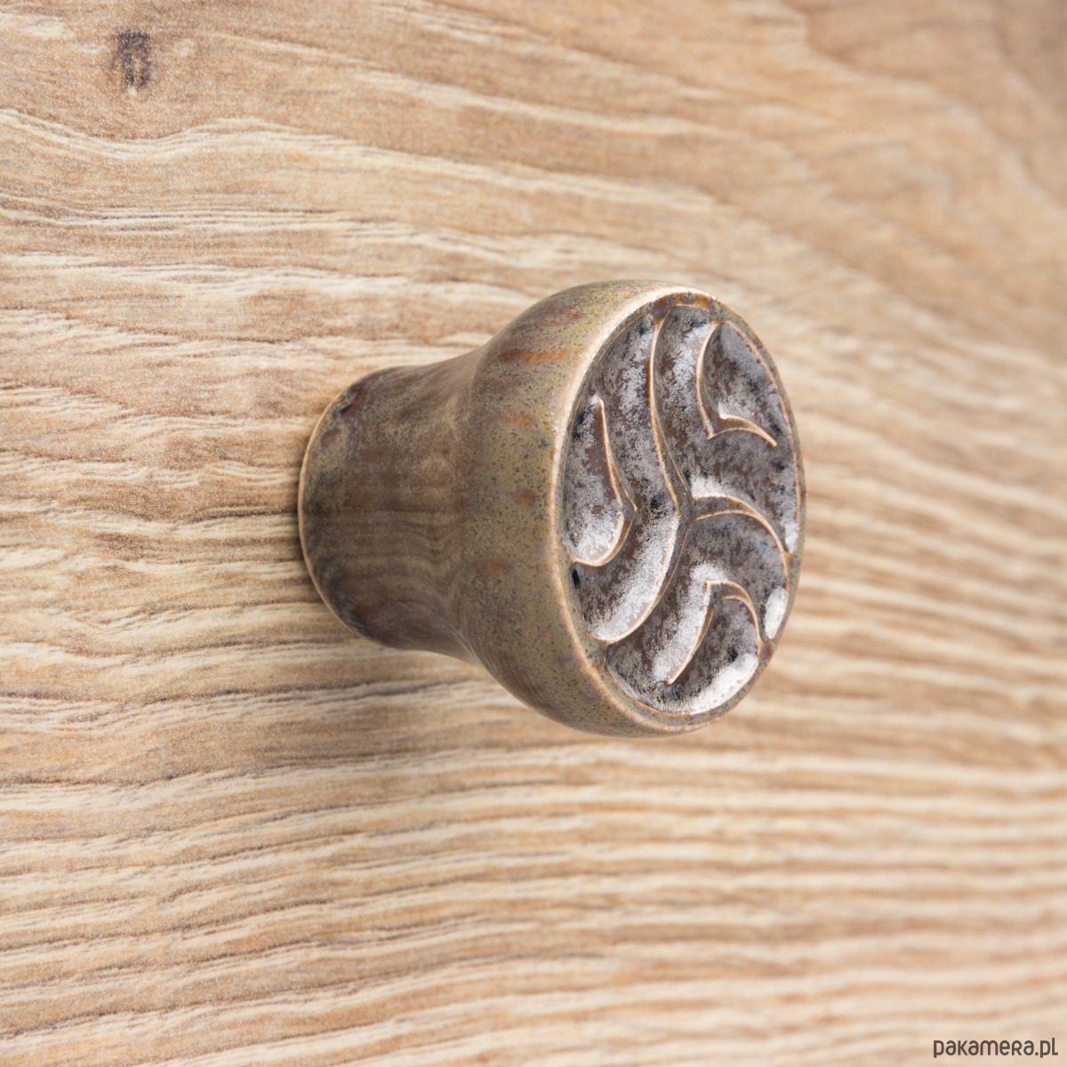 Ceramiczna gałka do mebli z lekko wypukłym ornamentem. Ręcznie wykonana z jasnej gliny, pokryta szkliwem o satynowym połysku, wypalona dwukrotnie w wysokiej temperaturze. Twoje meble zyskają nowy, niepowtarzalny, jedyny w swoim rodzaju wygląd.