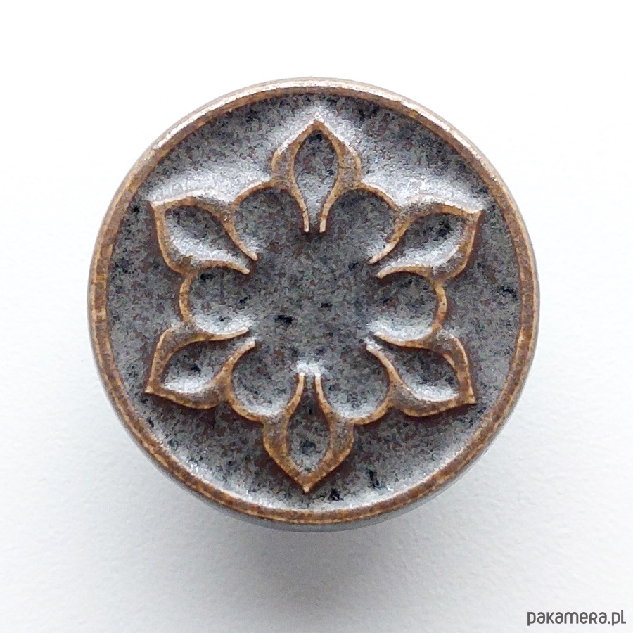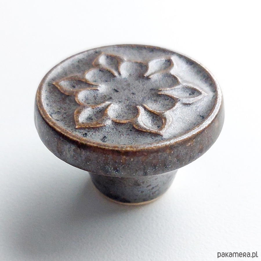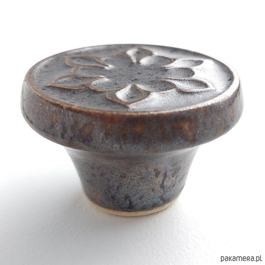 Ceramiczna gałka do mebli z lekko wypukłym ornamentem. Ręcznie wykonana z jasnej gliny, pokryta błyszczącym szkliwem, wypalona dwukrotnie w wysokiej temperaturze. Twoje meble zyskają nowy, niepowtarzalny, jedyny w swoim rodzaju wygląd.