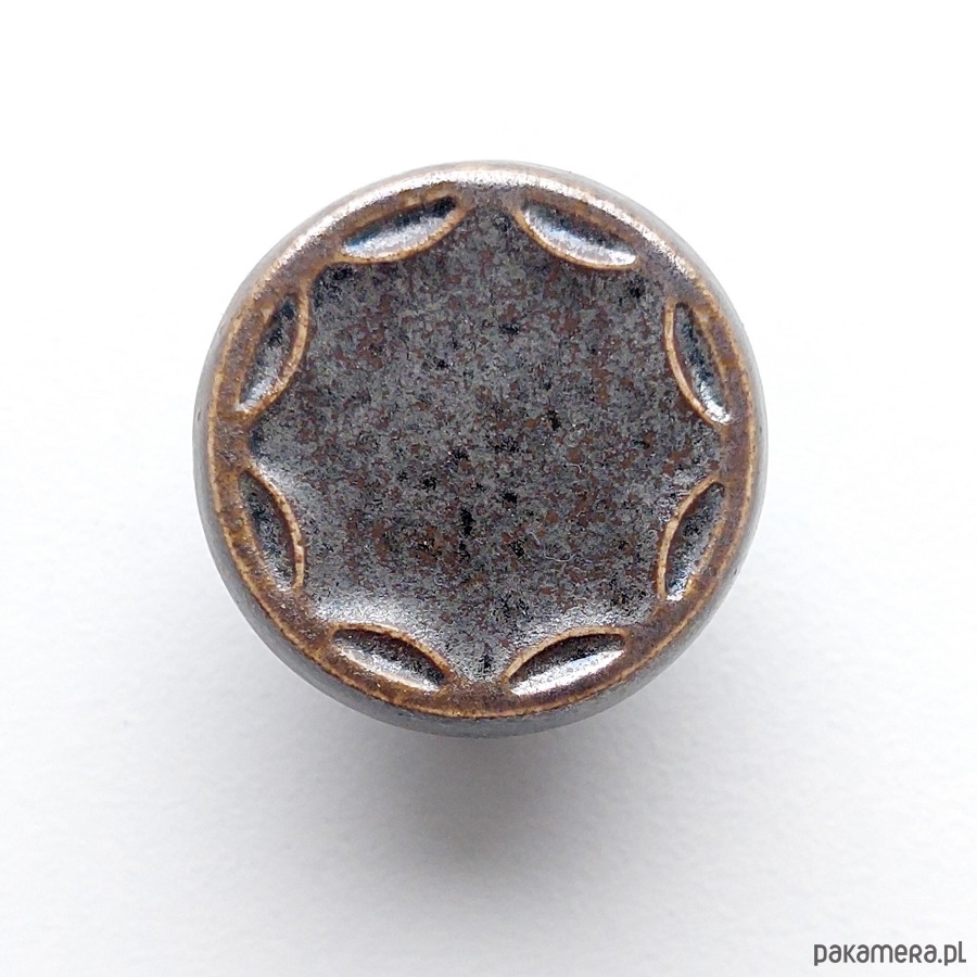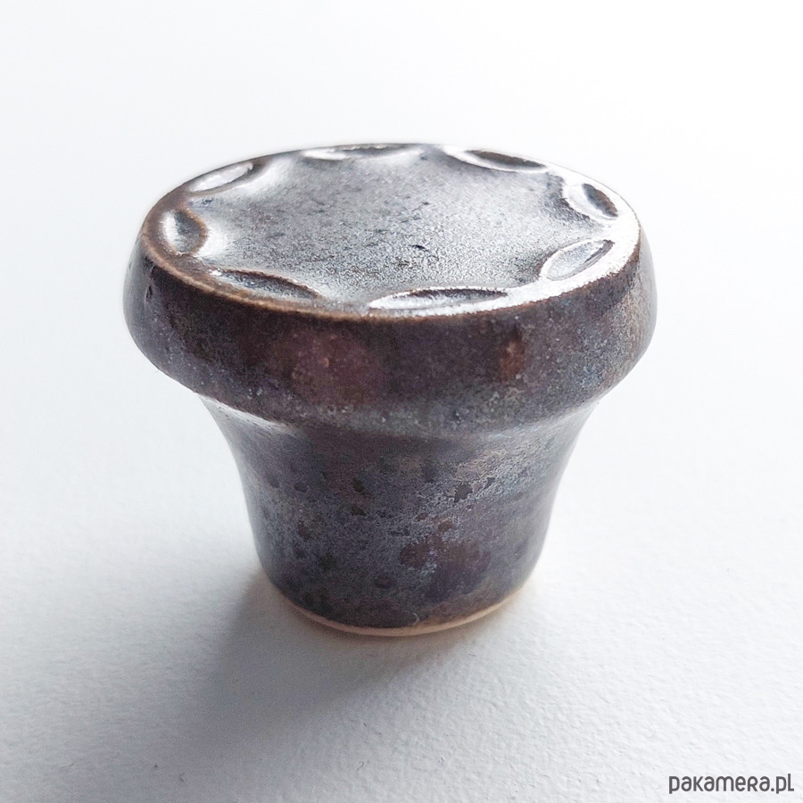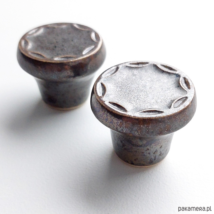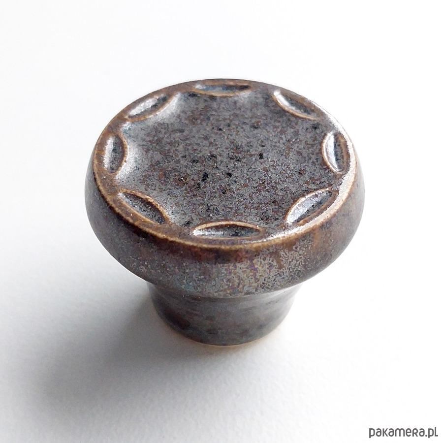 Ceramiczna gałka do mebli z lekko wypukłym ornamentem. Ręcznie wykonana z jasnej gliny, pokryta szkliwem o satynowym połysku, wypalona dwukrotnie w wysokiej temperaturze. Twoje meble zyskają nowy, niepowtarzalny, jedyny w swoim rodzaju wygląd.