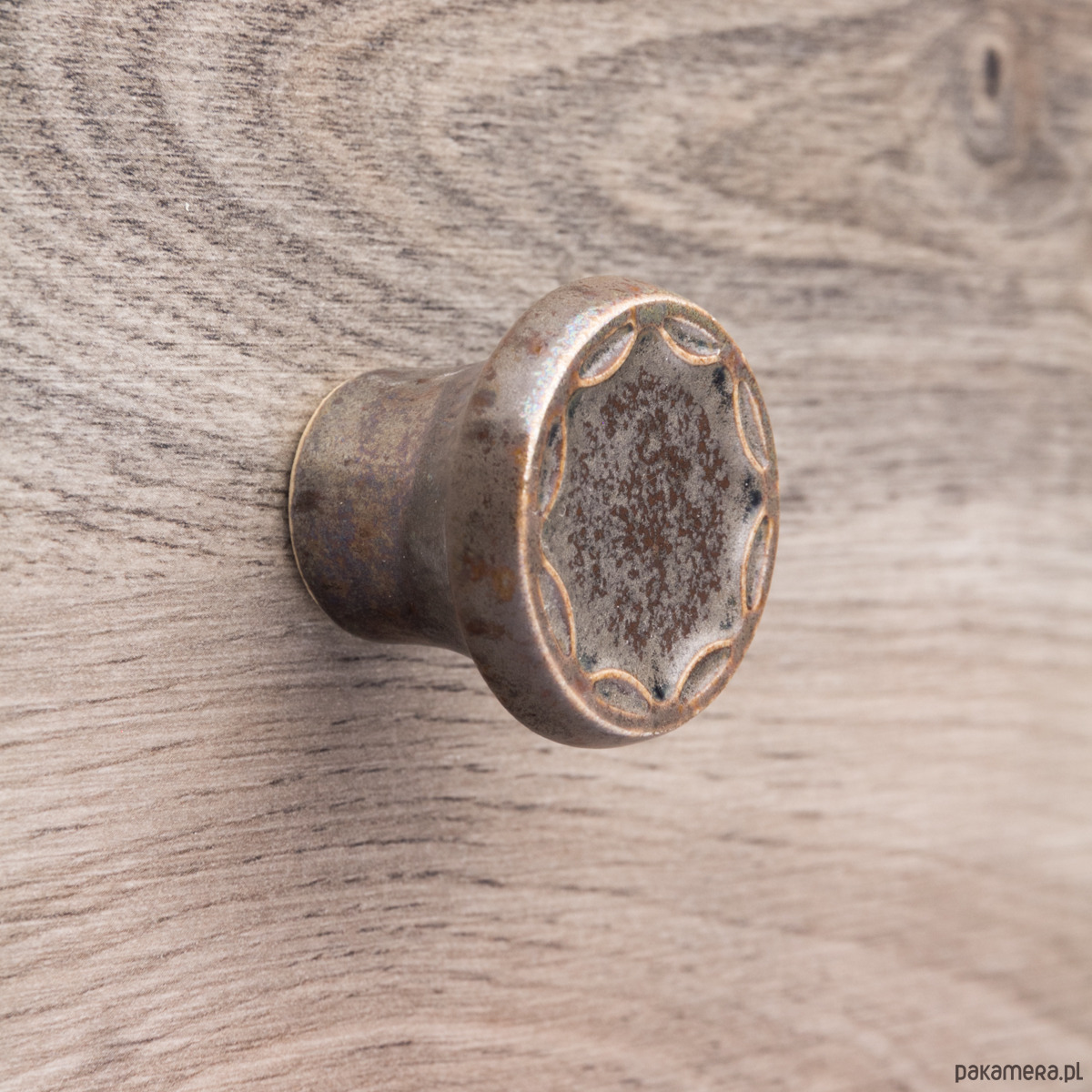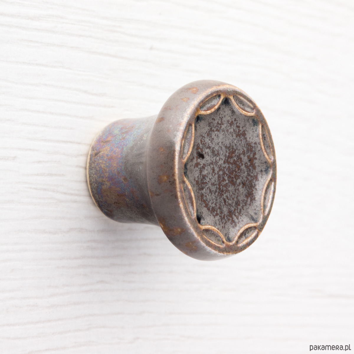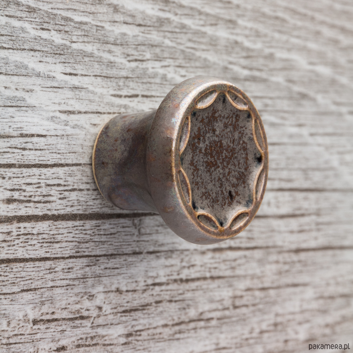 Ceramiczna gałka do mebli z lekko wypukłym ornamentem. Ręcznie wykonana z jasnej gliny, pokryta szkliwem o satynowym połysku, wypalona dwukrotnie w wysokiej temperaturze. Twoje meble zyskają nowy, niepowtarzalny, jedyny w swoim rodzaju wygląd.