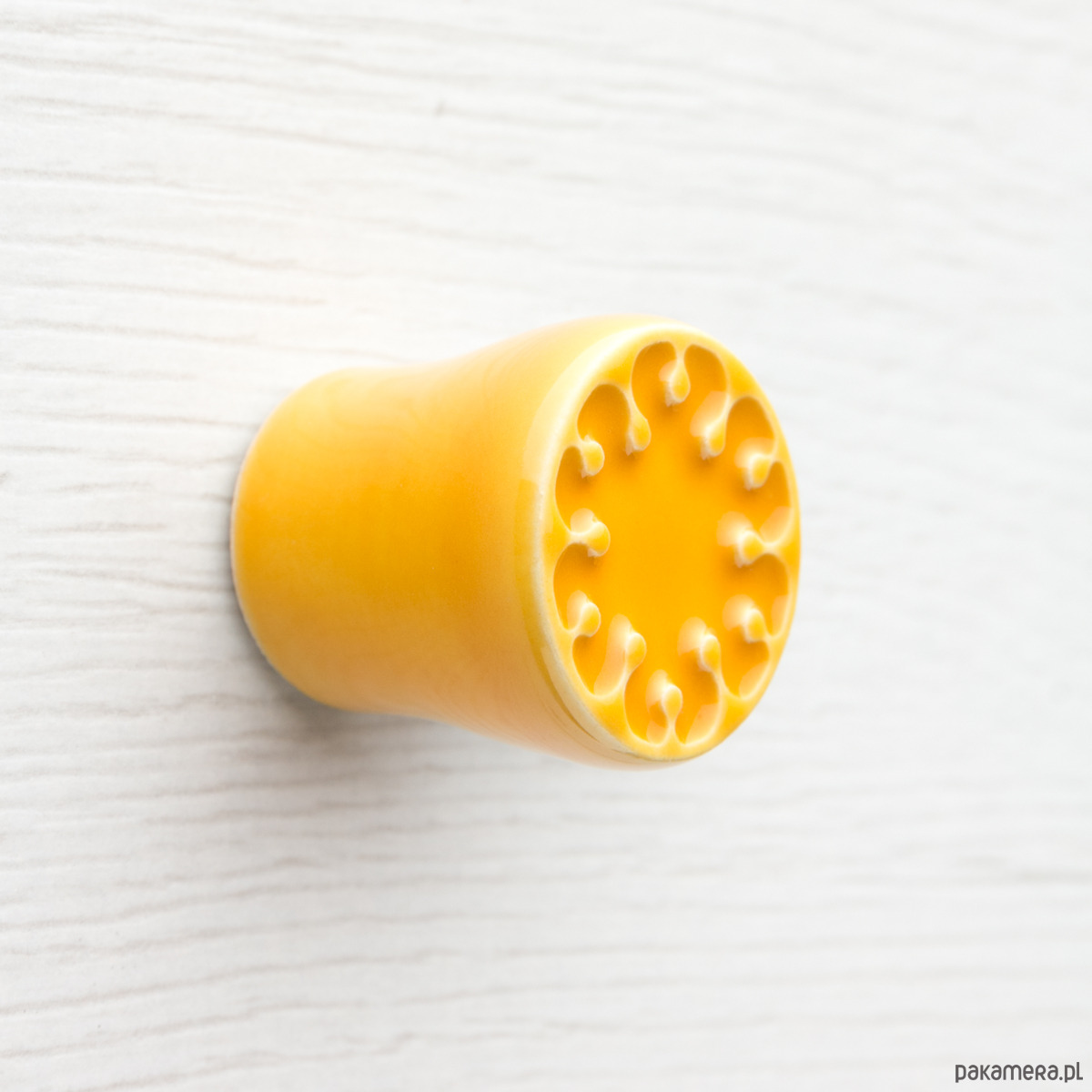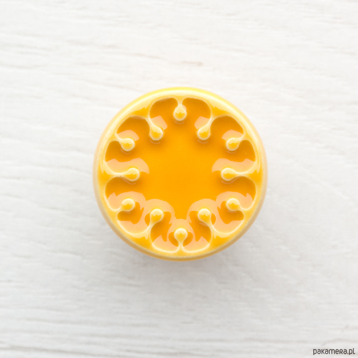 Ceramiczna gałka do mebli z lekko wypukłym ornamentem. Ręcznie wykonana z jasnej gliny, pokryta błyszczącym, szkliwem, wypalona dwukrotnie w wysokiej temperaturze. Twoje meble zyskają nowy, niepowtarzalny, jedyny w swoim rodzaju wygląd.