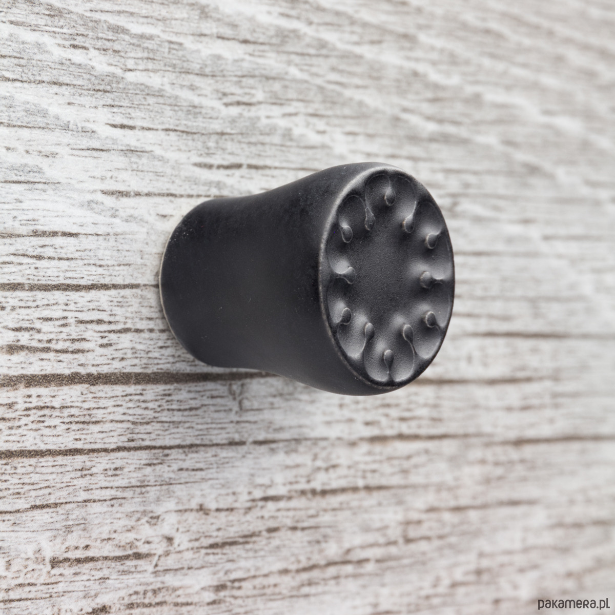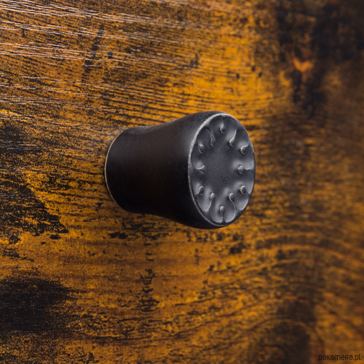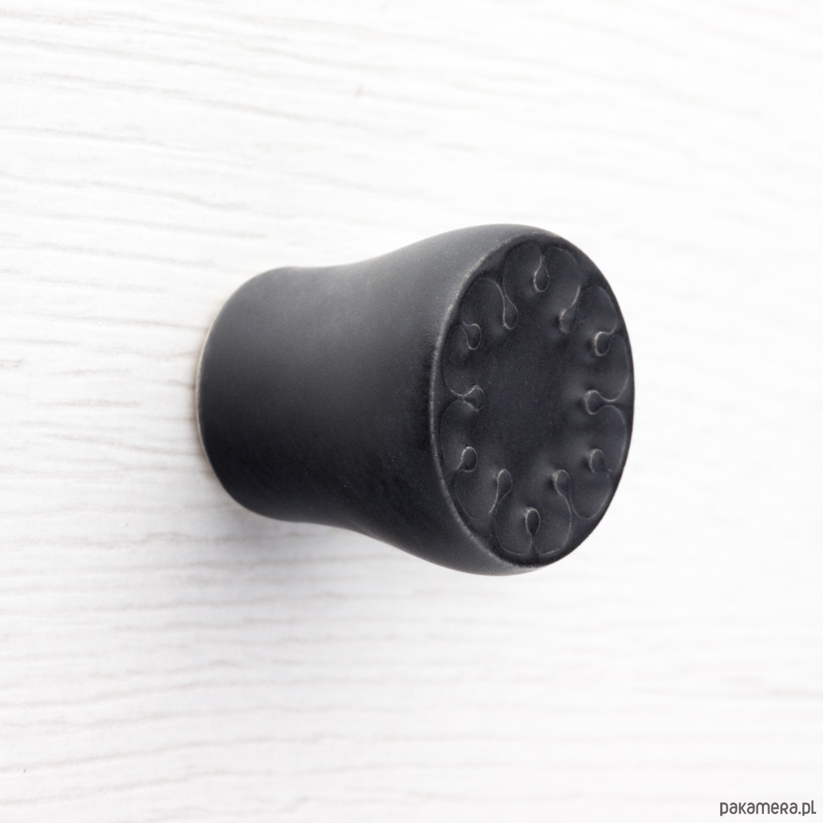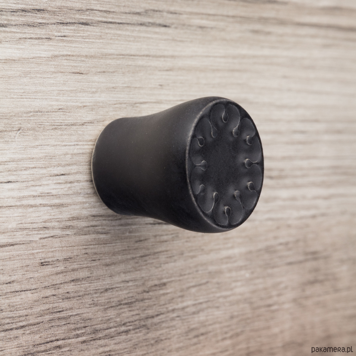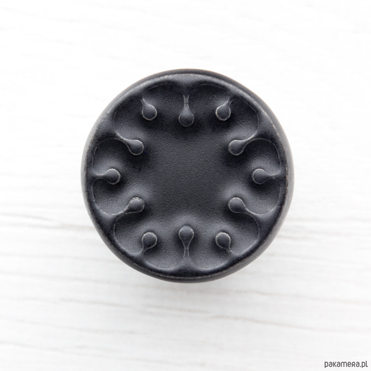 Ceramiczna gałka do mebli z lekko wypukłym ornamentem. Ręcznie wykonana z jasnej gliny, pokryta matowym szkliwem, wypalona dwukrotnie w wysokiej temperaturze. Twoje meble zyskają nowy, niepowtarzalny, jedyny w swoim rodzaju wygląd.