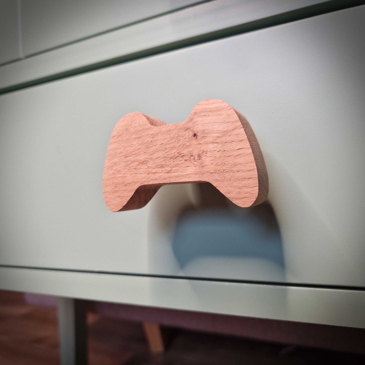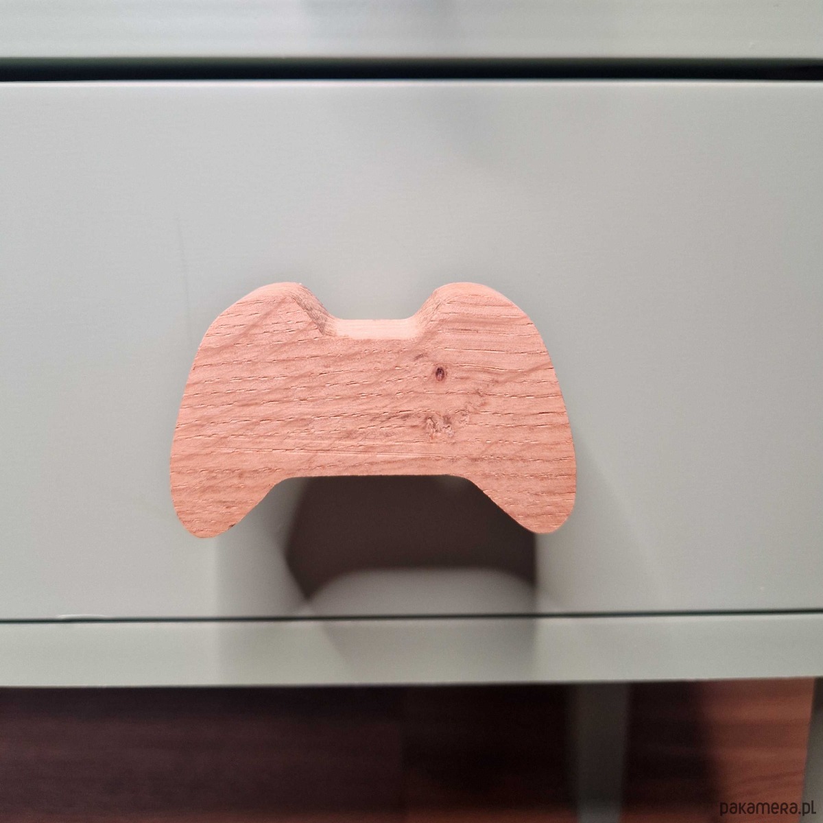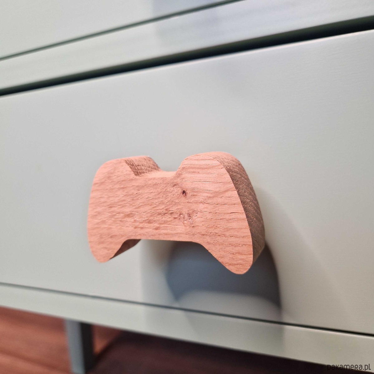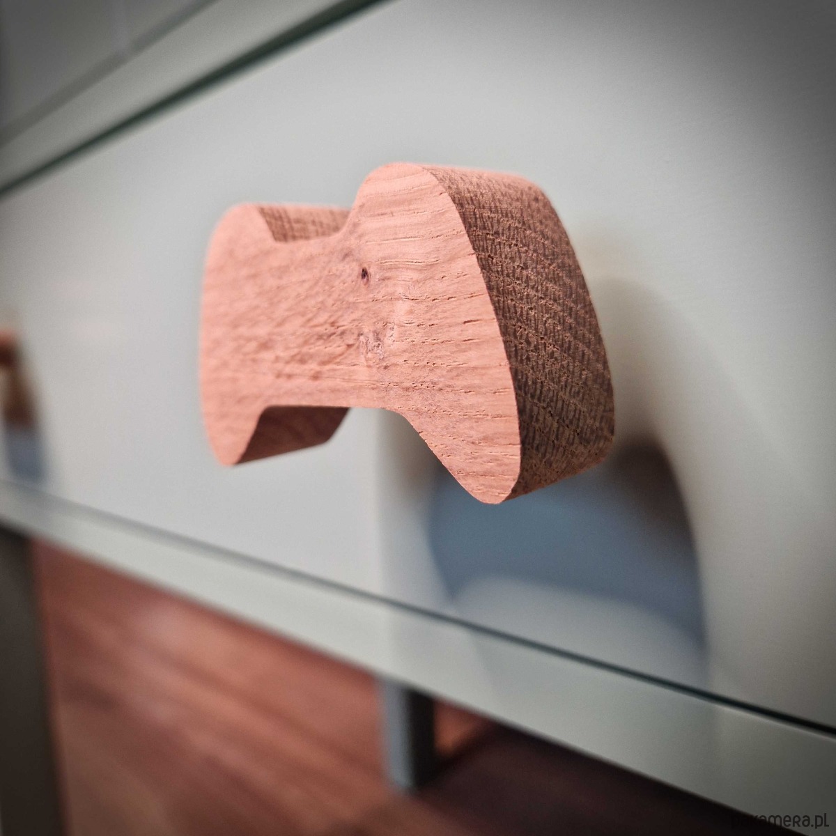 Gałka meblowa dla fana gier, pad konsola, dąb