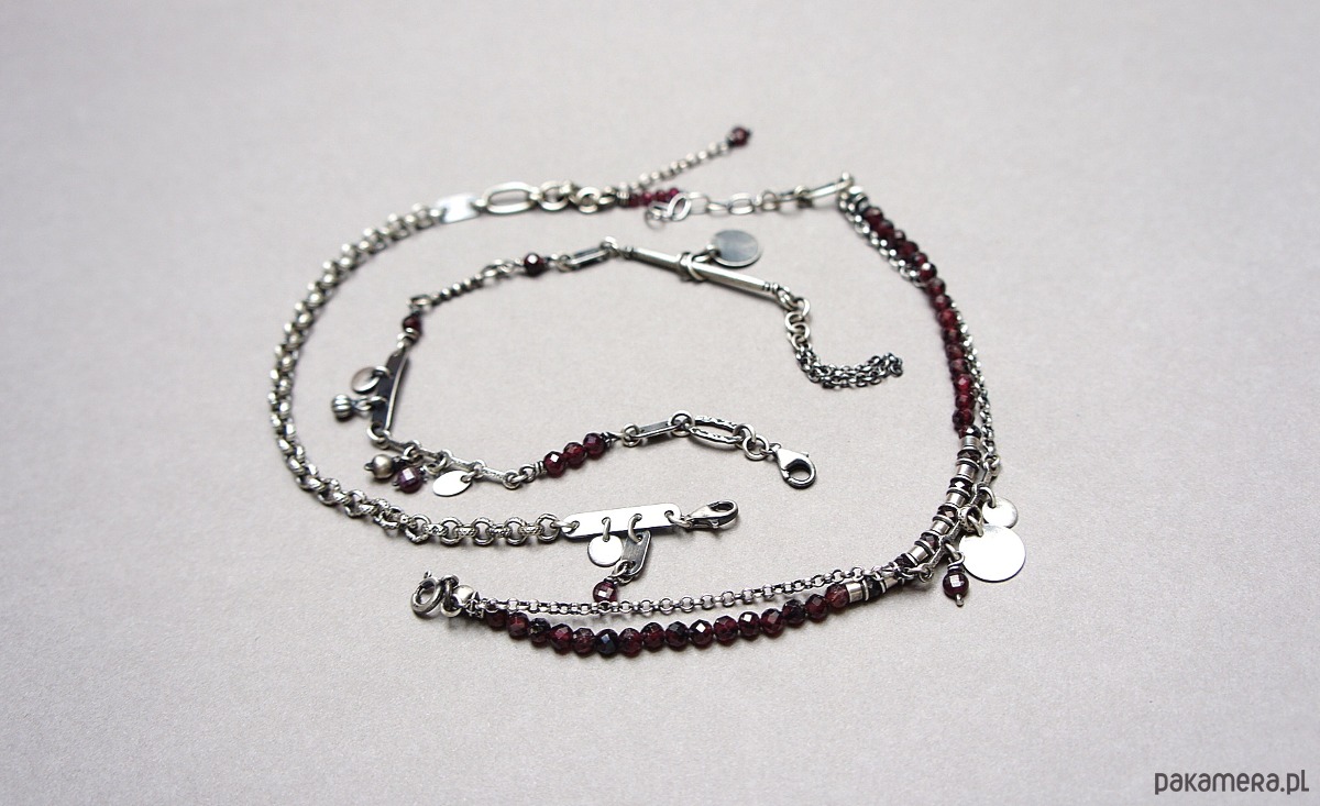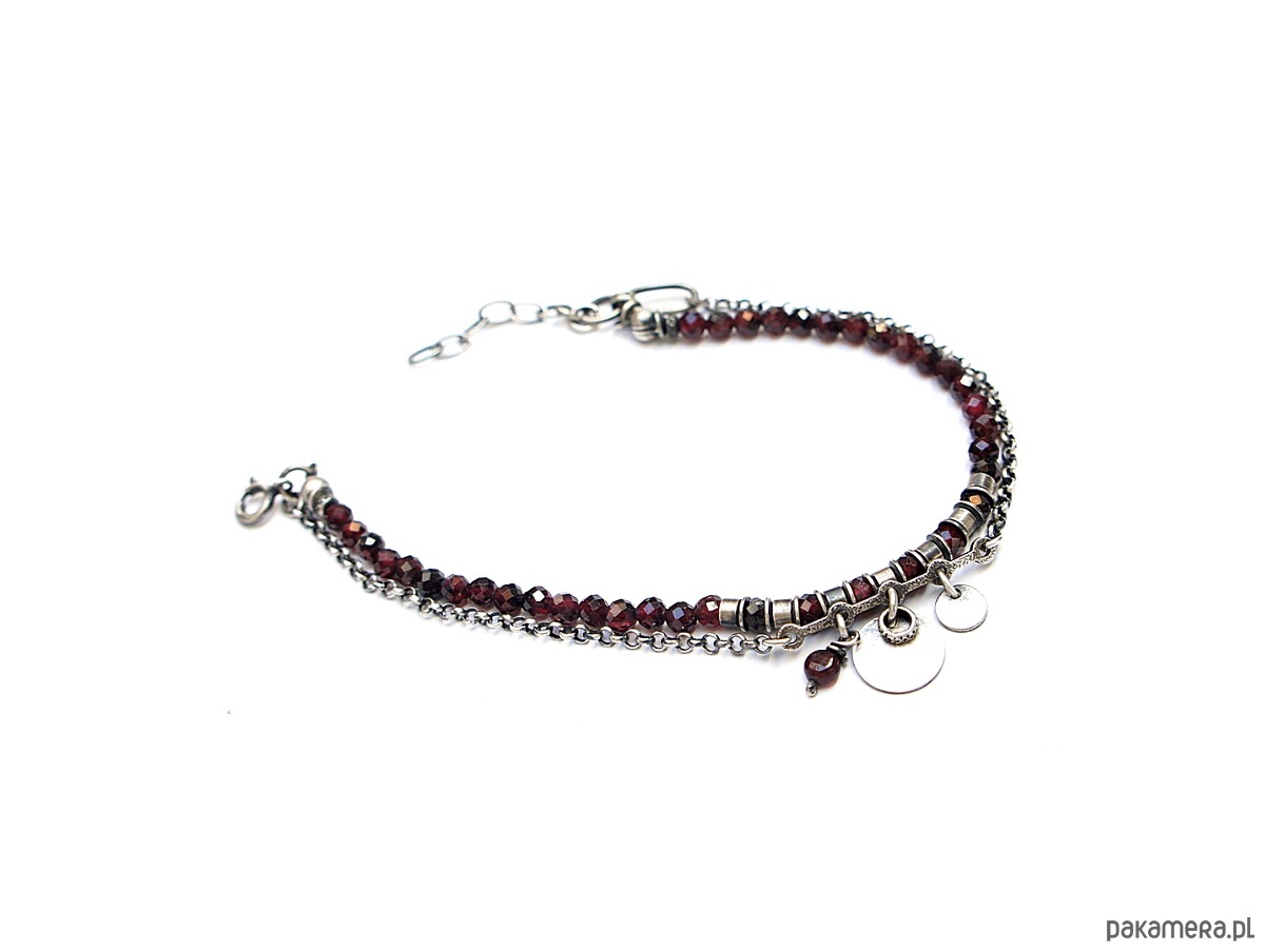 Bransoletka wykonana ze srebra pr. 925 w połączeniu z fasetowanymi kuleczkami granatów [4mm] oraz srebrnymi blaszkami . Srebro oksydowane i przetarte. Całkowita długość bransoletki 19,5cm plus dodatkowe ogniwa i ozdobna przedłużka .