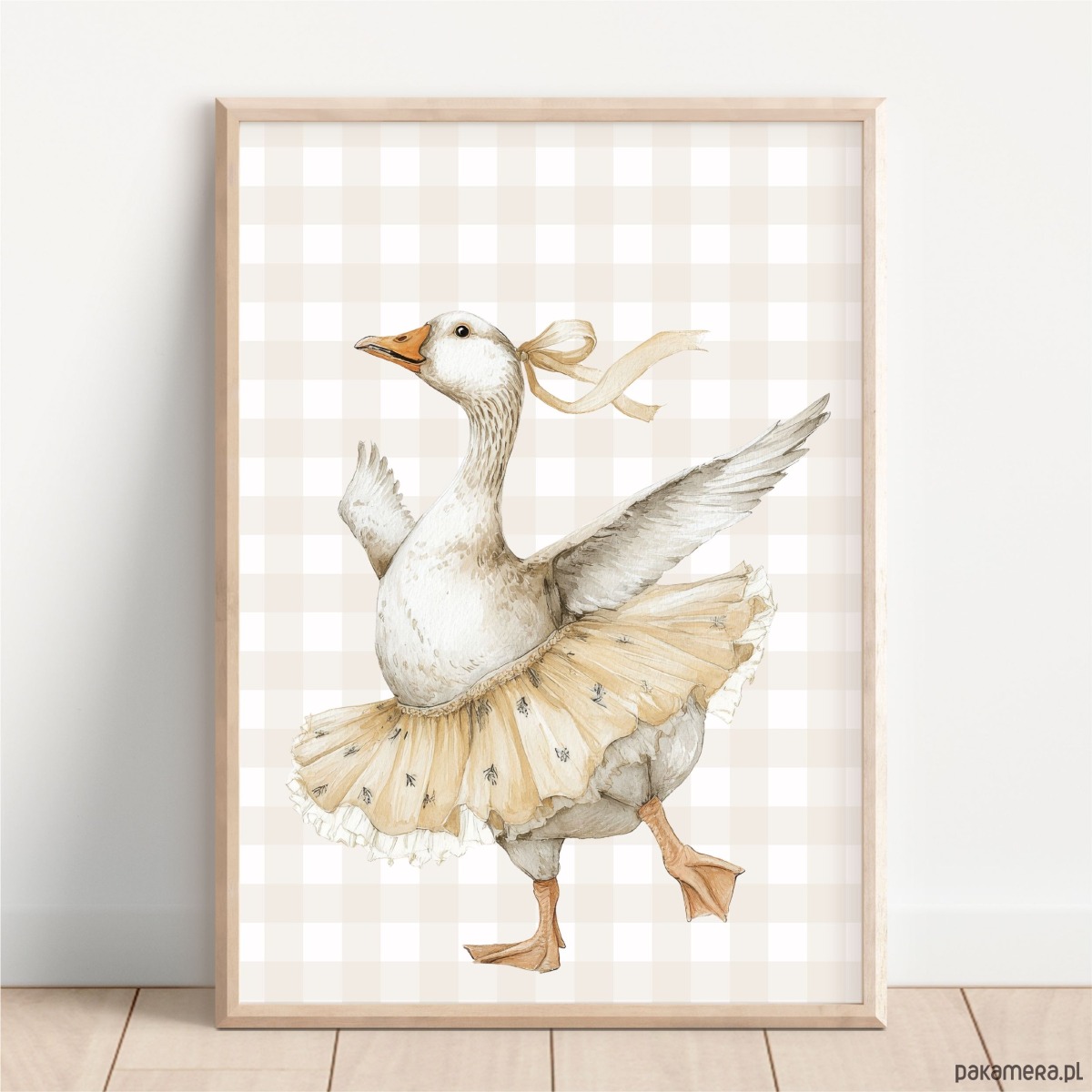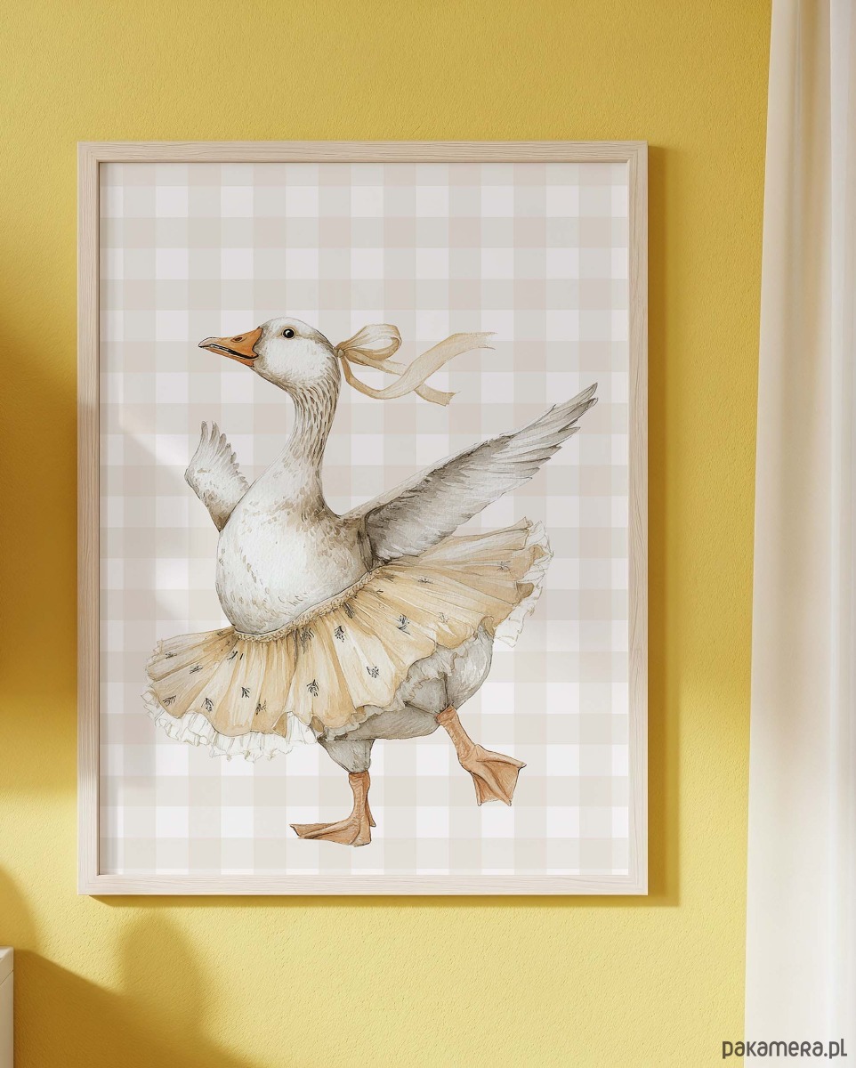 Delikatny plakat przedstawiający gąskę w baletowej spódniczce w stylu vintage. Urocza dekoracja do pokoju dziewczynki w ciepłych, pastelowych barwach – idealna do wnętrz w stylu boho lub retro.