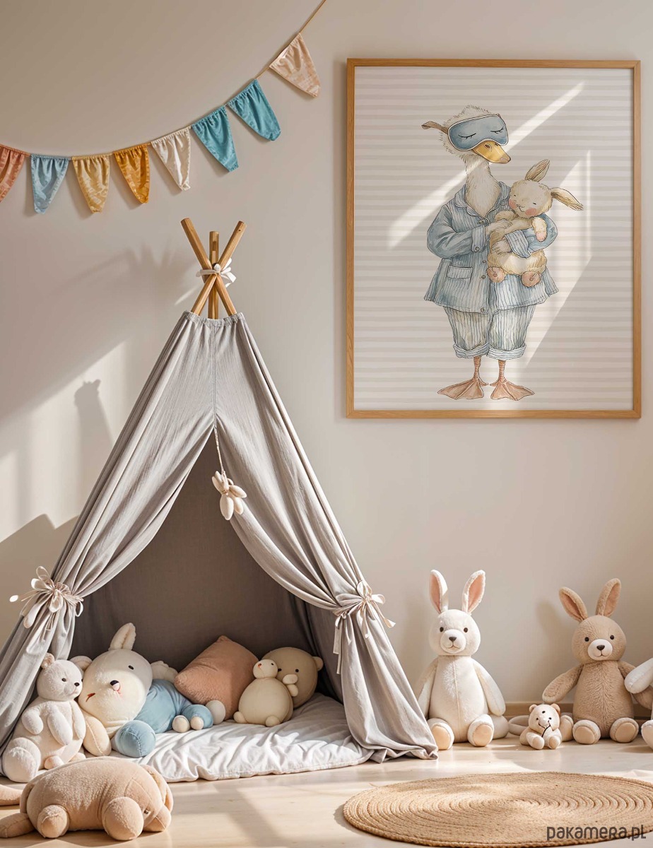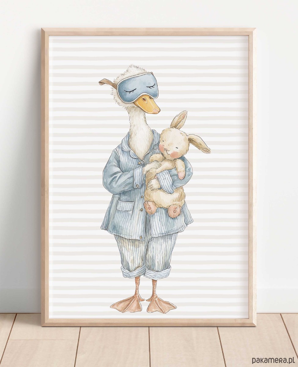 Plakat Gąska w piżamce z króliczkiem to urocza dekoracja do pokoju dziecka w stylu retro-boho.
