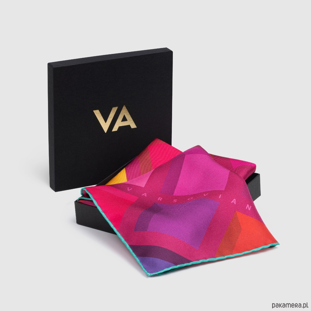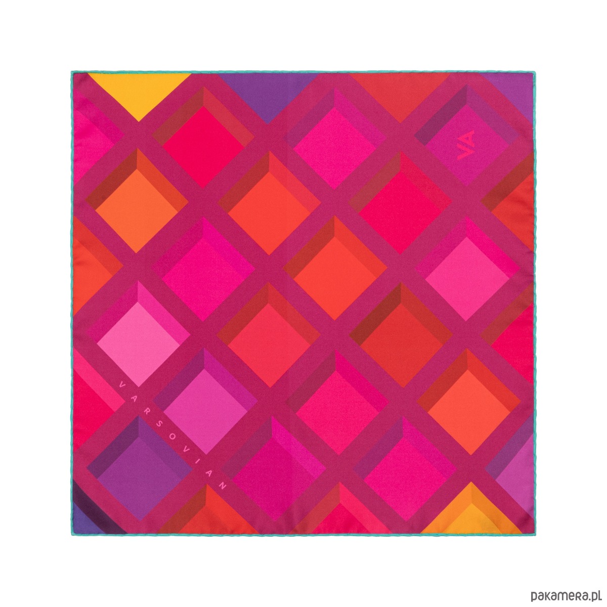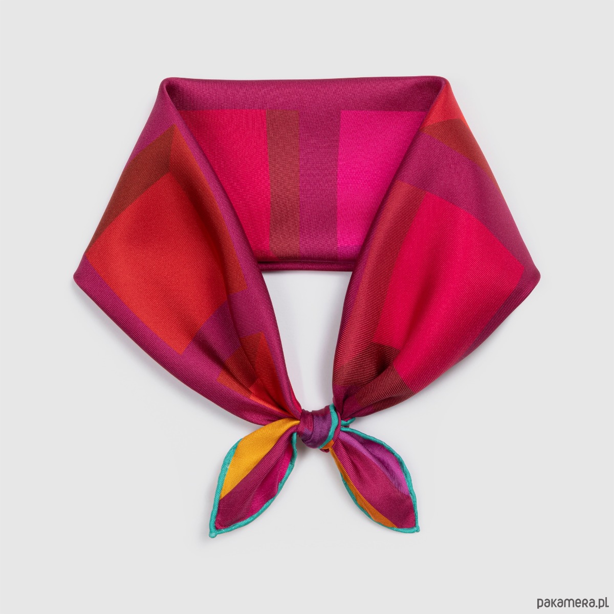 Kwadratowy układ stropu naturalnie wpisał się w format jedwabnej gawroszki. Wykonana z nieco grubszego twillu, przyciąga wzrok rytmem geometrycznych form i dodaje energii swoją intensywną, nasyconą kolorystyką.