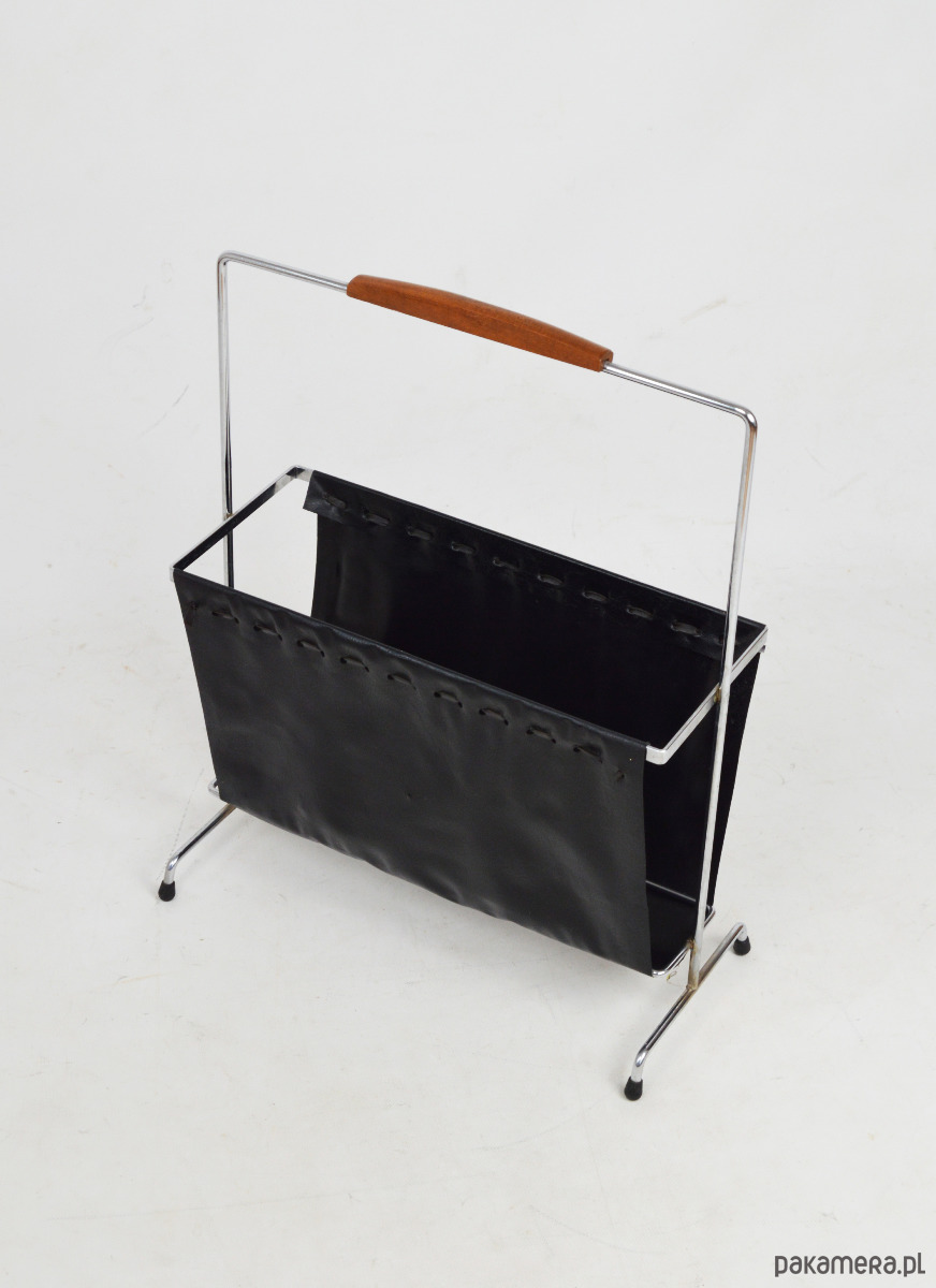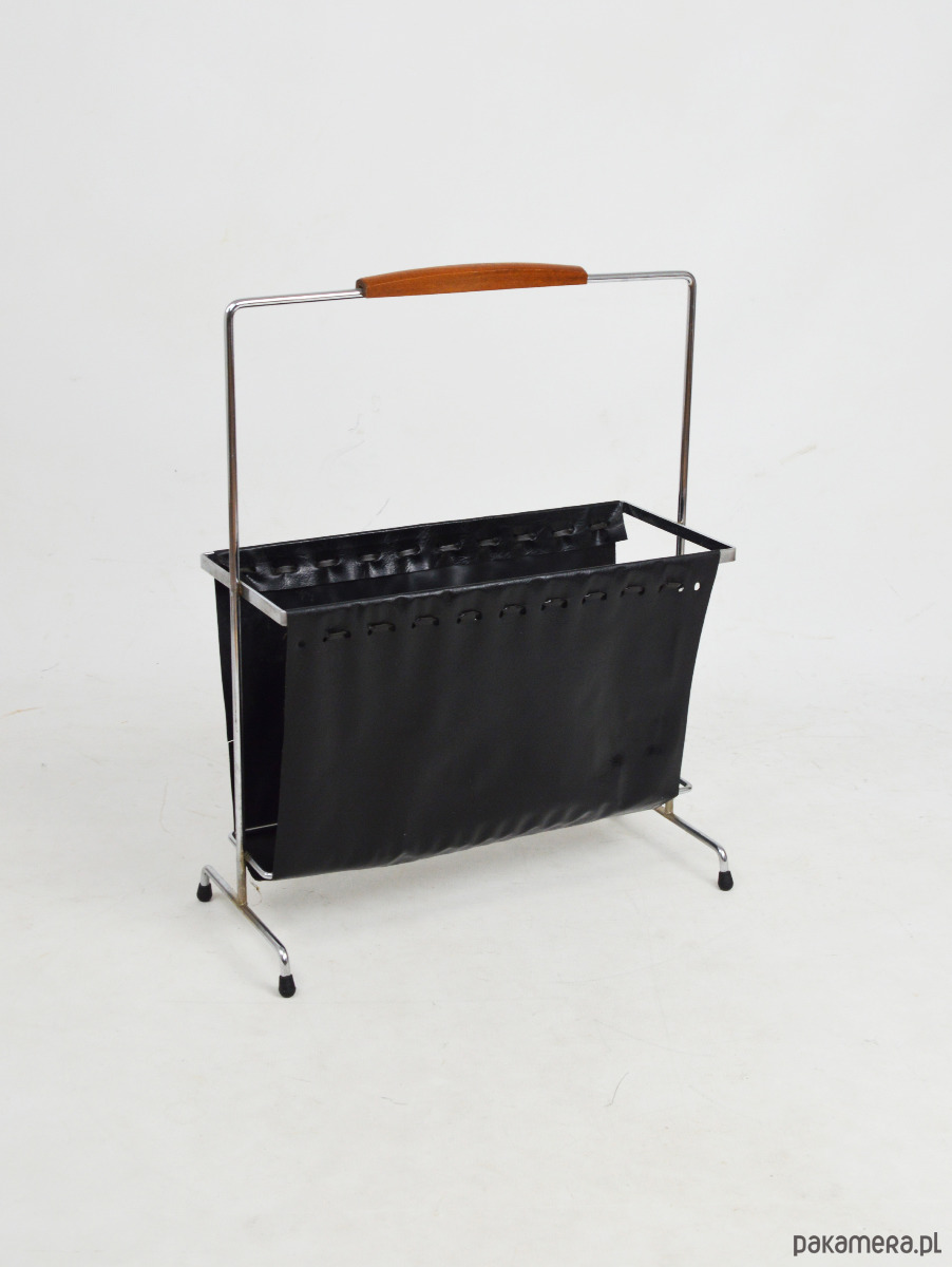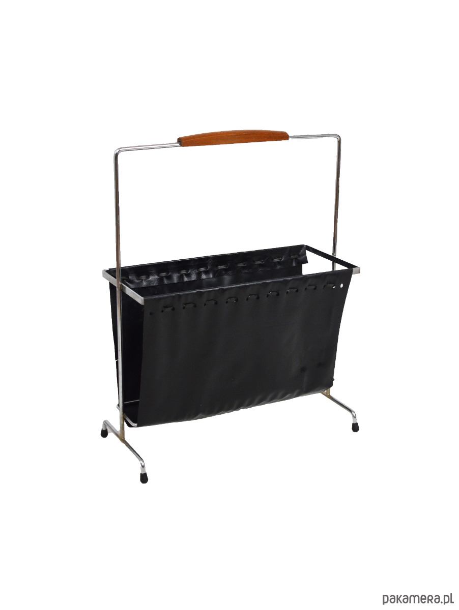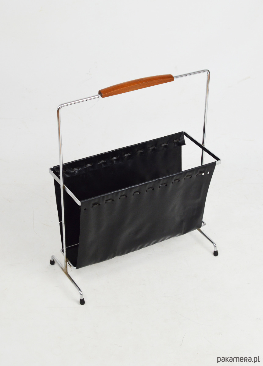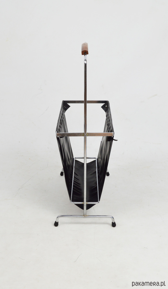 Gazetnik wykonany z tworzywa przypominającego skórę osadzony na chromowanym stelażu z rączką wykończoną drewnem. Stan zachowania dobry, widoczne centymetrowe rozdarcie materiału.