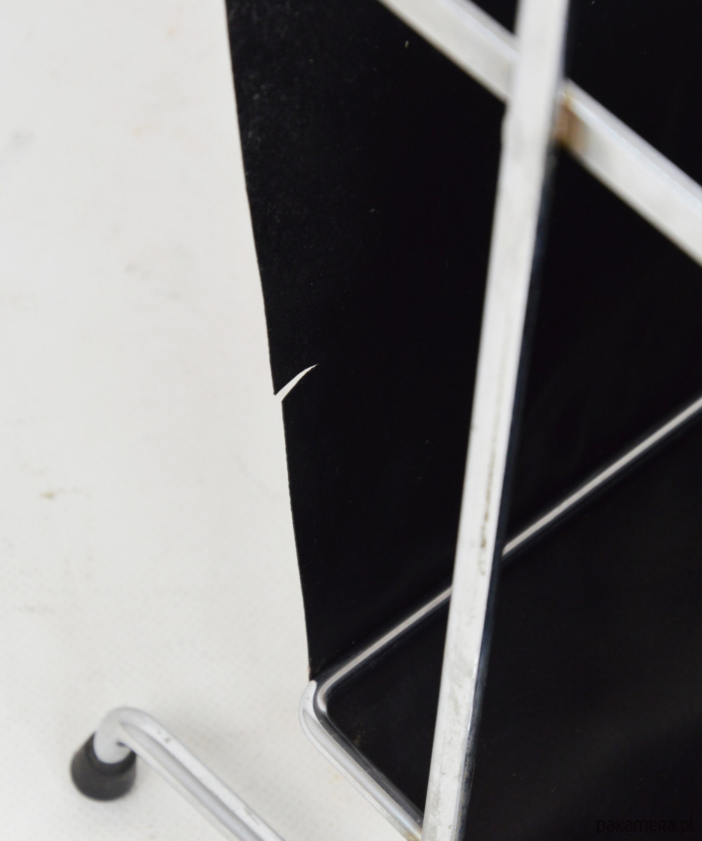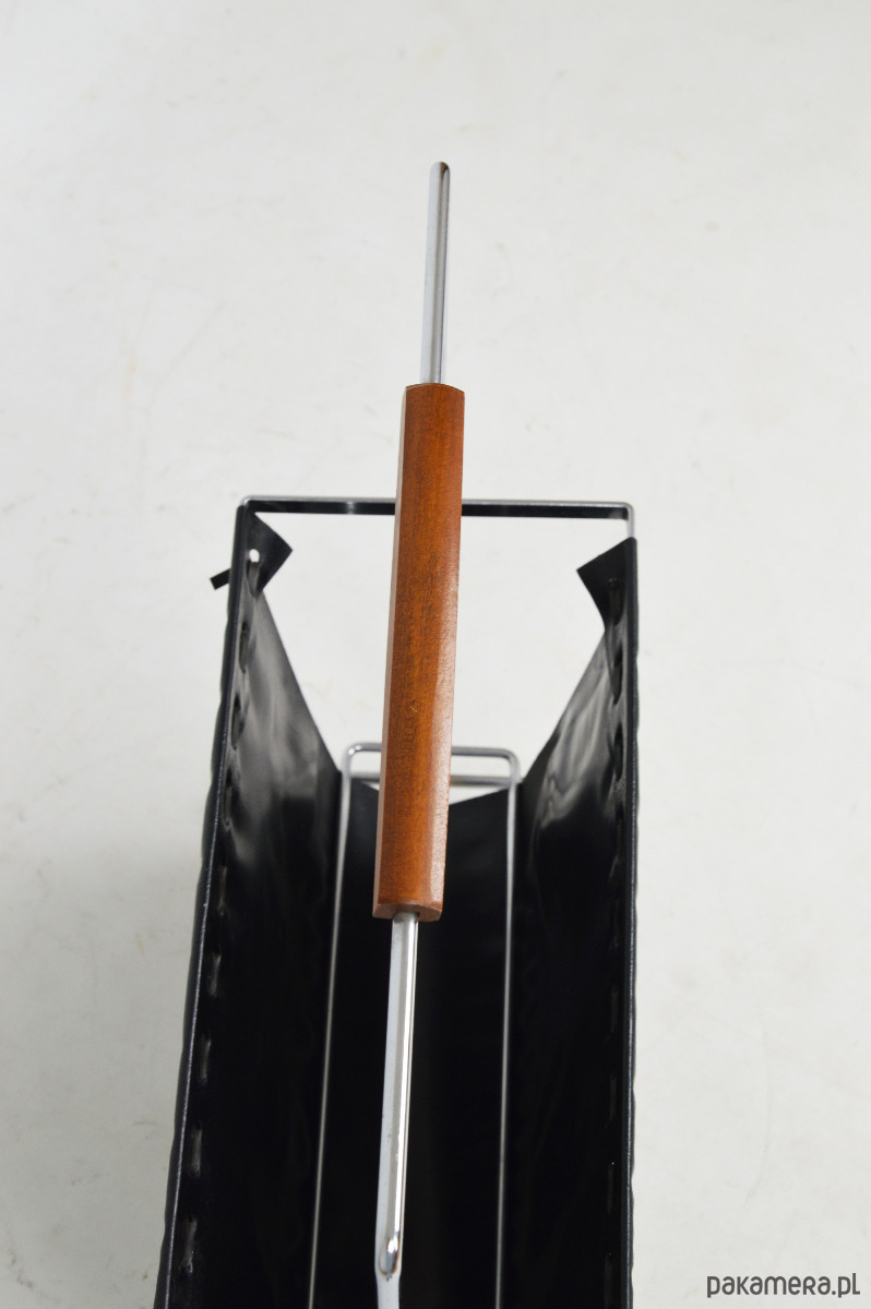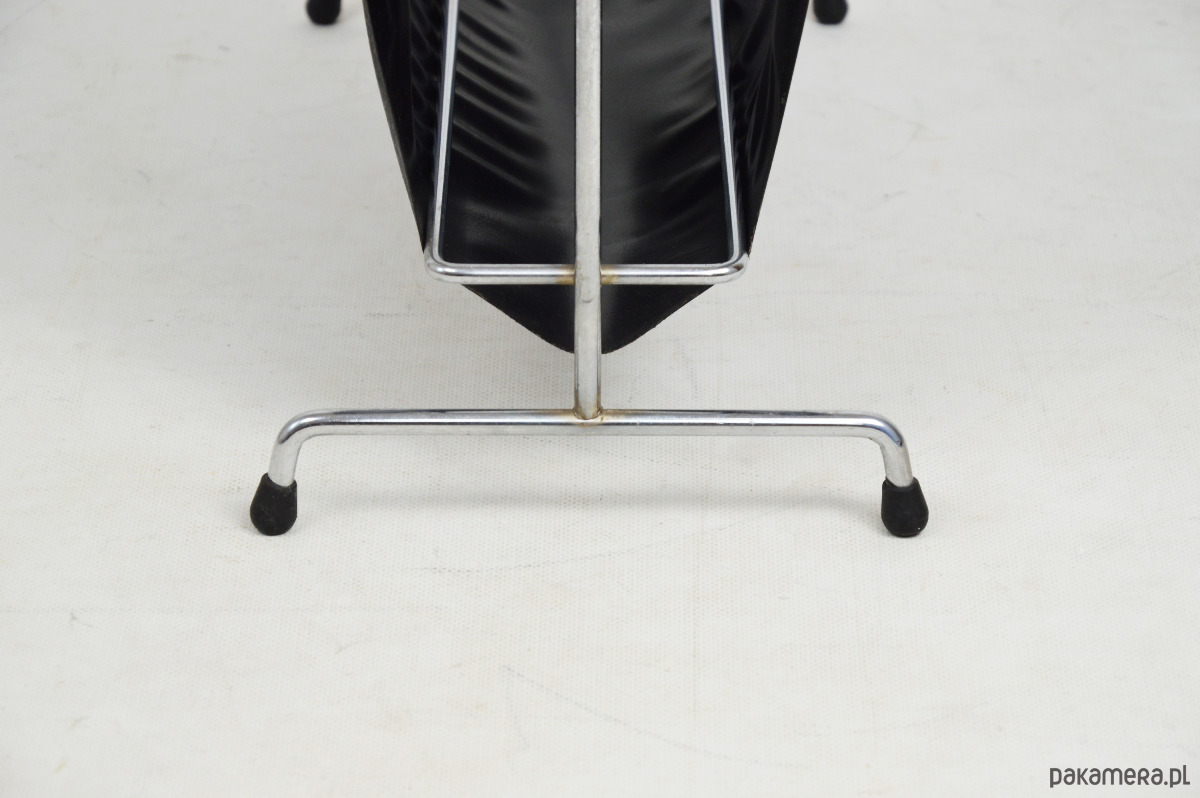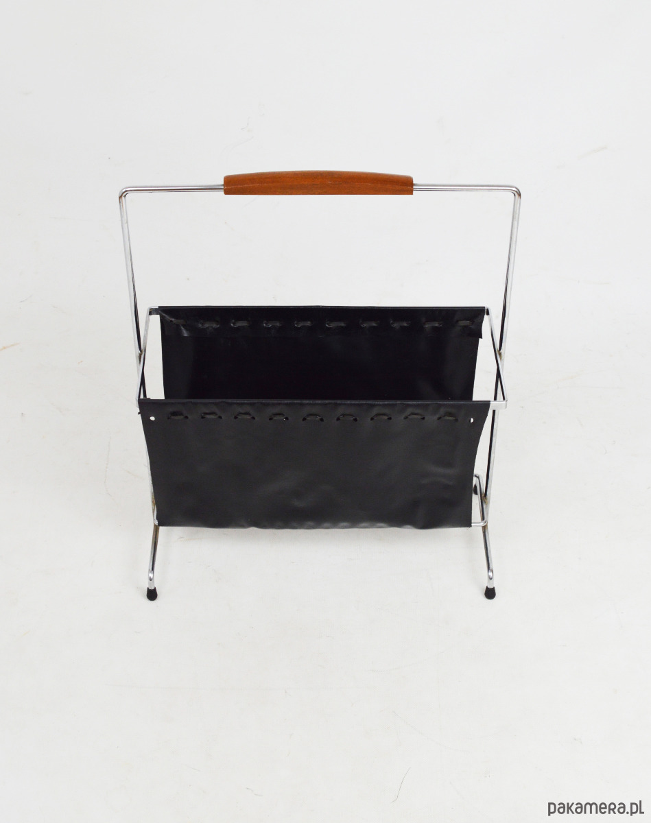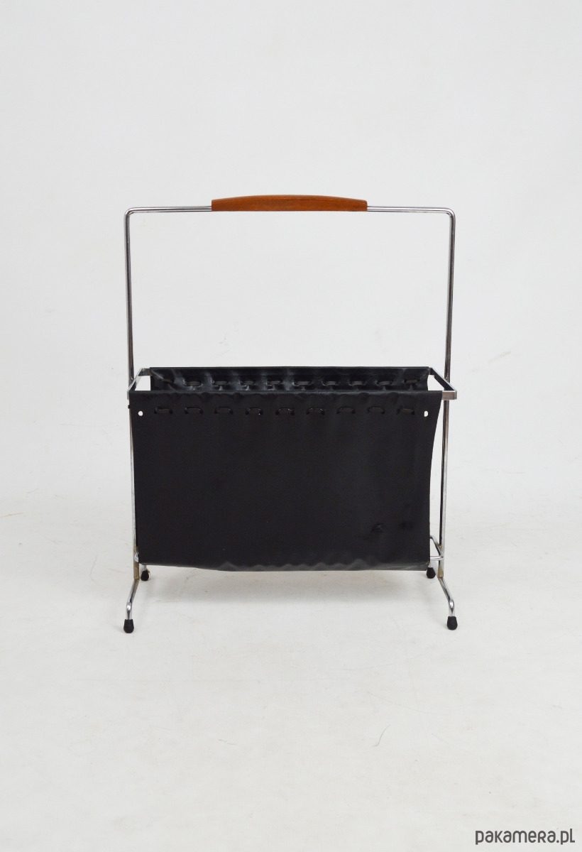 Gazetnik wykonany z tworzywa przypominającego skórę osadzony na chromowanym stelażu z rączką wykończoną drewnem. Stan zachowania dobry, widoczne centymetrowe rozdarcie materiału.