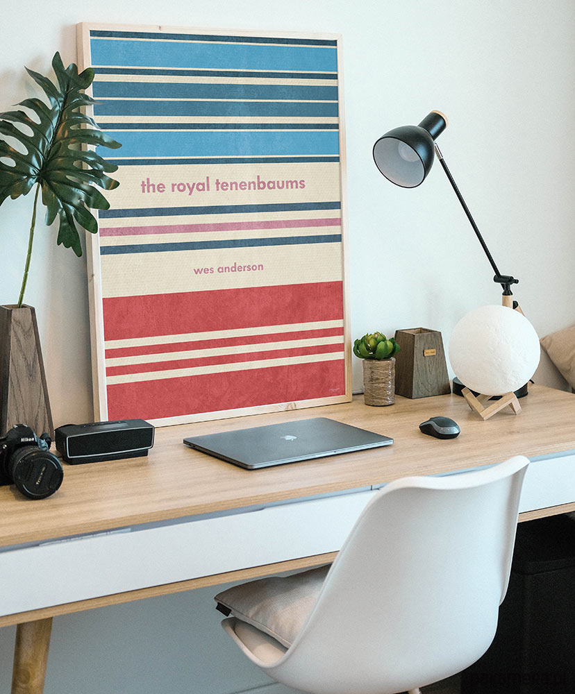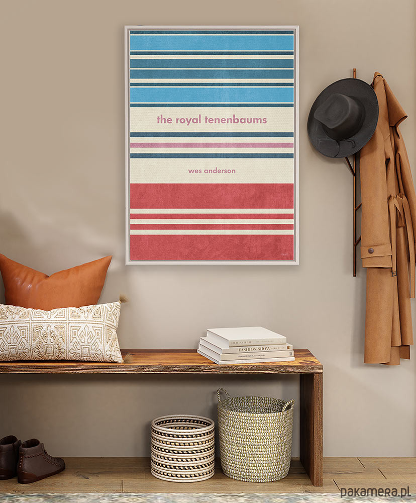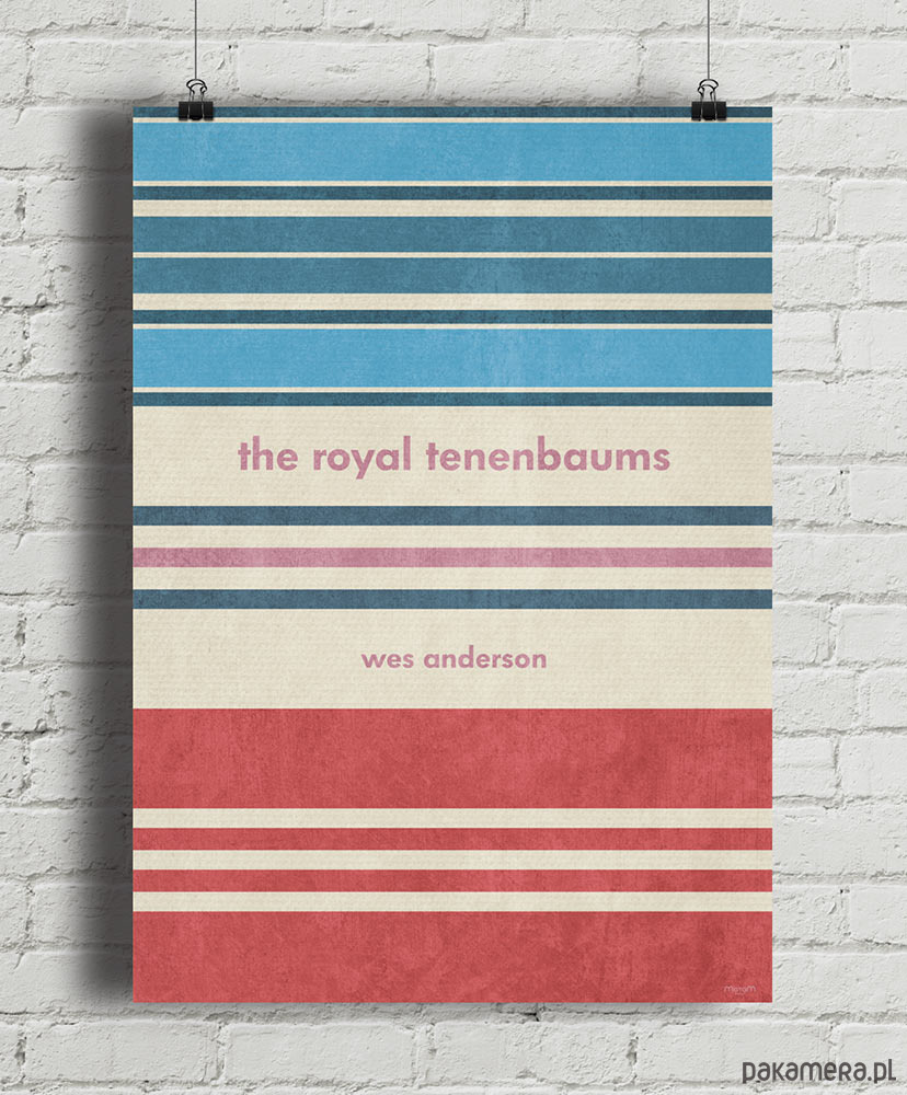 Plakat z autorską grafiką inspirowany filmem Genialny Klan (The Royal Tenenbaums), reż. Wes Anderson. Grafika stanowi wzorzysty kolaż nawiązujący do trzech głównych postaci w filmie. Całość tworzy symetryczny, kolorowy retro wzór.