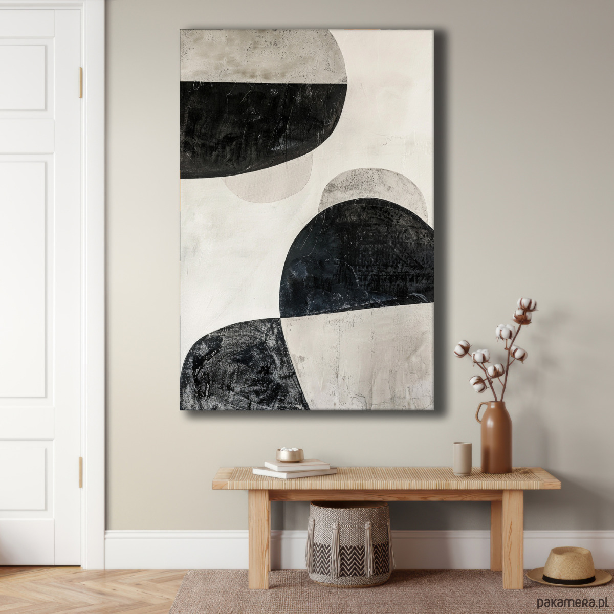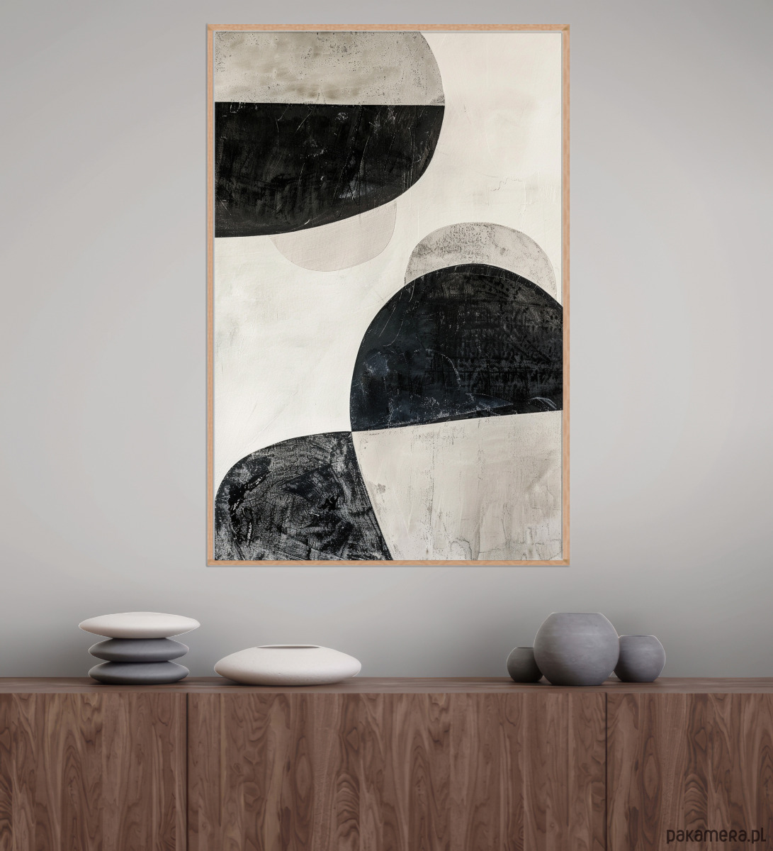 Seria obrazów inspirowanych minimalizmem i symetrycznym balansem, w której miękkie, zaokrąglone formy i wyraziste graficzne kształty tworzą warstwową kompozycję. Złożone abstrakcyjne układy kontrastują ze sobą, nawiązując do techniki druku holotone i dodając głębi dzięki ziemistym teksturom. Każdy obraz w serii balansuje pomiędzy czernią a bielą, czerpiąc inspirację z naturalnych pejzaży i stylu artysty Jon’a Klassen’a, co nadaje pracom harmonijny, ale złożony charakter.