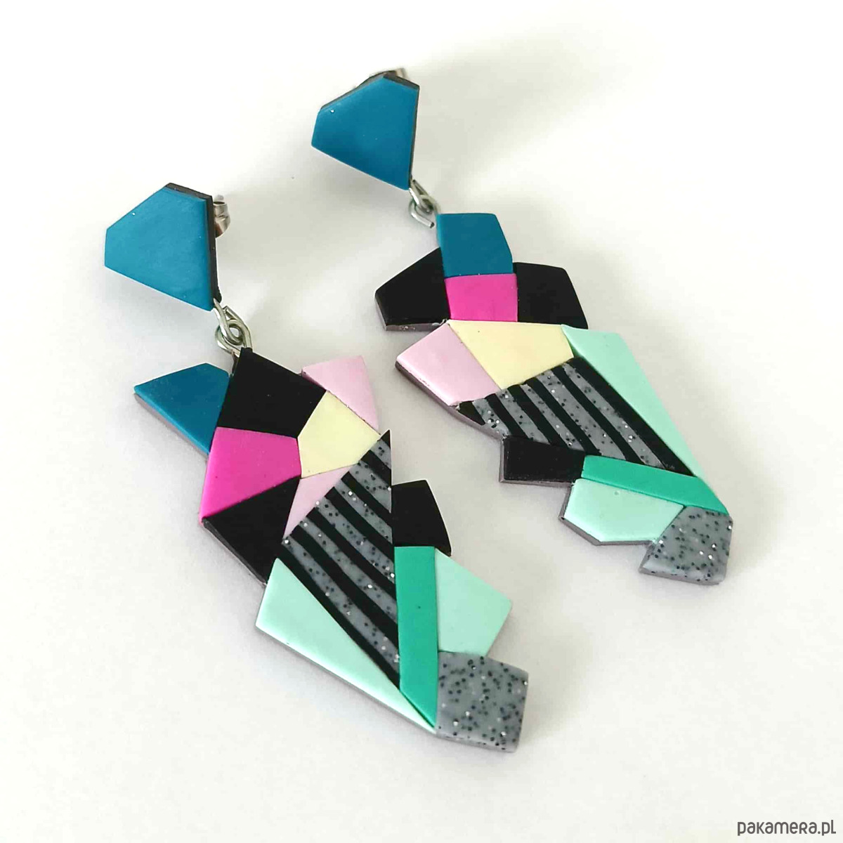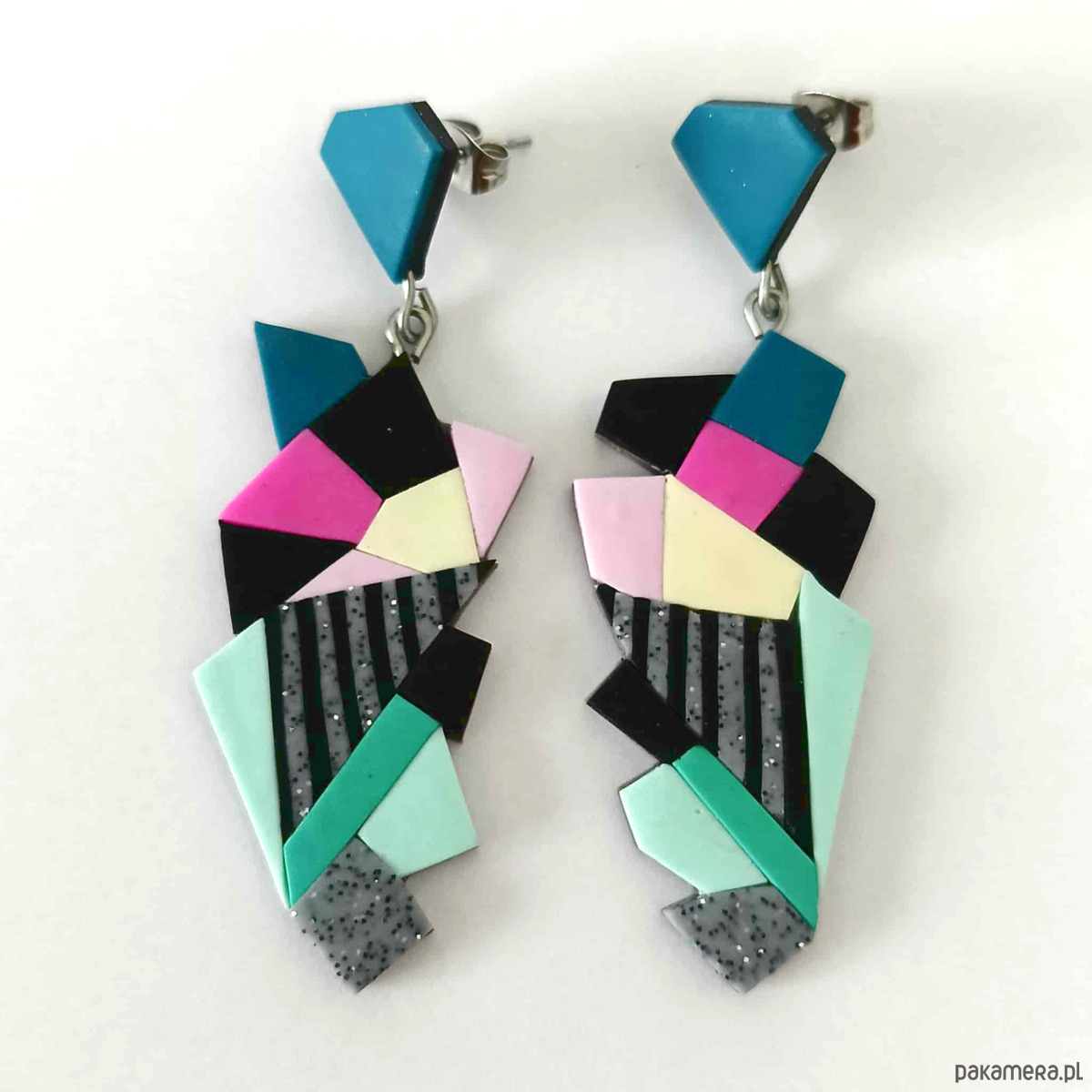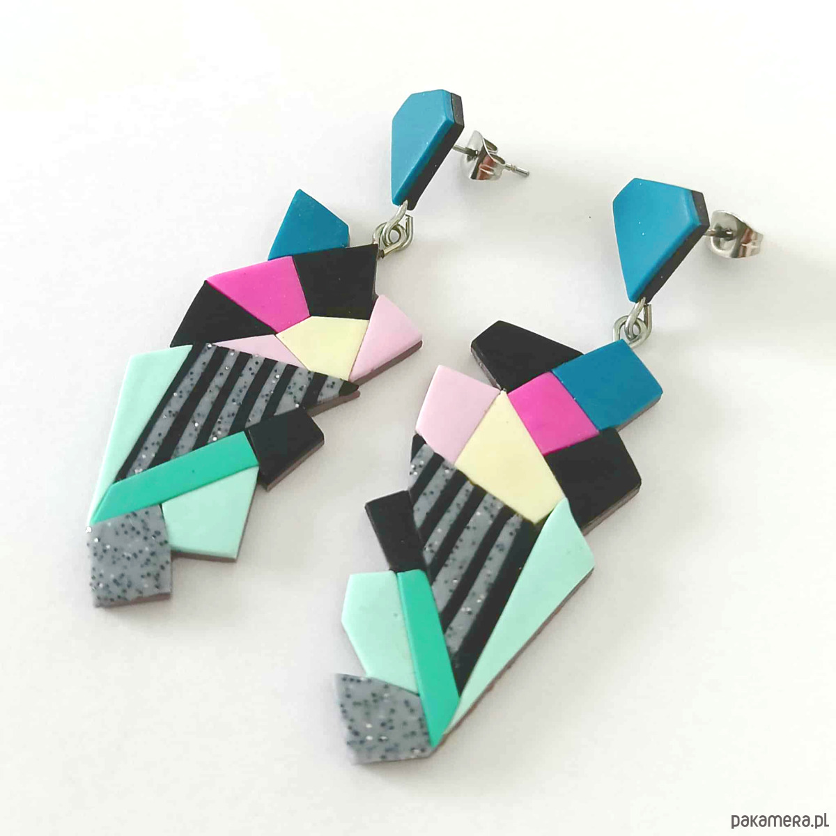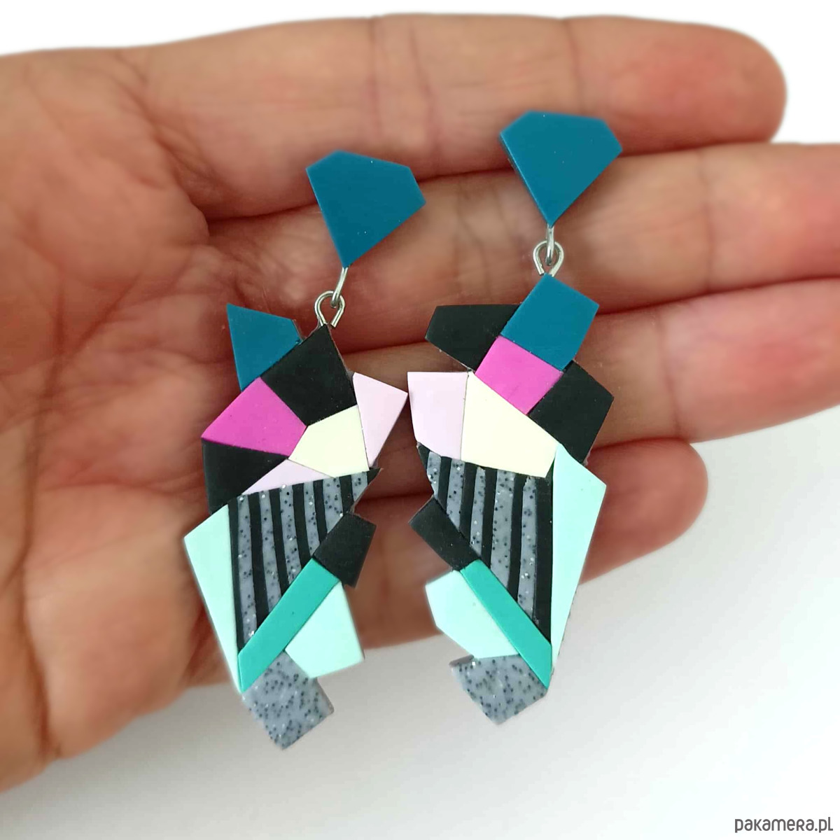 Ręcznie wykonane kolczyki z masy polimerowej w geometrycznym stylu. Połączenie turkusu, mięty, różu i czerni z kontrastowym wzorem w paski sprawia, że to biżuteria pełna charakteru i nowoczesnego wyrazu. Są lekkie, wygodne w noszeniu i niepowtarzalne – idealne dla osób, które lubią wyróżniać się oryginalnymi dodatkami. Sprawdzą się zarówno na co dzień, jak i jako odważny akcent do wieczorowej stylizacji.