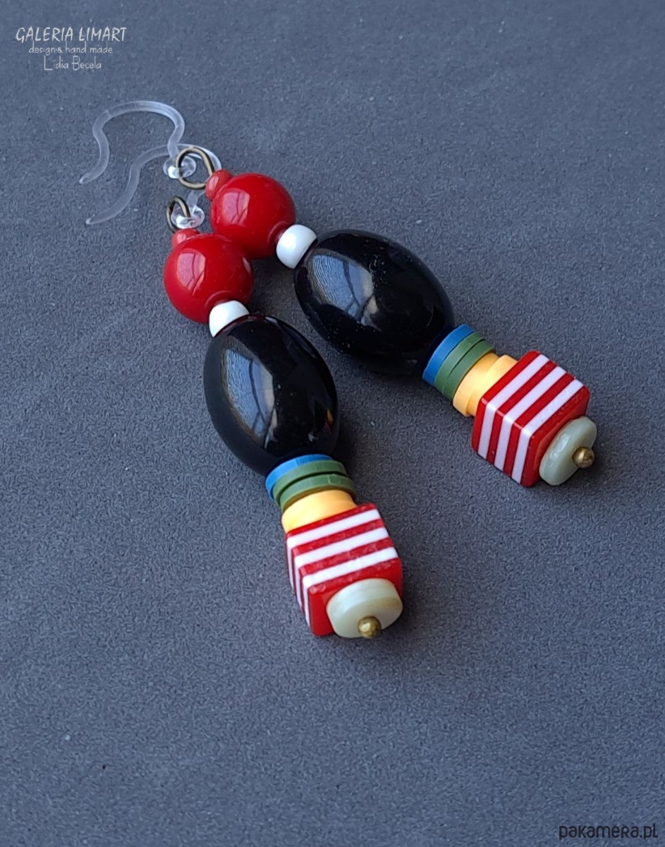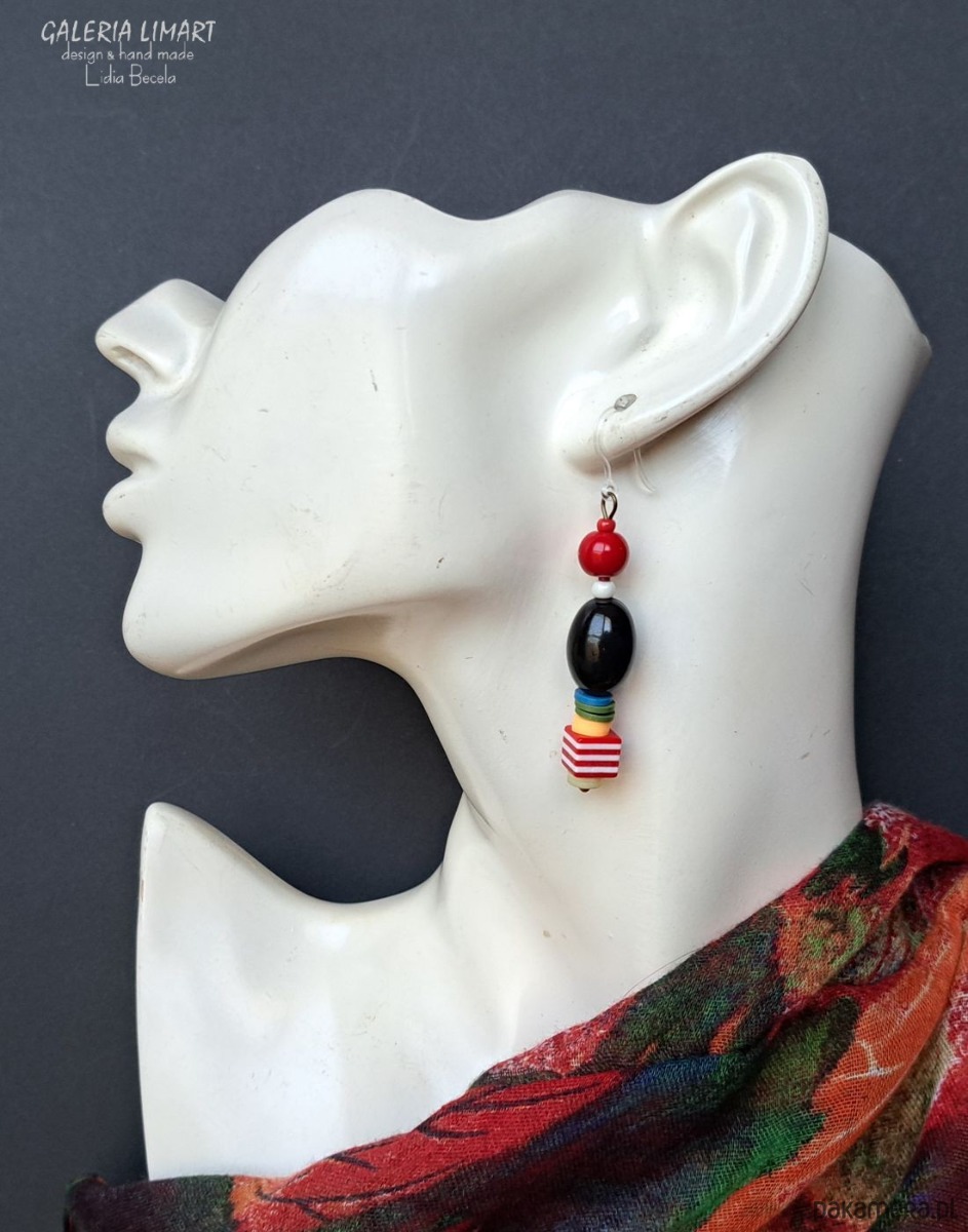 Bardzo efektowne długie spektakularne i modne kolczyki z żywicy, akrylu i szkła. Kolczyki utrzymane w bardzo modnym stylu bohemy artystycznej - BOHO. inspiracją do ich powstania była twórczość Friedensreicha Hundertwassera. Fantastyczne wręcz bajkowe łączenie kolorów i kształtów było motywem przewodnim w jego twórczości. A te geometryczne kolorowe kolczyki zdecydowanie przykują uwagę, dodatkowo zostały zawieszone, a innowacyjnych antyalergicznych biglach z silikonu.