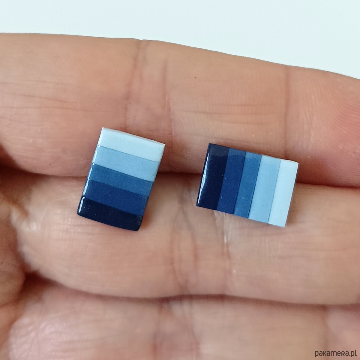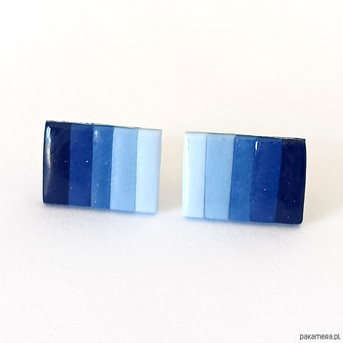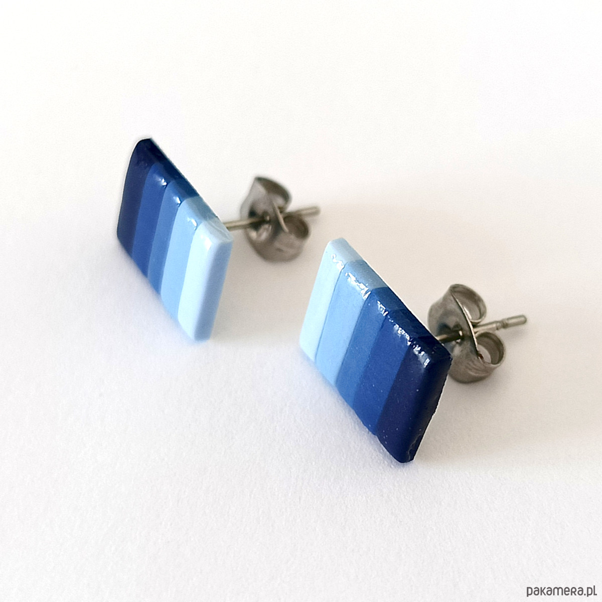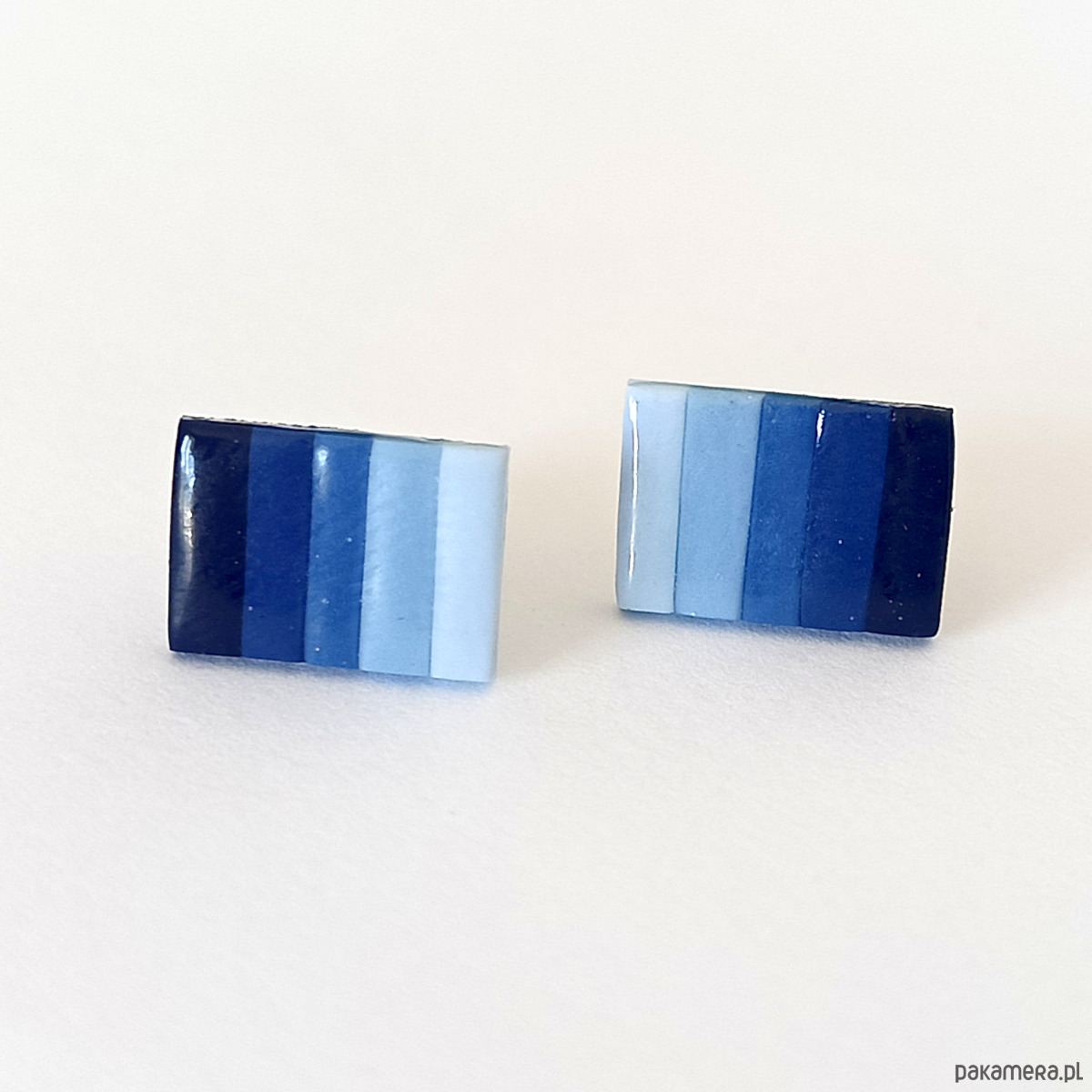 Ręcznie robione kolczyki sztyfty w kształcie prostokątów, wykonane z glinki polimerowej w chłodnej niebieskiej kolorystyce. Geometryczny i nowoczesny design sprawia, że są idealnym dodatkiem do codziennych oraz minimalistycznych stylizacji. Pokryte połyskującą warstwą zabezpieczającą, są lekkie i wygodne w noszeniu. Doskonały pomysł na prezent dla niej lub nastolatki ceniącej unikalną, ręcznie wykonaną biżuterię.