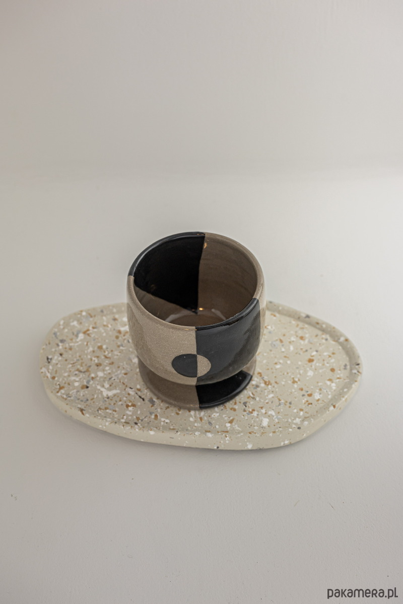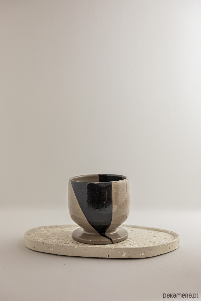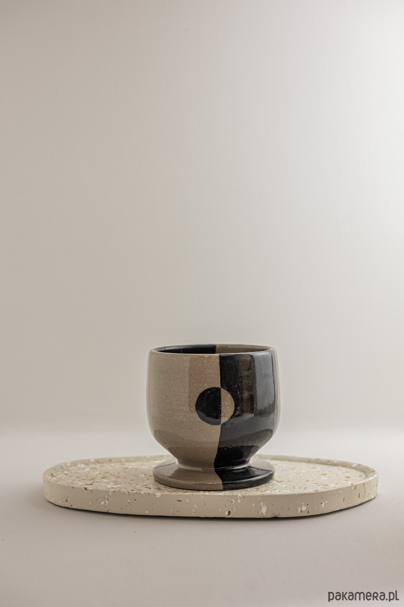 Ceramiczny kieliszek do wina na niskiej nóżce łączy w sobie nowoczesny design i elegancję. Jego powierzchnię zdobi geometryczny wzór, który nadaje mu charakteru. Kieliszek został wykonany na kole garncarskim z piegowatej gliny, pomalowany czarną farbką i pokryty bezbarwnym szkliwem.
