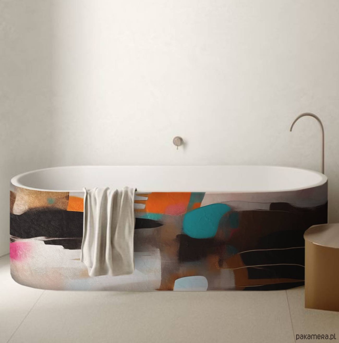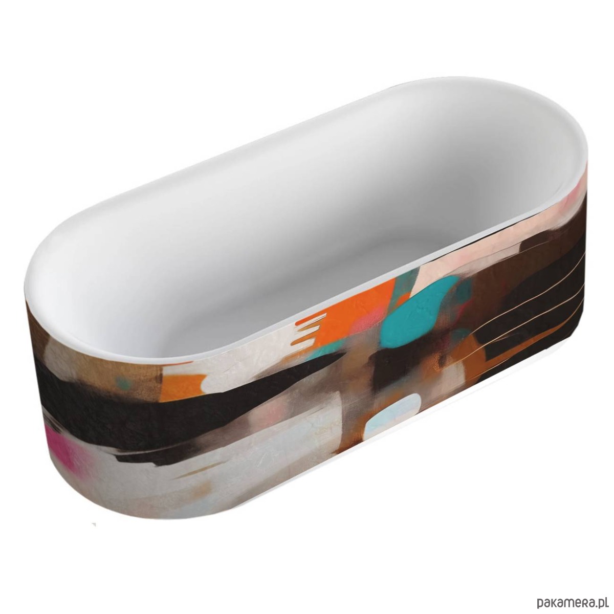 Nietypowa artystyczna kolorowa wanna wolnostojąca owalna z artystycznym wykończeniem z ceramiki żywicznej.
