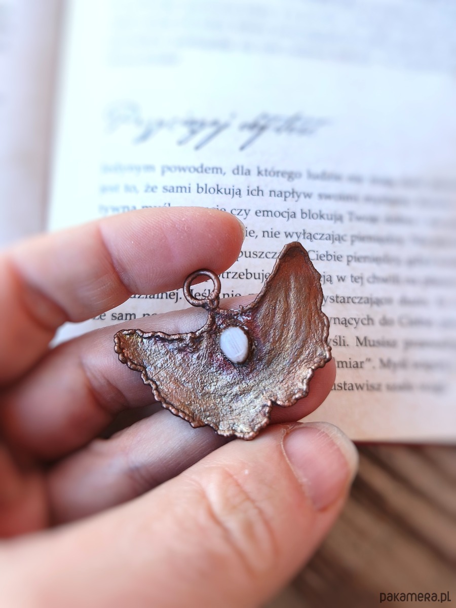 materiał: miedź, naturalny liść miłorzębu (Ginkgo biloba), kamień księżycowy