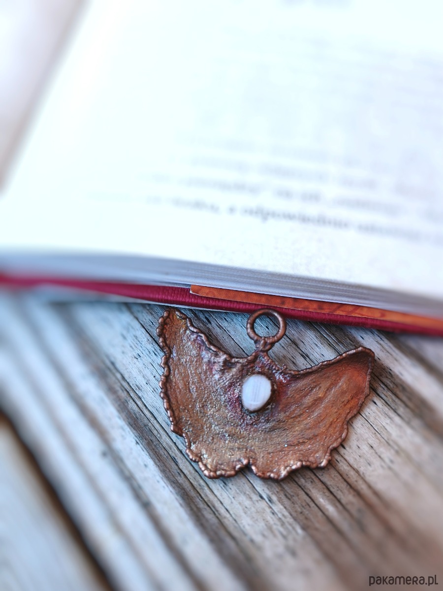 Delikatne żyłkowanie liścia zostało wiernie zachowane i tworzy na powierzchni hipnotyzujący rysunek natury. Ciepły, złotawy blask miedzi pięknie kontrastuje z niewielkim kamieniem księżycowym w kształcie łezki, który dodaje całości subtelności i tajemniczego światła.