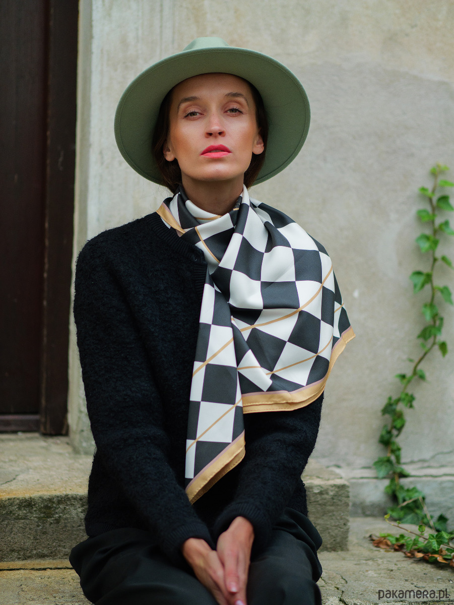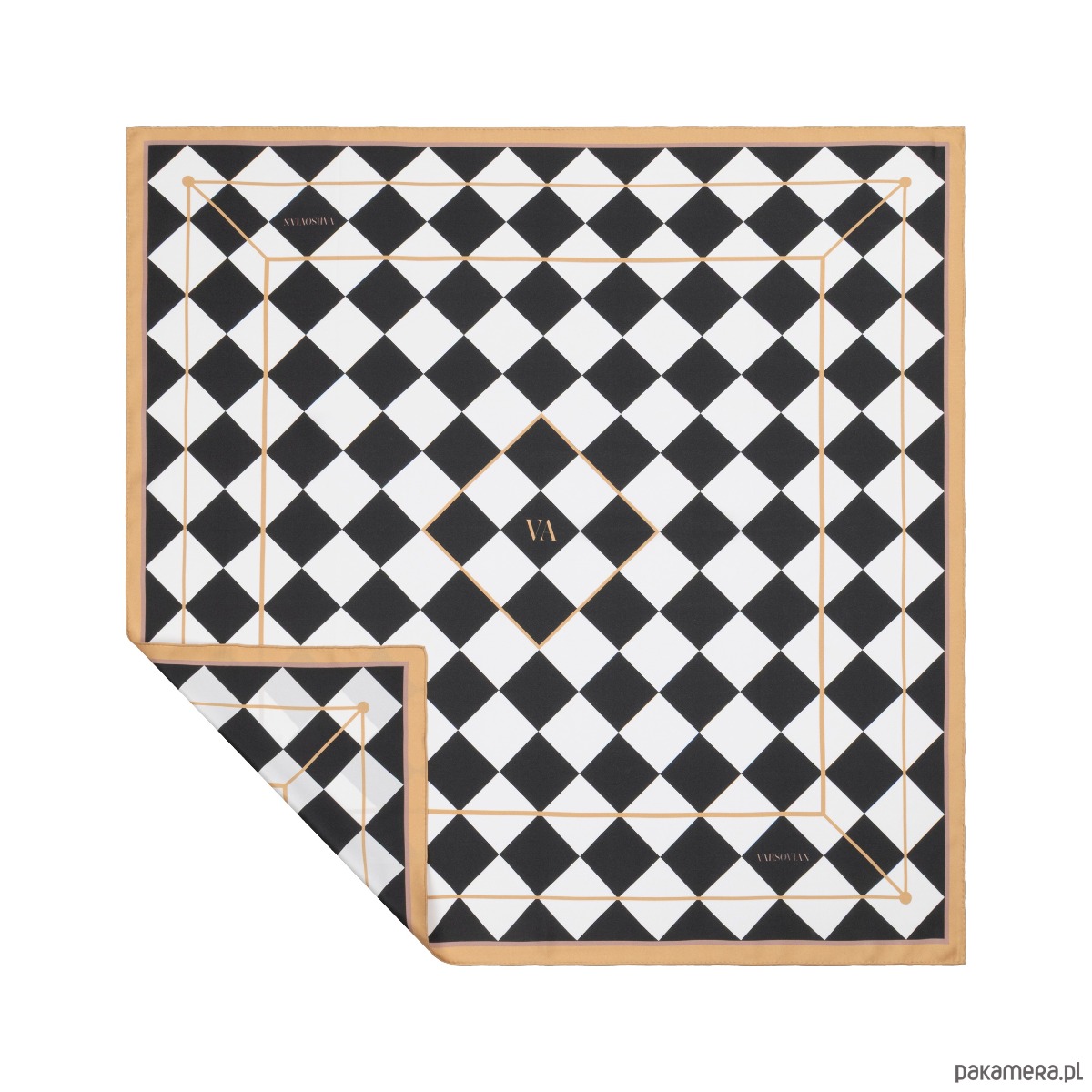„Giorno e Notte” to apaszka, która celebruje balans między światłem a cieniem – dziennym blaskiem i nocnym spokojem. Jej graficzny wzór, inspirowany motywem klasycznych czarno-białych marmurowych posadzek, w nowoczesnym ujęciu staje się wyrazem elegancji i harmonii. W centrum kompozycji znajduje się subtelny monogram VA, zamknięty w złotej geometrii. Kompozycję dopełniają precyzyjne linie oraz detale w beżowo-złotym odcieniu.