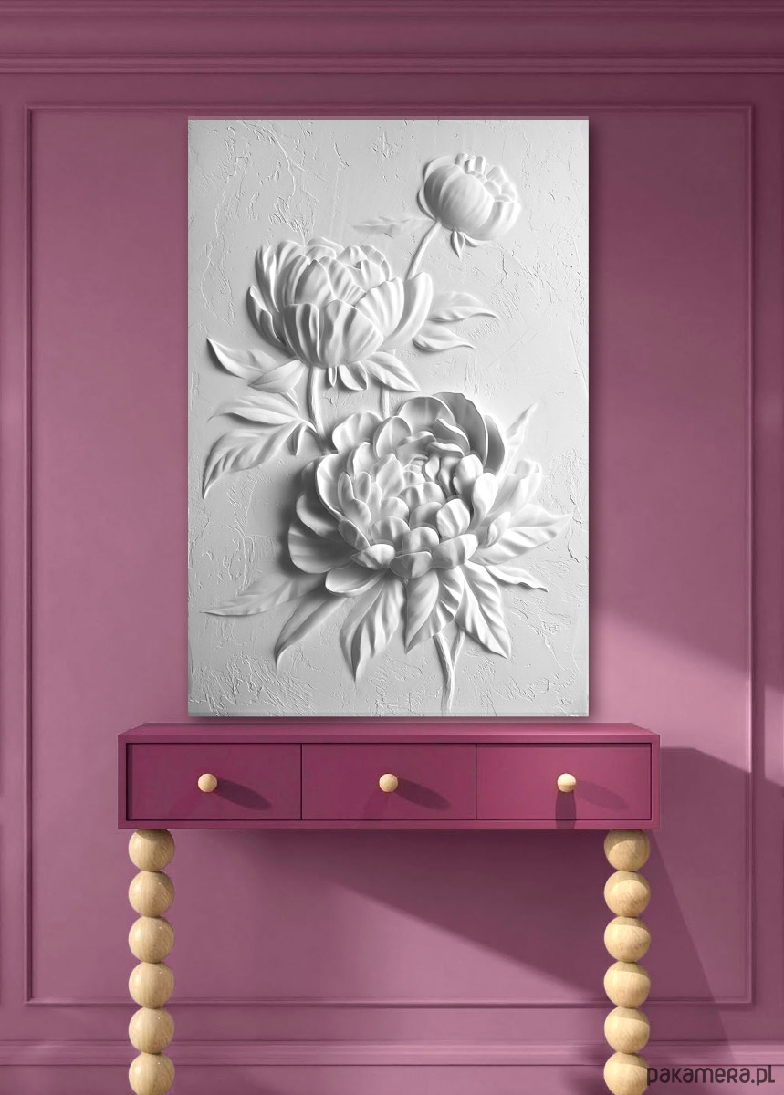 Strukturalny obraz żyje światłem i cieniem, dlatego w ciągu dnia zmienia swój charakter. Przy światłe dziennym wygląda inaczej, niż przy oświetleniu sztucznym. Ścienna dekoracja Piwonii wprowadza do wnętrza spokój, naturalność i subtelną elegancję. To sztuka, która staje się częścią codziennej przestrzeni. Płaskorzeźba zdobi jak wnętrze Twojego domu, tak i instytucji, bura, hotelu, butiku czy apartamentów.