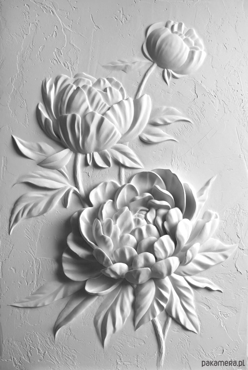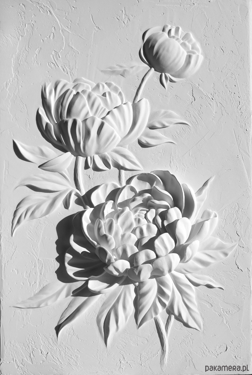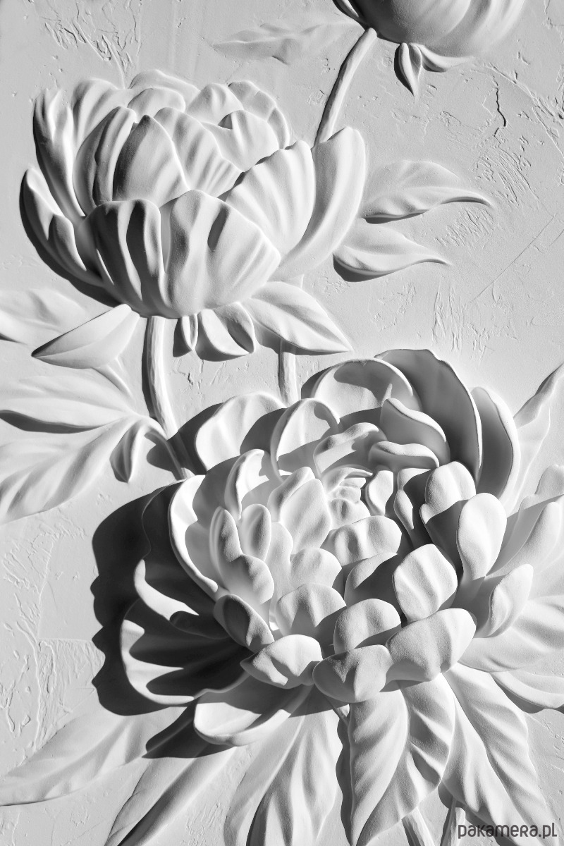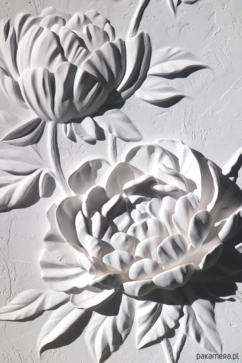 Po wielu eksperymentach i poszukiwaniach powstała nowa długo oczekiwana płaskorzeźba - Piwonii. Ten strukturalny obraz jest próbą znalezienia równowagi między ciężarem gipsu a delikatnością falujących płatków. Chciałam zatrzymać moment rozkwitu - tę krótką chwilę, kiedy kwiat jest najpiękniejszy.