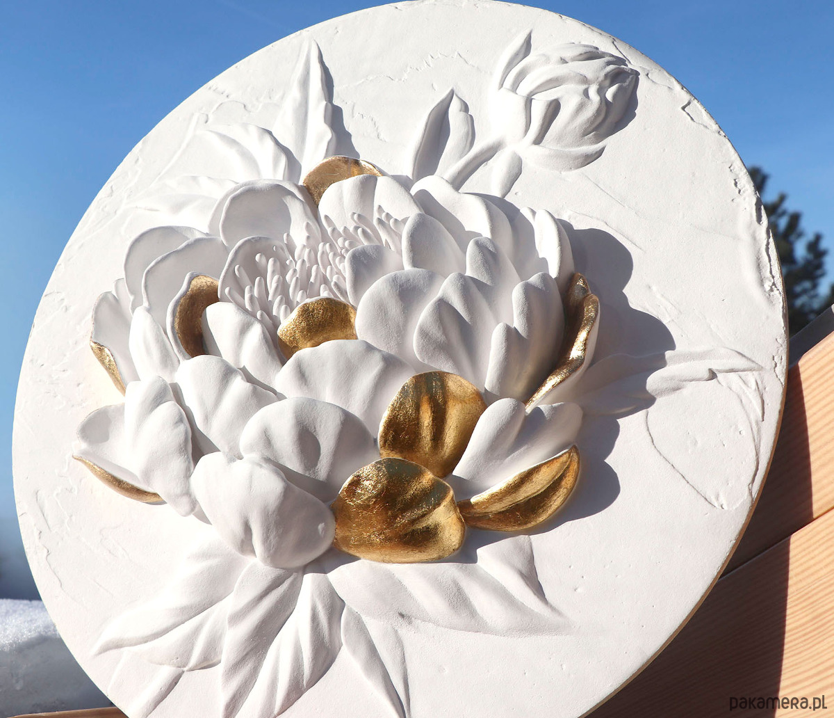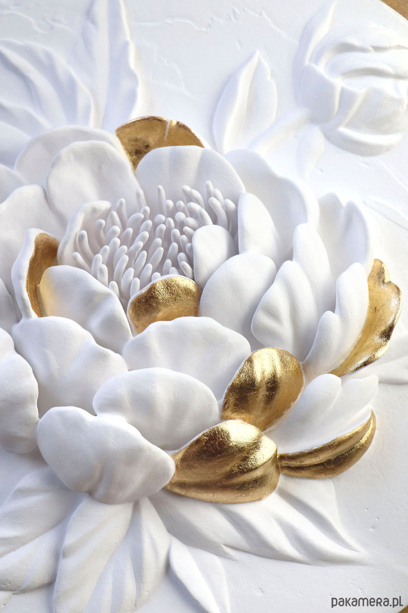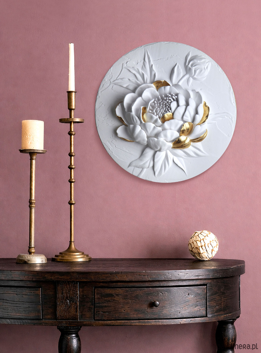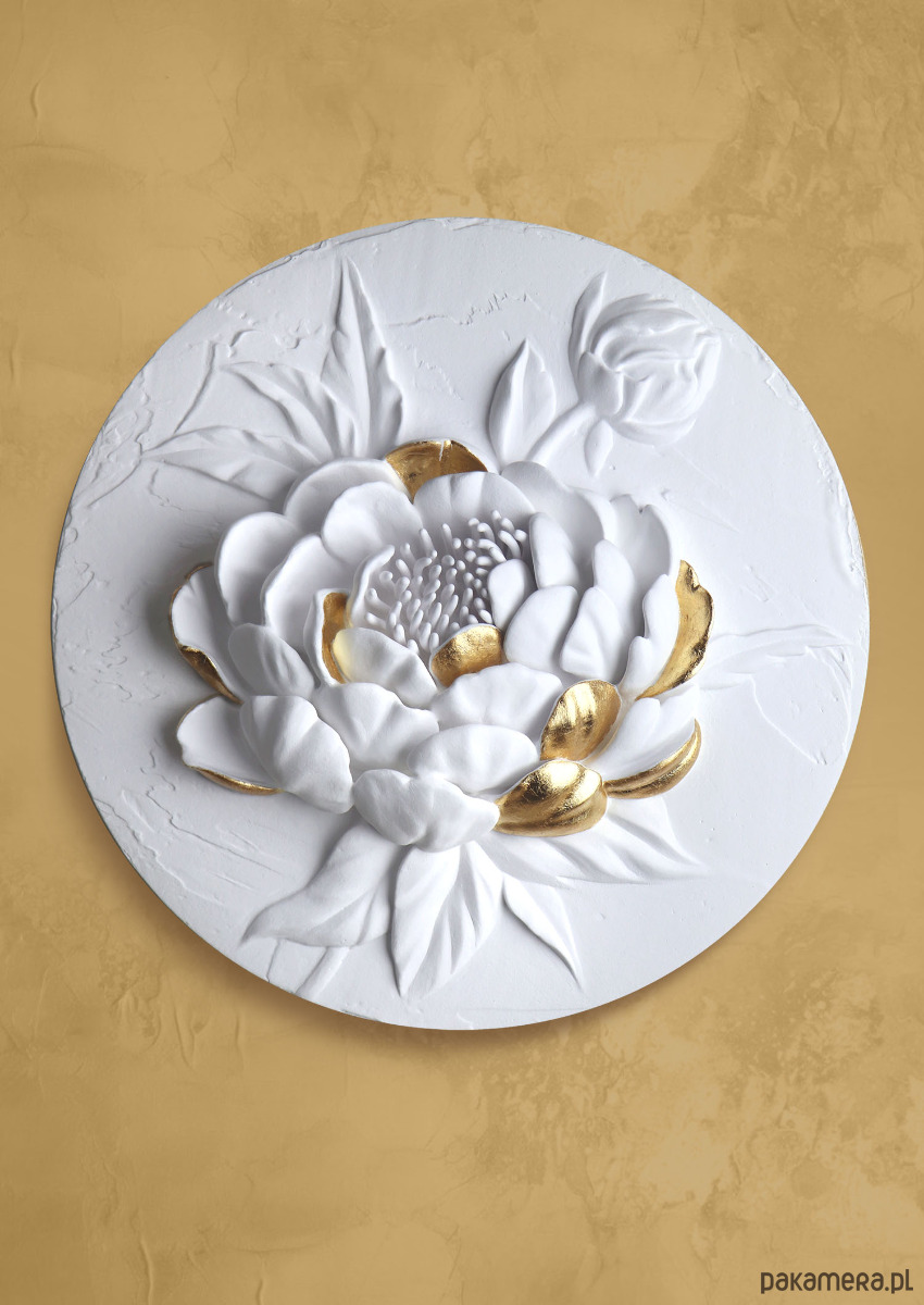 Płaskorzeźba Piwonia - efekt poszukiwań, eksperymentów i pragnienia uchwycenia ulotnego piękna kwiatu w trwałym materiale. Każdy płatek kwiatu na obrazie wykonany ręcznie. Zastosowałam złocenie wybranych fragmentów, aby podkreślić formę i dodać kompozycji wyrazistych akcentów. Moje prace funkcjonują na pograniczu obrazu i rzeźby. W zależności od pory dnia i oświetlenia relief układa się inaczej. Strukturalny obraz wprowadza do wnętrza trójwymiarowość, subtelną grę światła, doda wyjątkowego charakteru. Gipsowa dekoracja Piwonia doskonale ozdobi przestrzeń, tworząc atmosferę elegancji i harmonii.