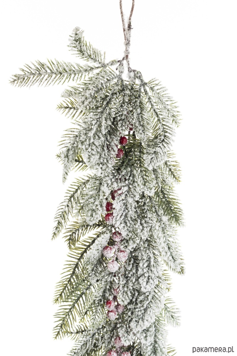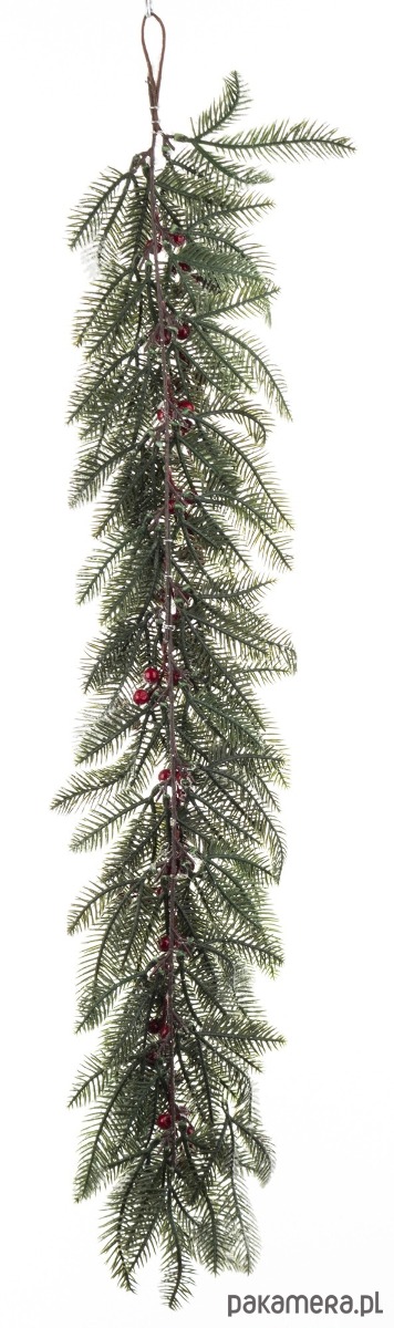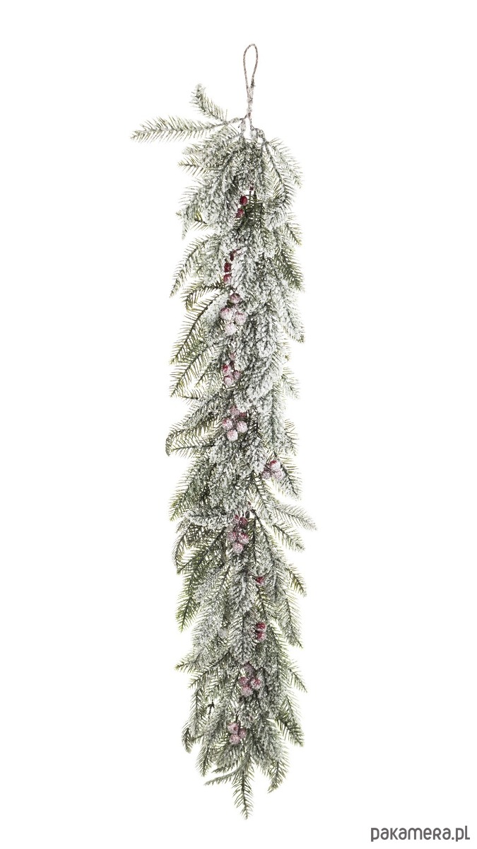 Dekoracyjna girlanda, elegancka, oprószona dużą ilością sztucznego śniegu. Wykonana z tworzywa sztucznego. Czerwone owocki umieszczone między gałązkami urozmaicają girlandę.