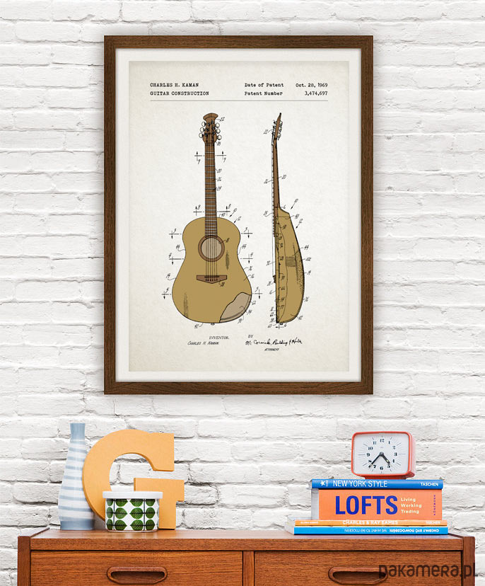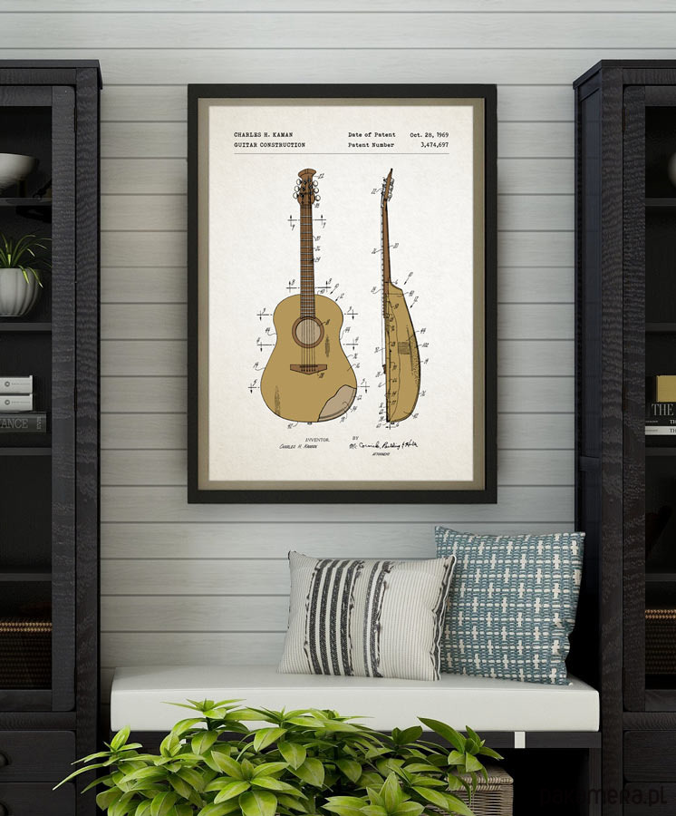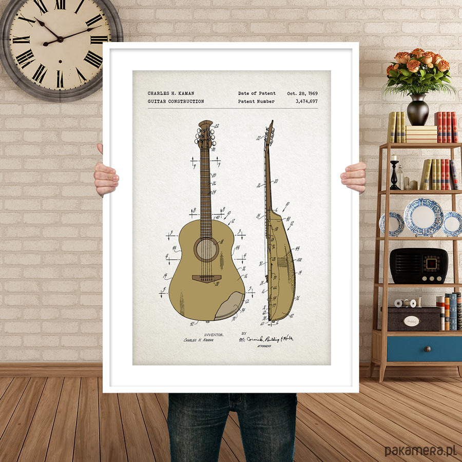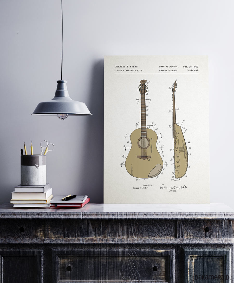 Plakat z reprodukcją patentu na konstrukcję gitary, autorstwa Charlesa M. Kamana. Patent o numerze 3,474,697 został udzielony w 1869 roku przez Urząd Patentów i Znaków Towarowych Stanów Zjednoczonych.