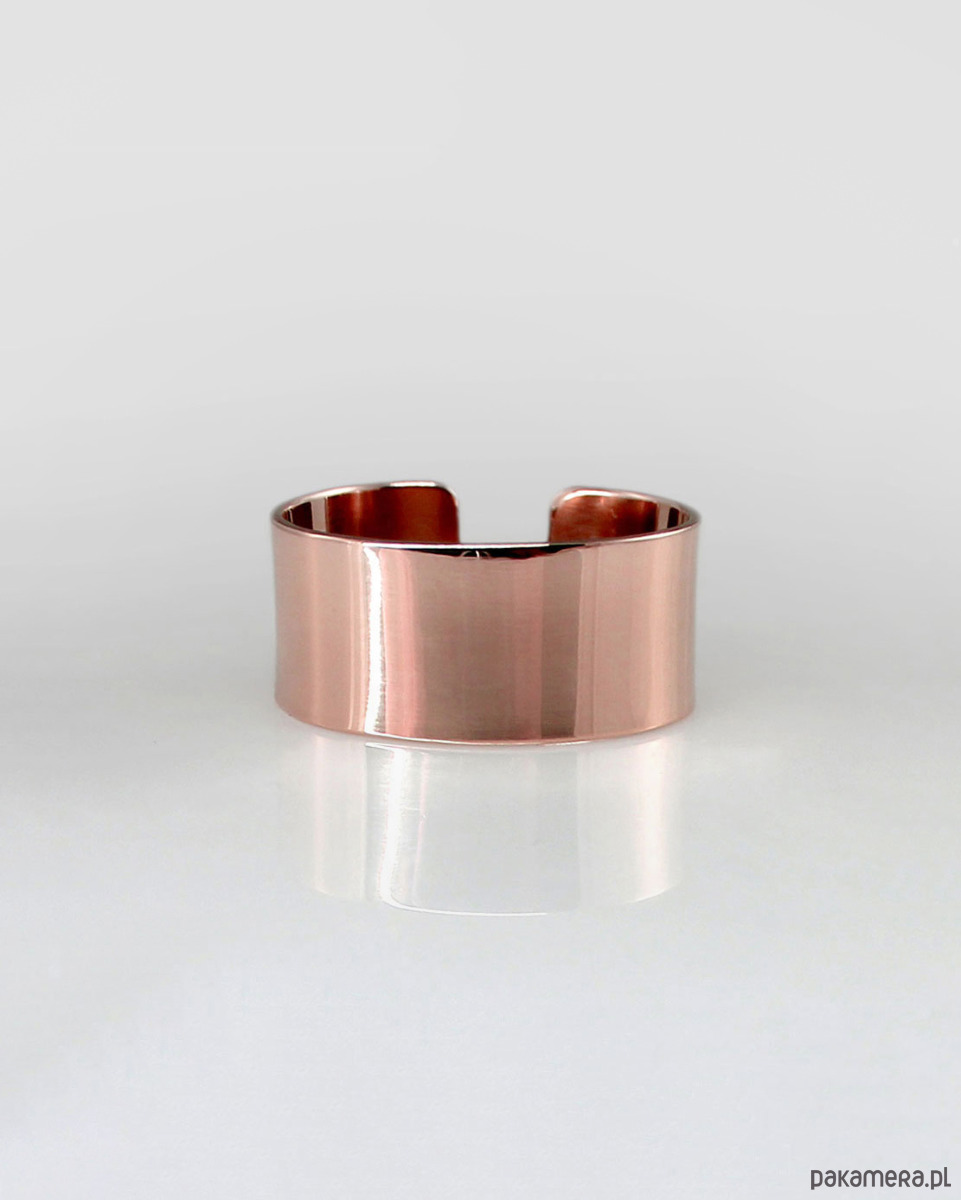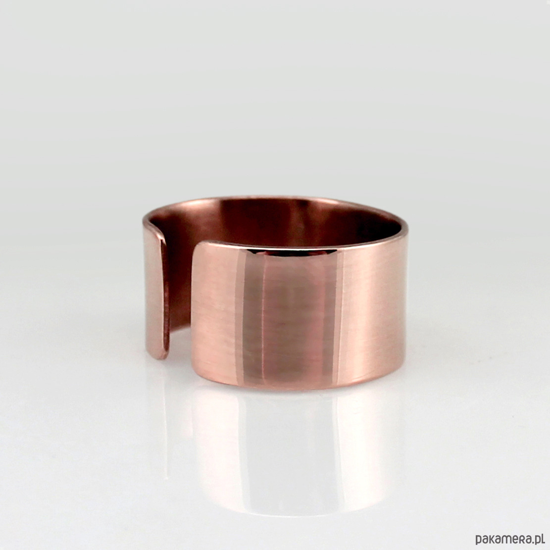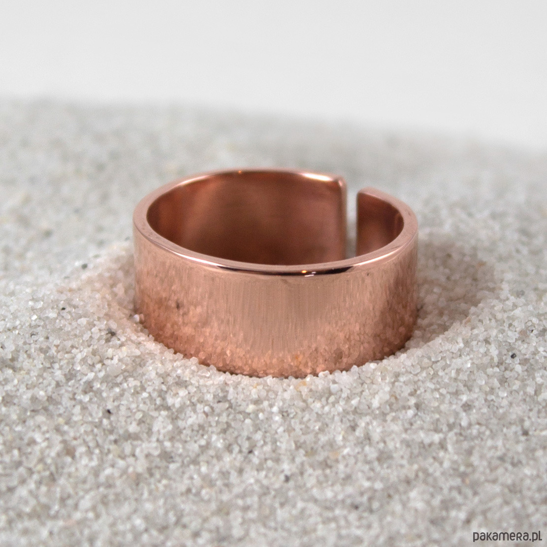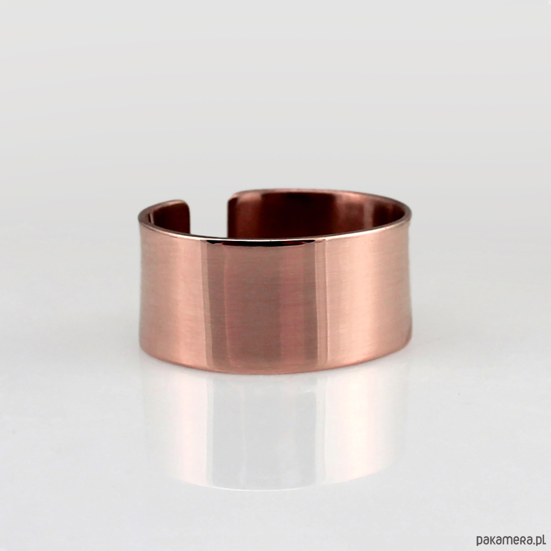 Szeroki miedziany pierścionek o gładkiej fakturze.